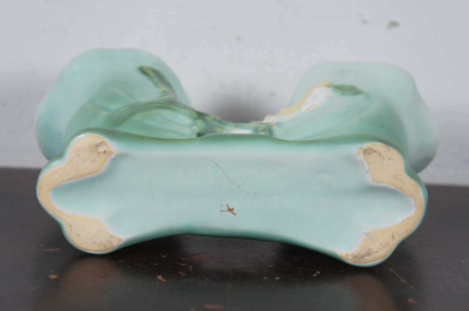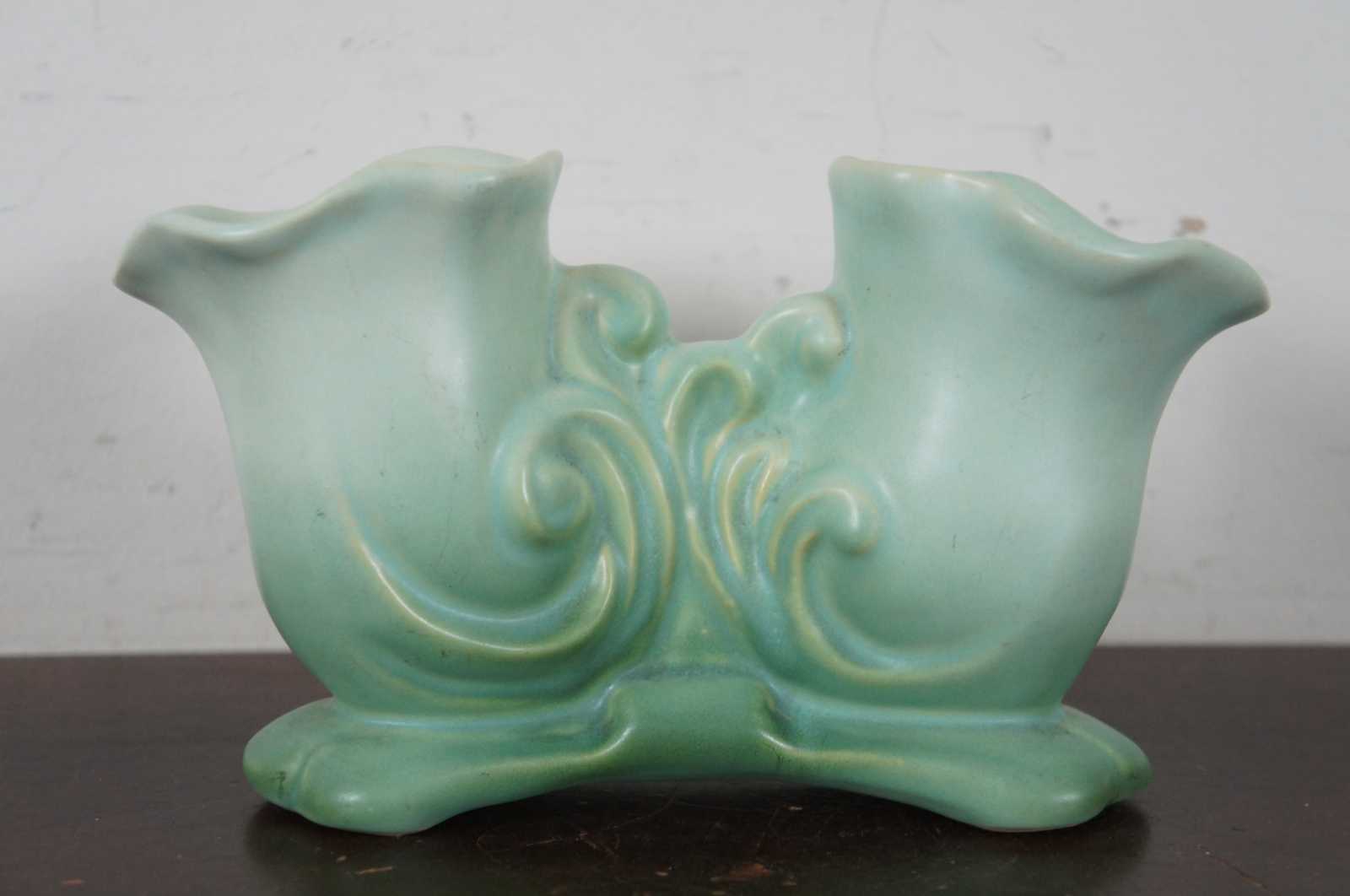 Vintage Weller art pottery ceramic double vase in green with a white and yellow pansy.