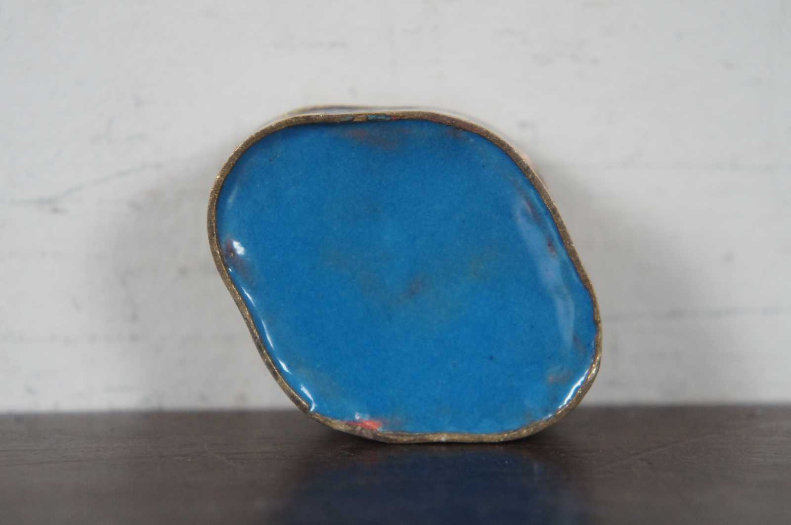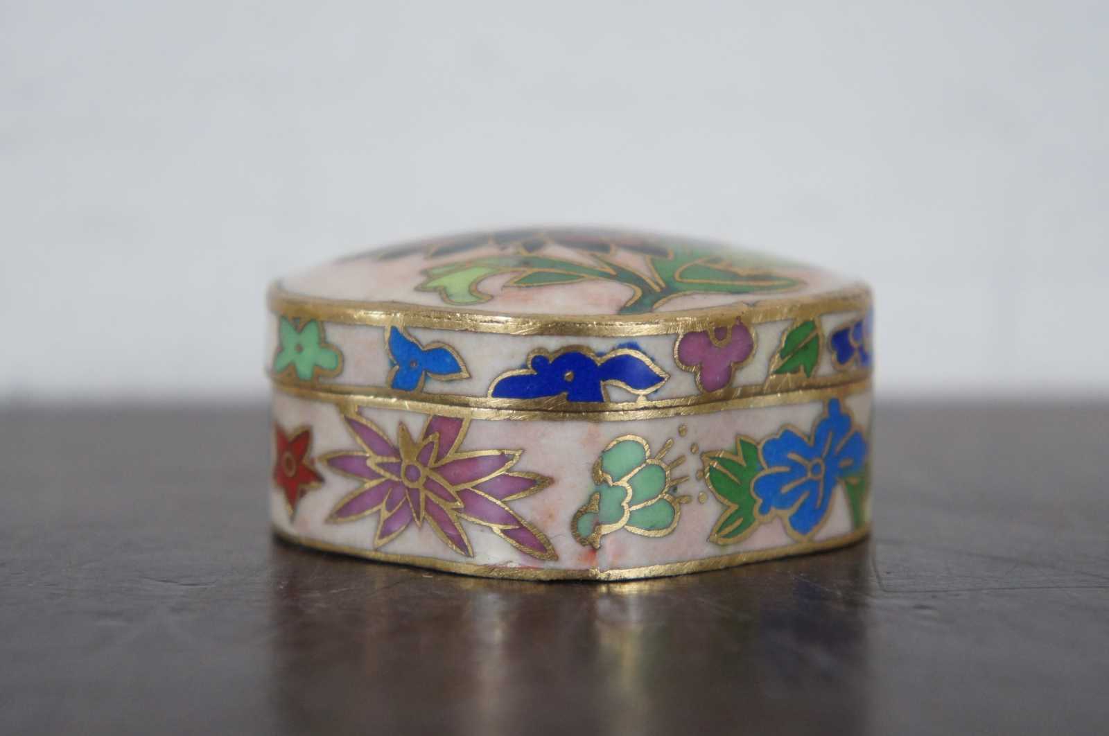 Vintage miniature cloisonne trinket box with flowers on a light pink background and a blue interior.