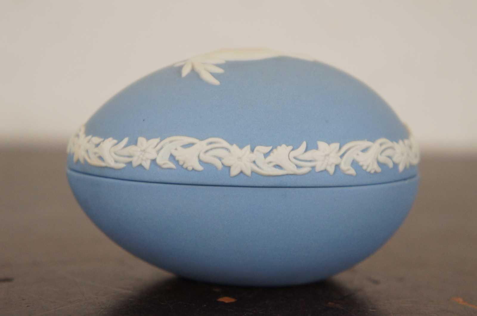 8 Wedgwood Anniversary Eggs. 1977,1979,1980,1981,1982,1983,1985. (7 Blue & 1 Yellow) Made from Porcelain with low relief animal portraits.