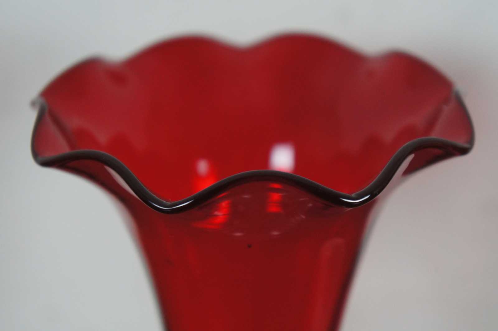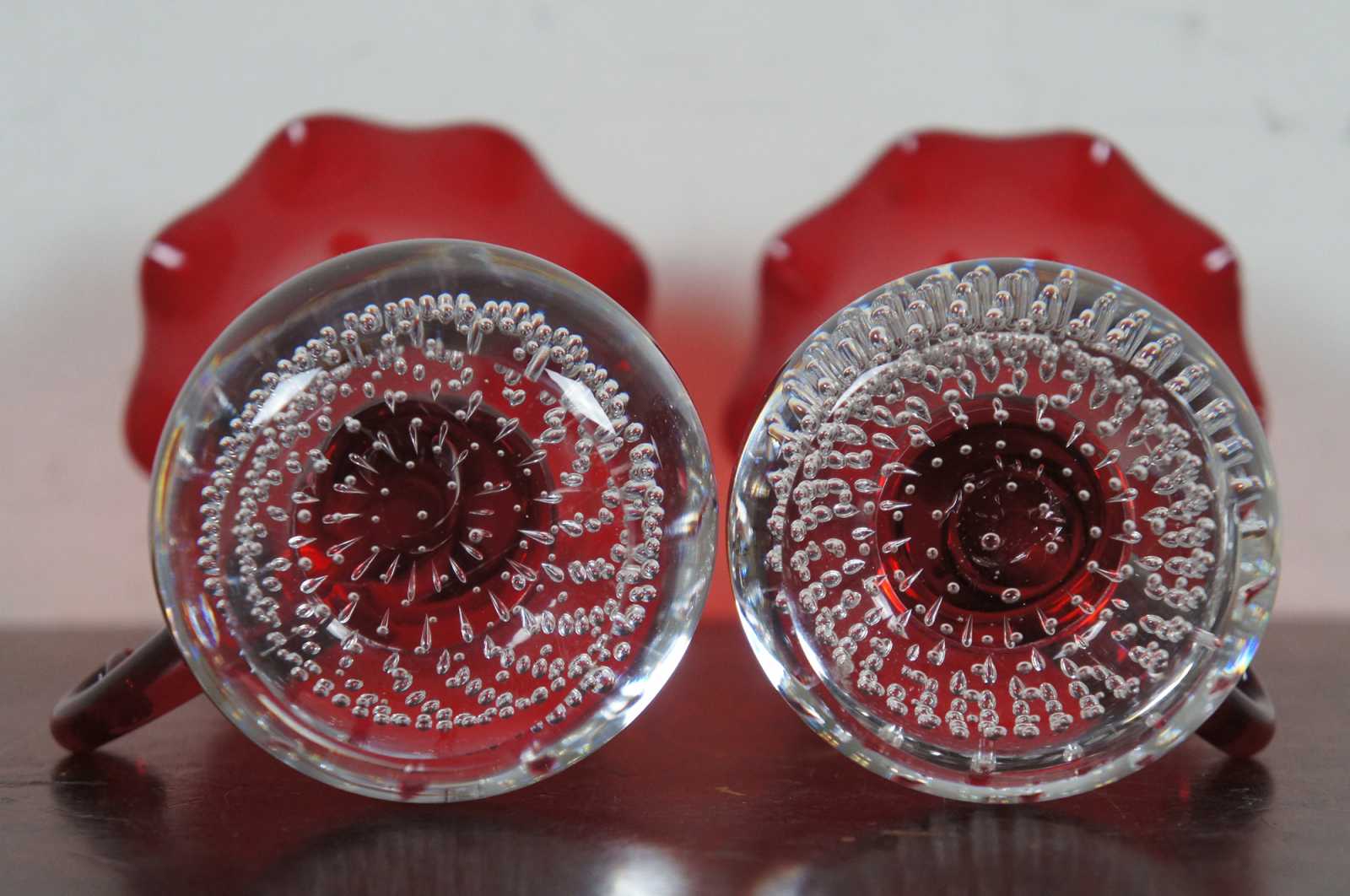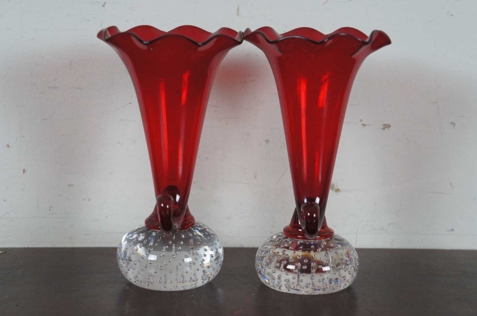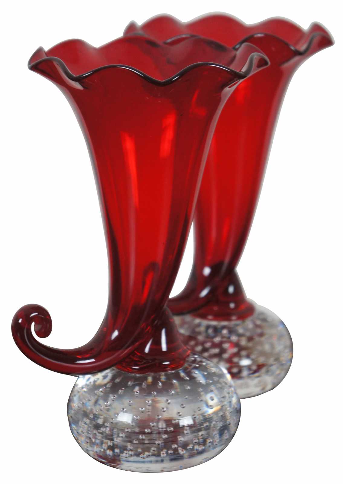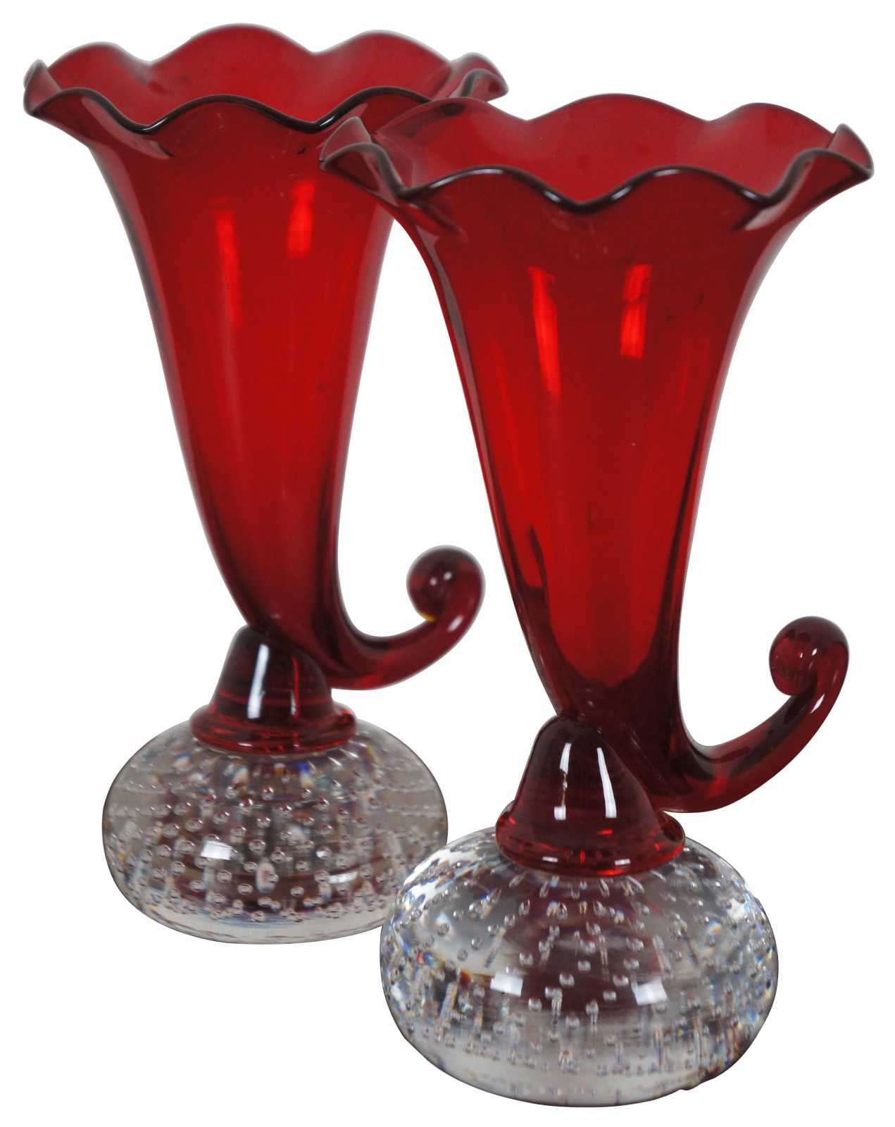 Vintage pair of two ruby glass bud vases. Featuring flared and ruffled Cornucopia design over footed round paperweight style bases with controlled bubble.
