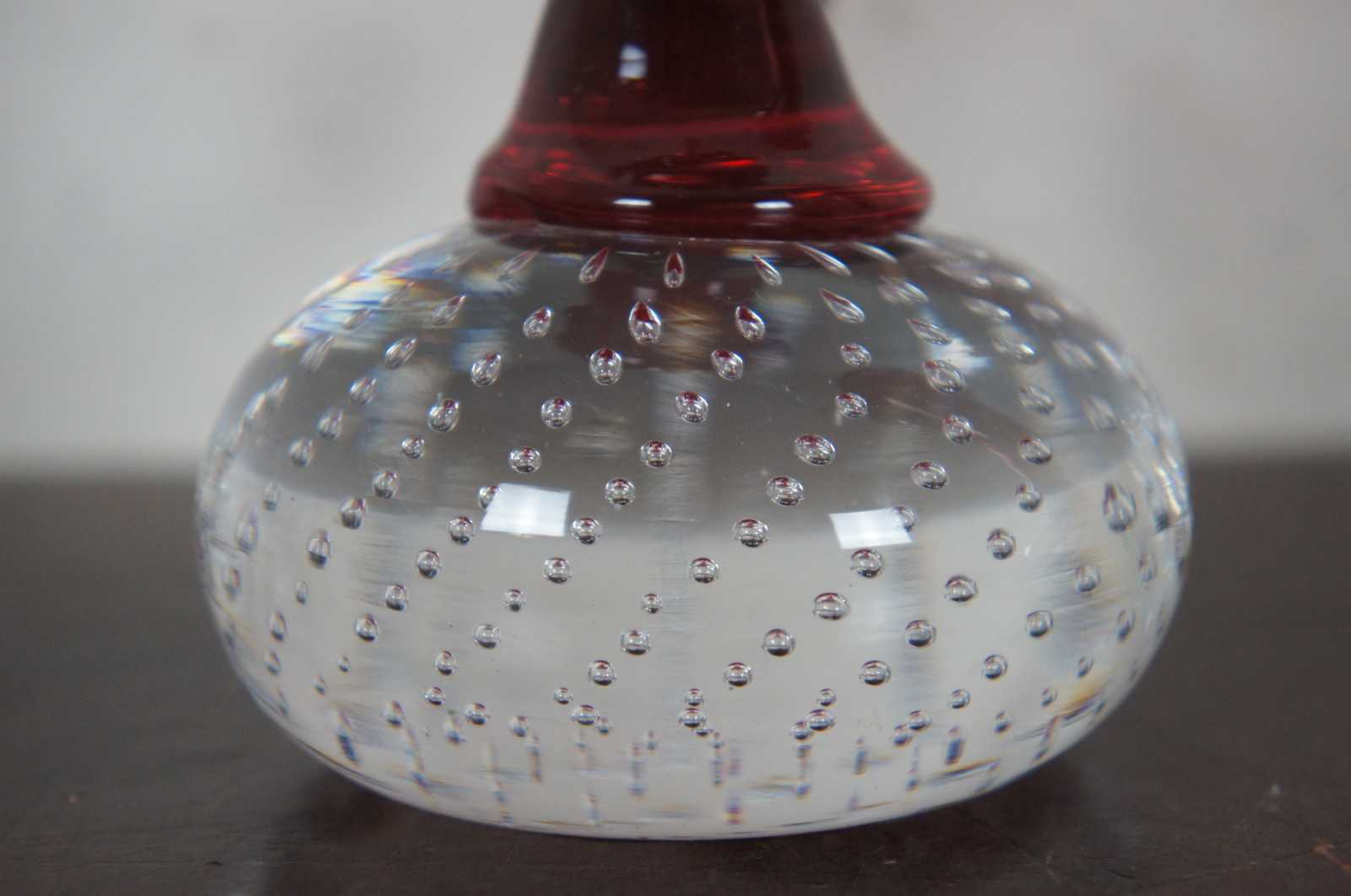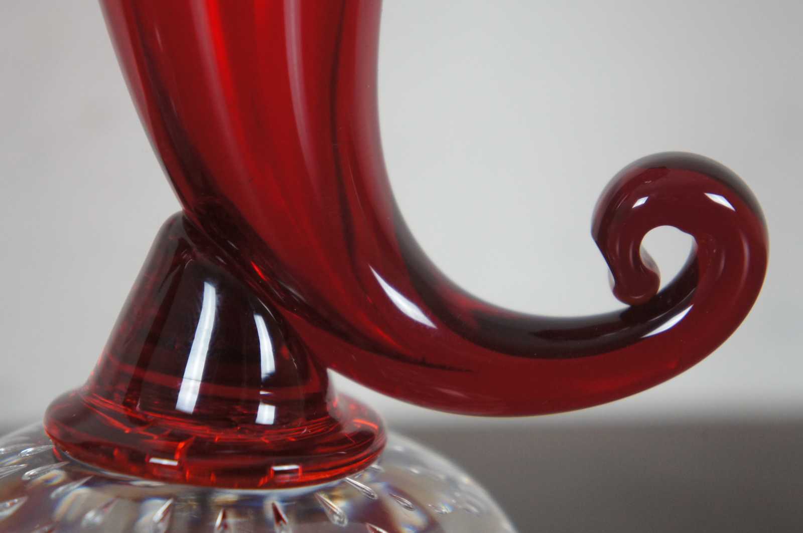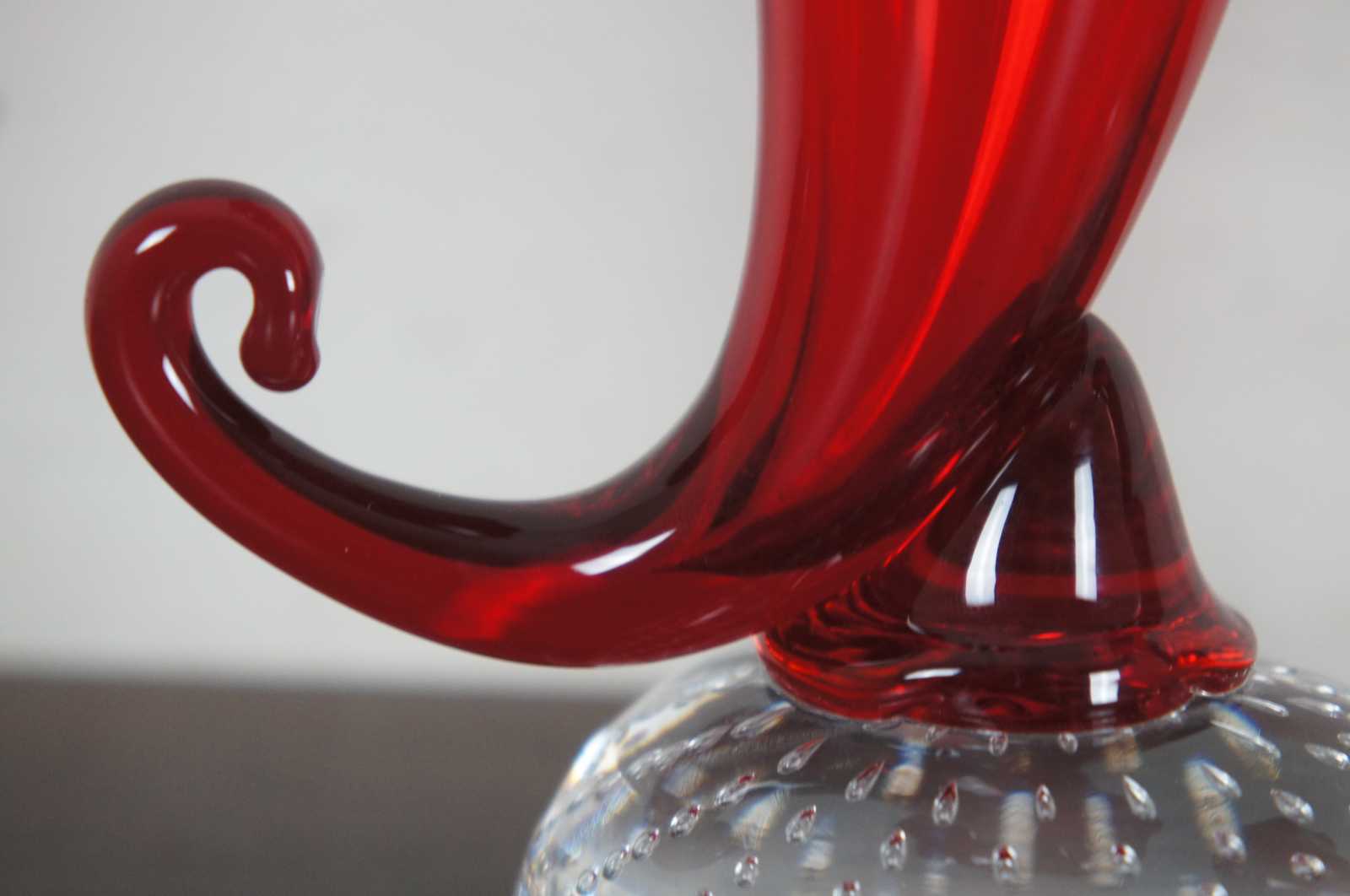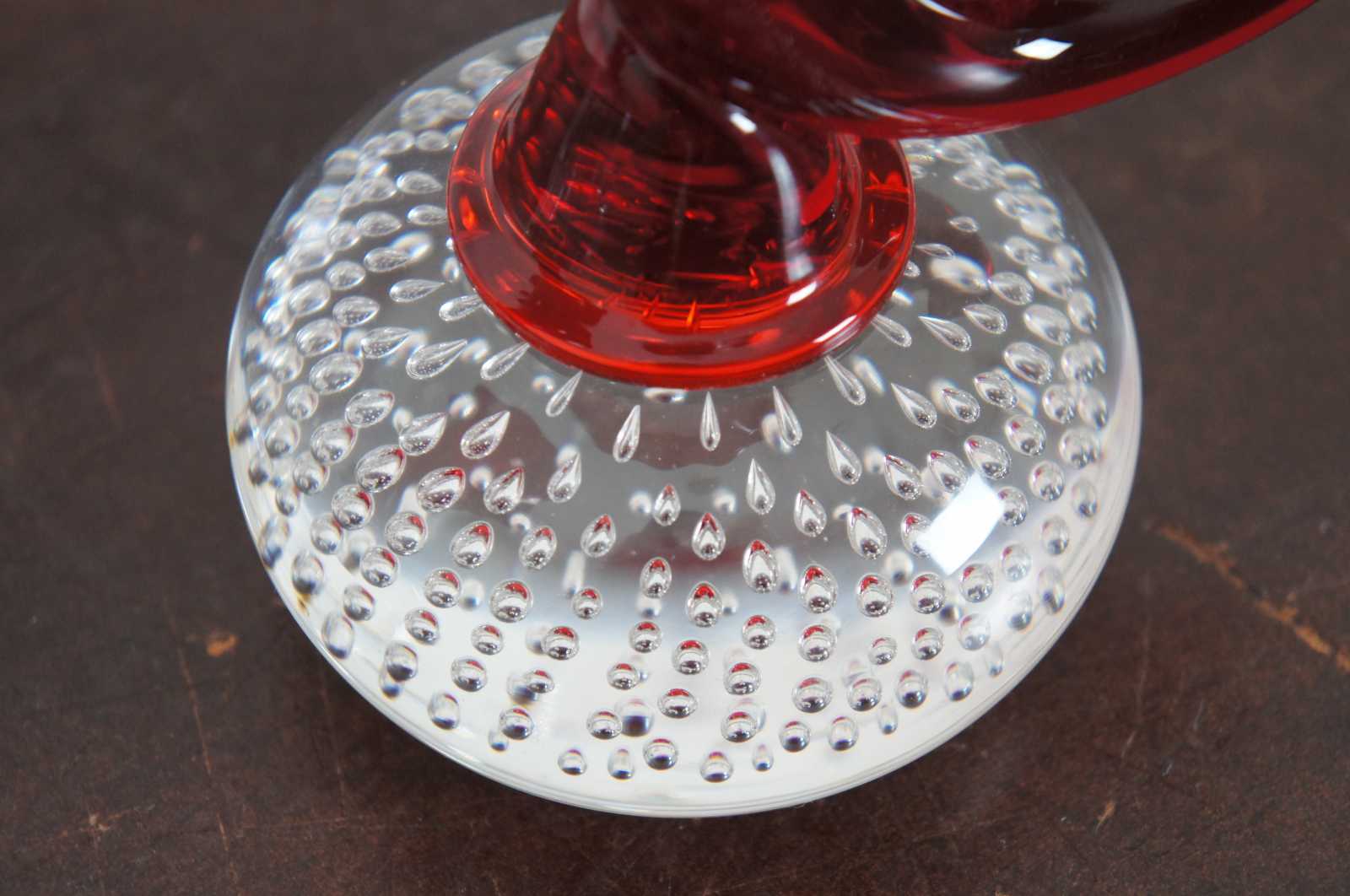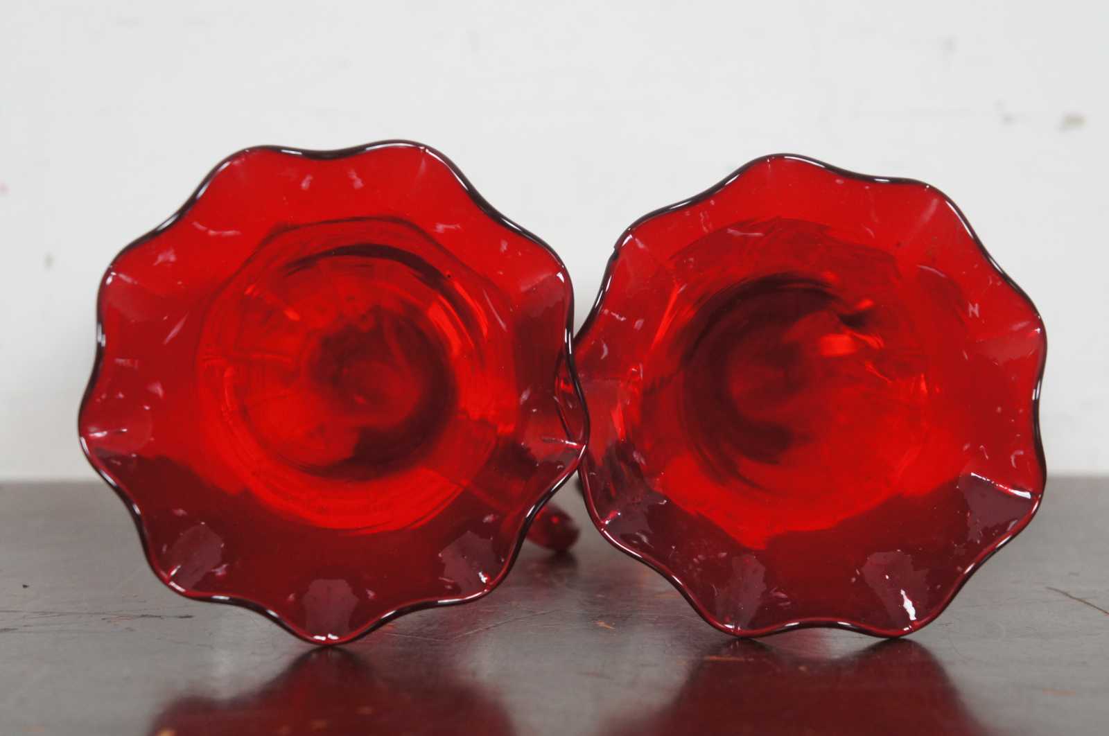 Vintage pair of two ruby glass bud vases. Featuring flared and ruffled Cornucopia design over footed round paperweight style bases with controlled bubble.