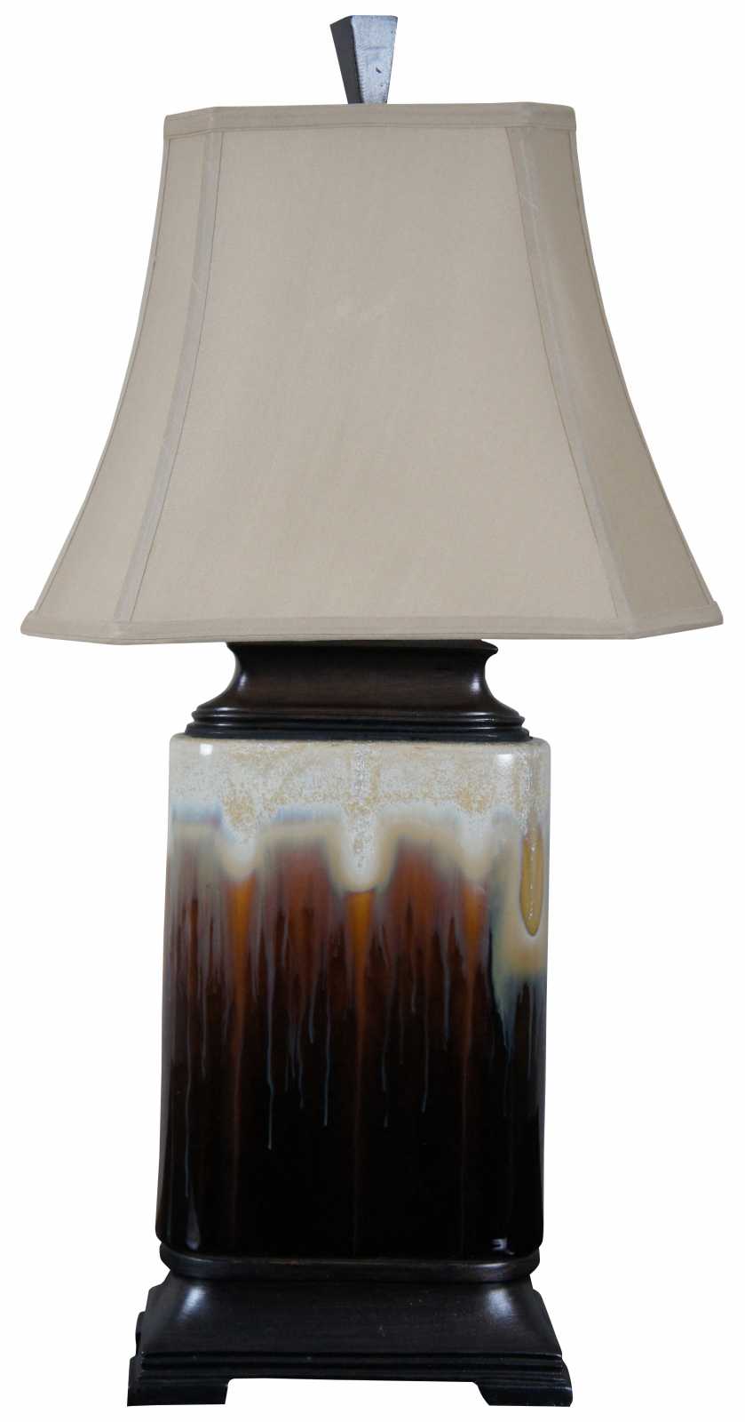 Southwestern style brown and white drip glazed table lamp with wood base and top, likely by StyleCraft. L3-1214