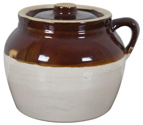 Brown and white Robinson Ransbottom blue crown logo stoneware bean pot with handle and lid.