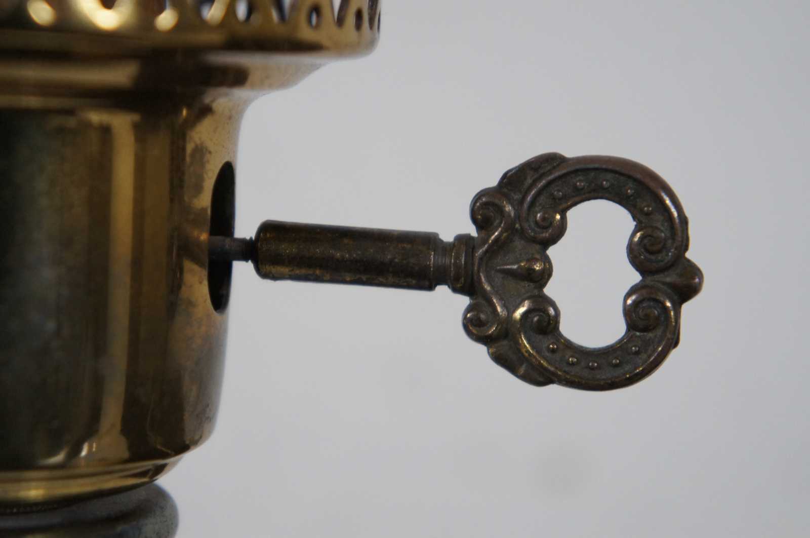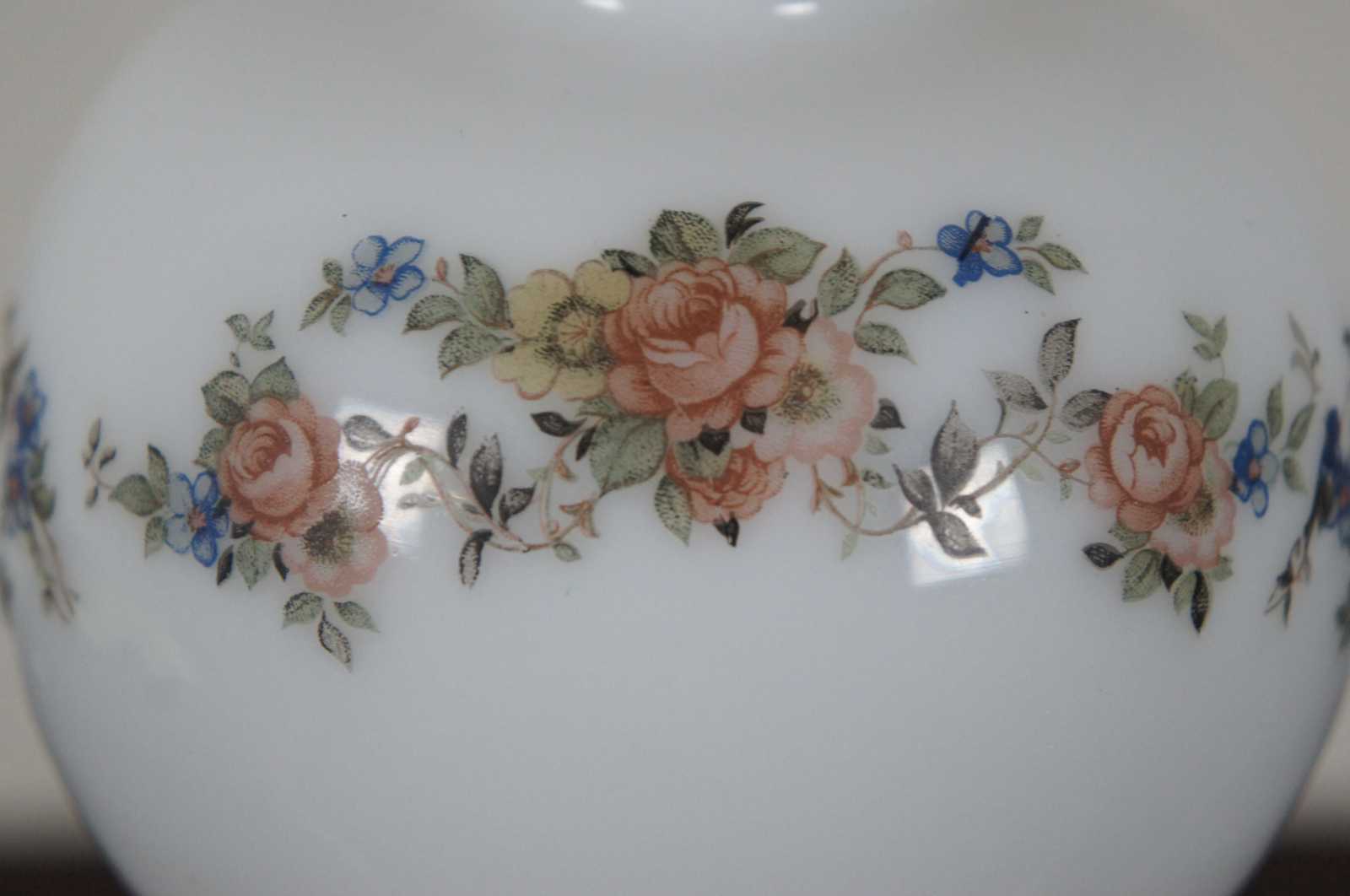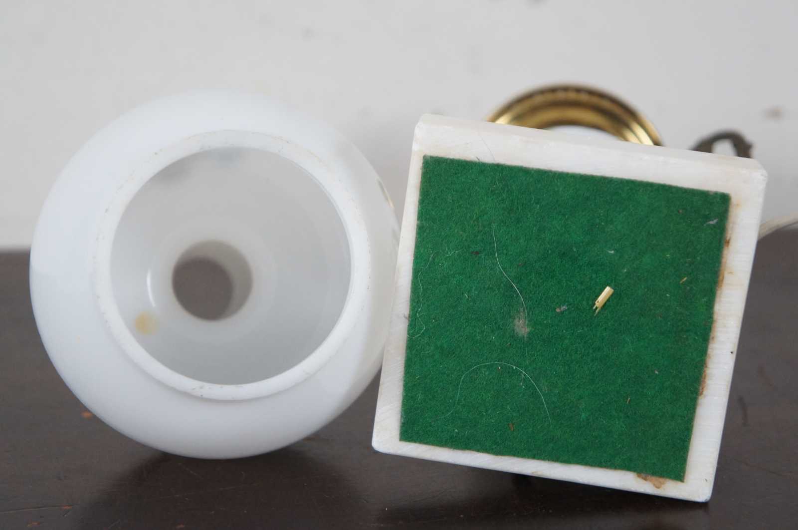 Small Gone with the Wind style budoir lamp, styled like a converted oil lamp with white floral glass hurricane and marble base.