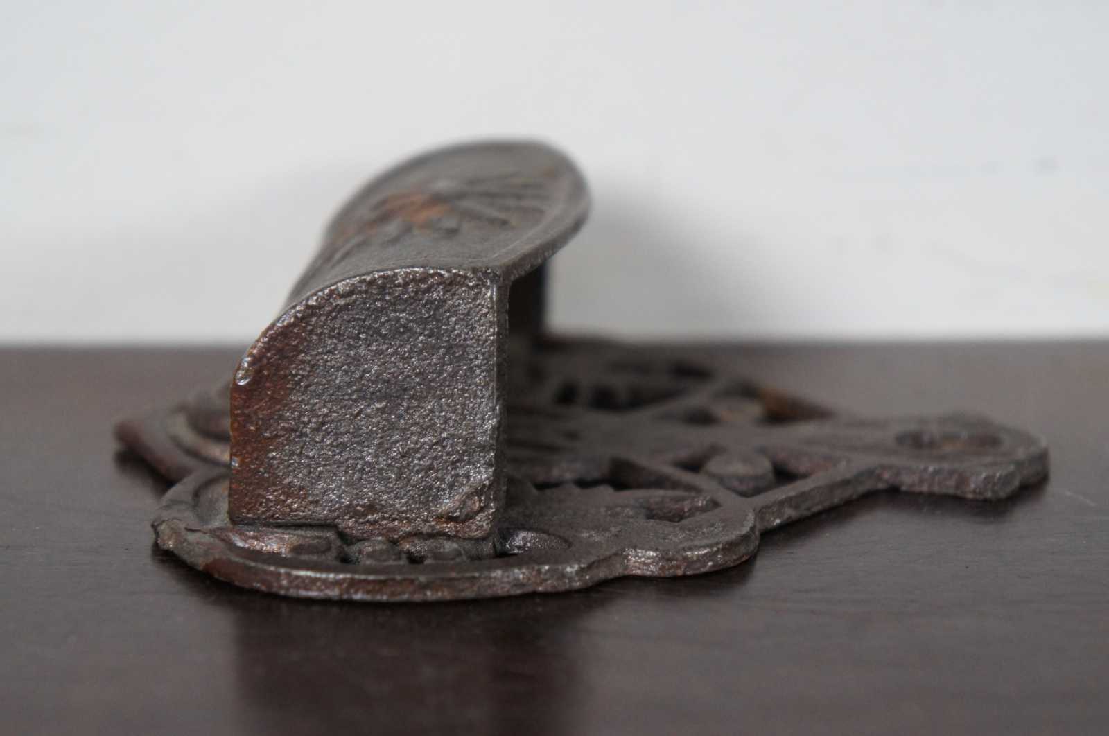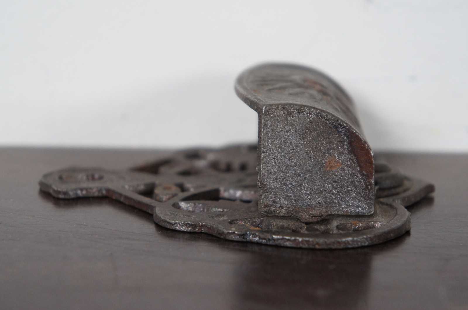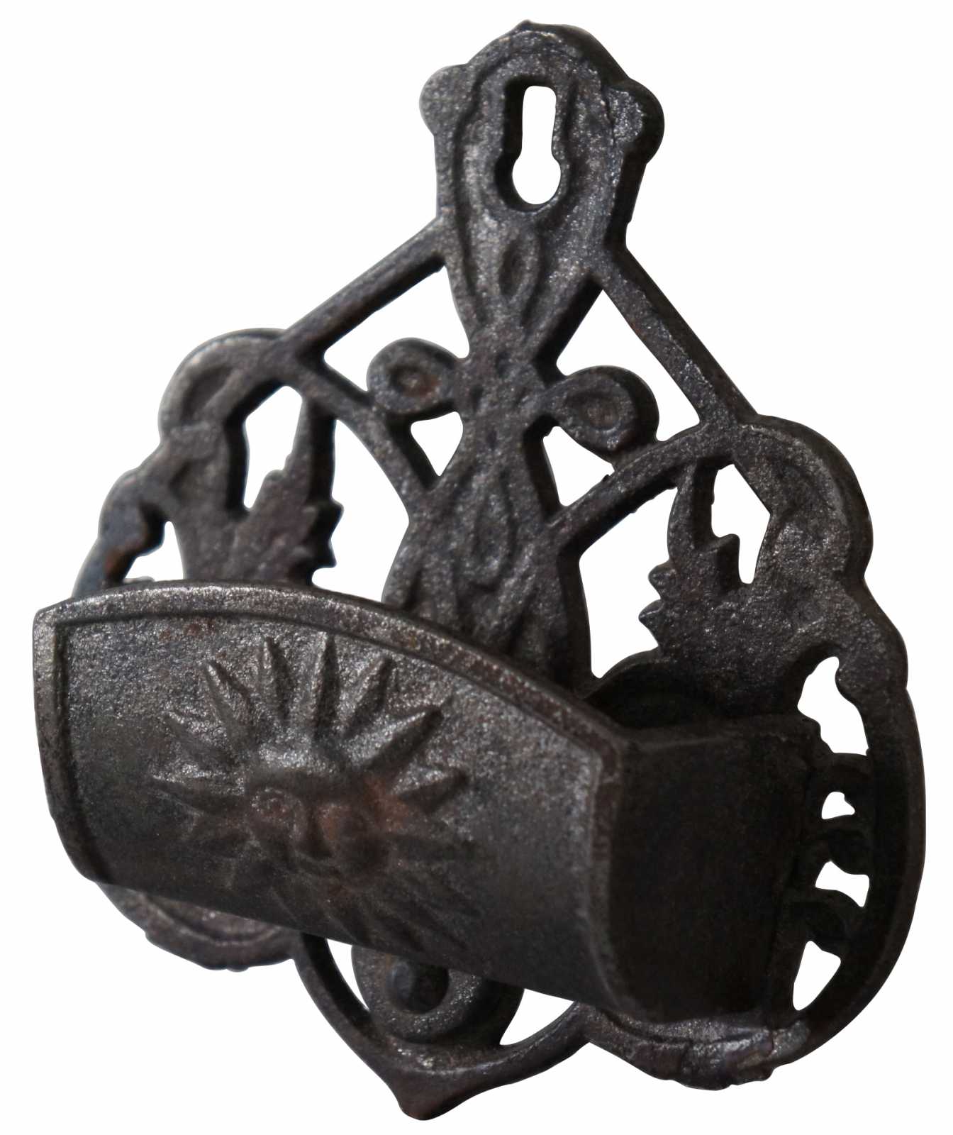 Antique cast iron match safe with Celtic knot inspired wall plate and sun with a face on the front.
