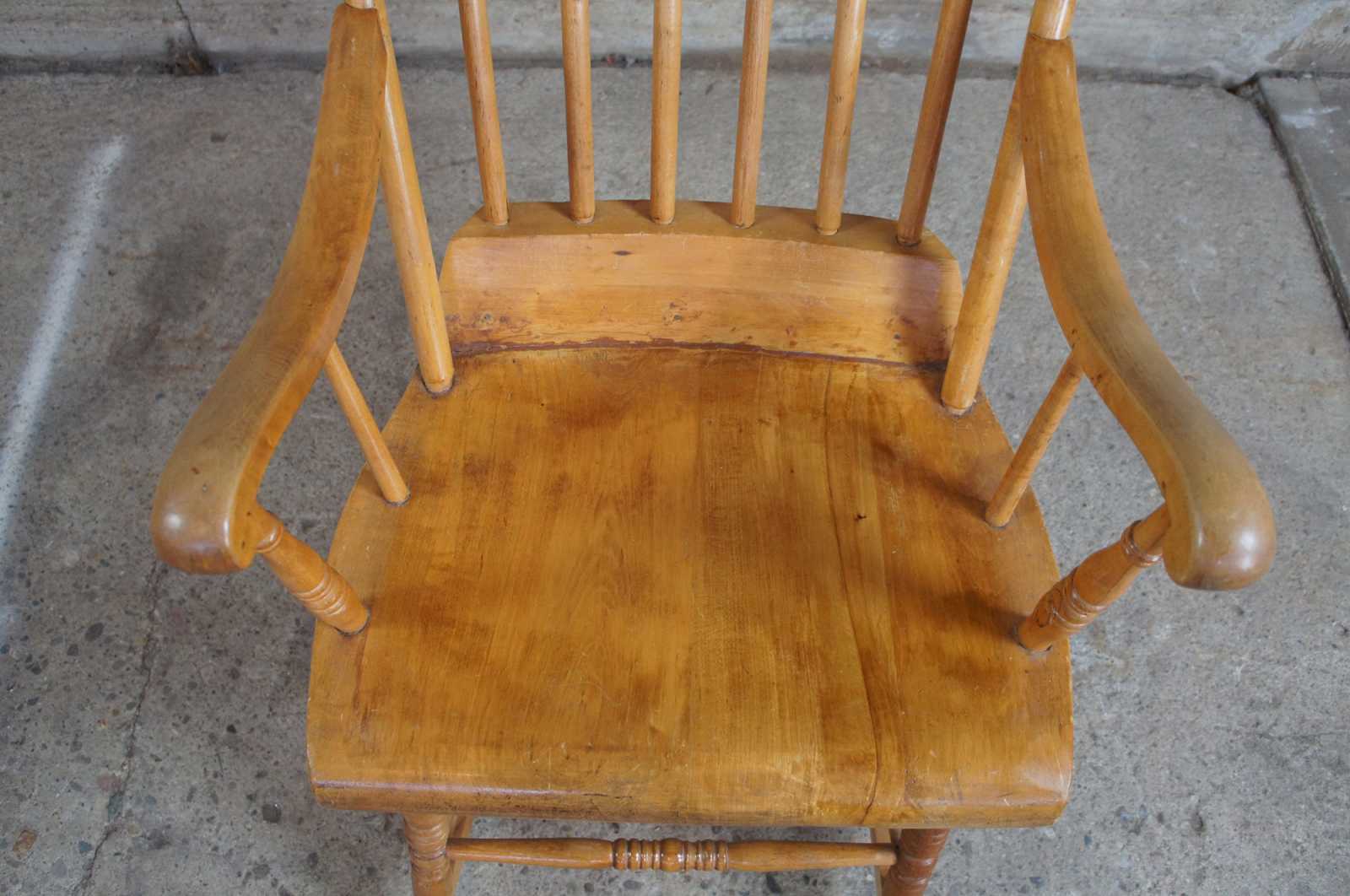 Antique artisinal or craftsman made windsor style rocking chair. Made from pine with a spindle back and contoured arms.