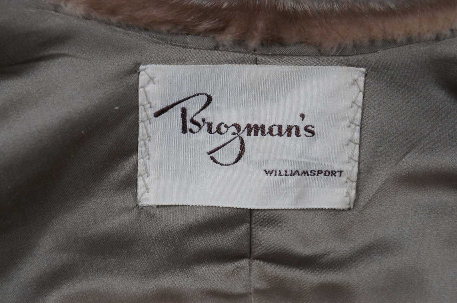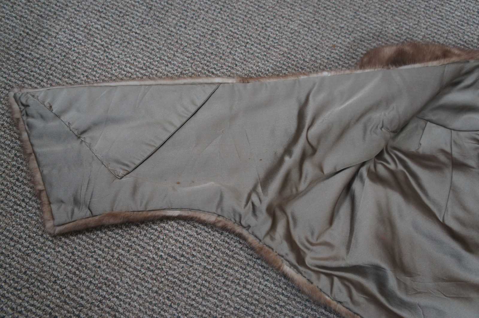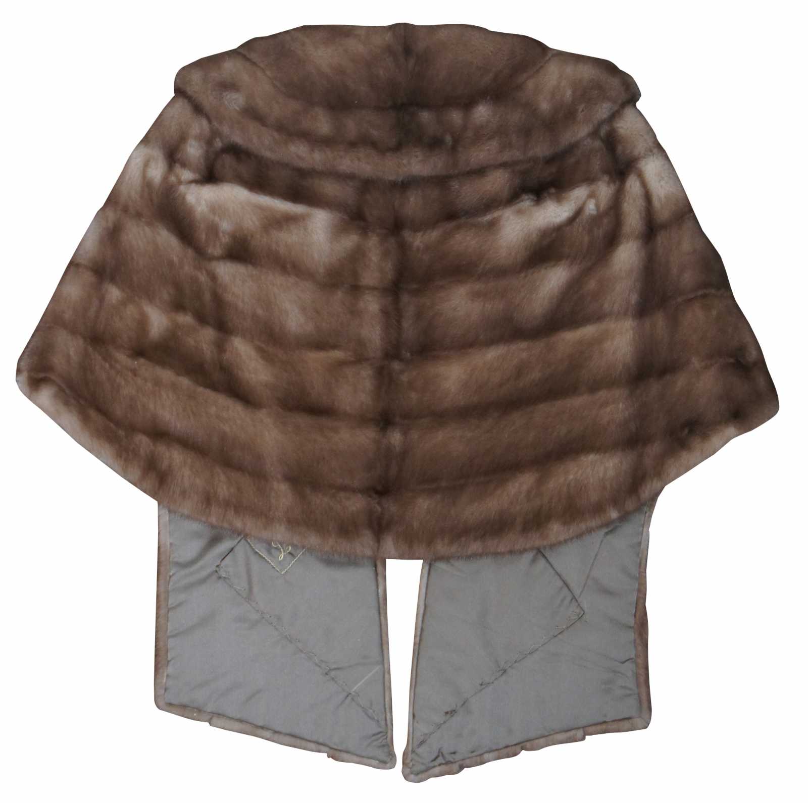Vintage light brown mink shawl wrap coat or jacket with satin lining and interior pockets; purchased at Brozman’s and monogrammed.