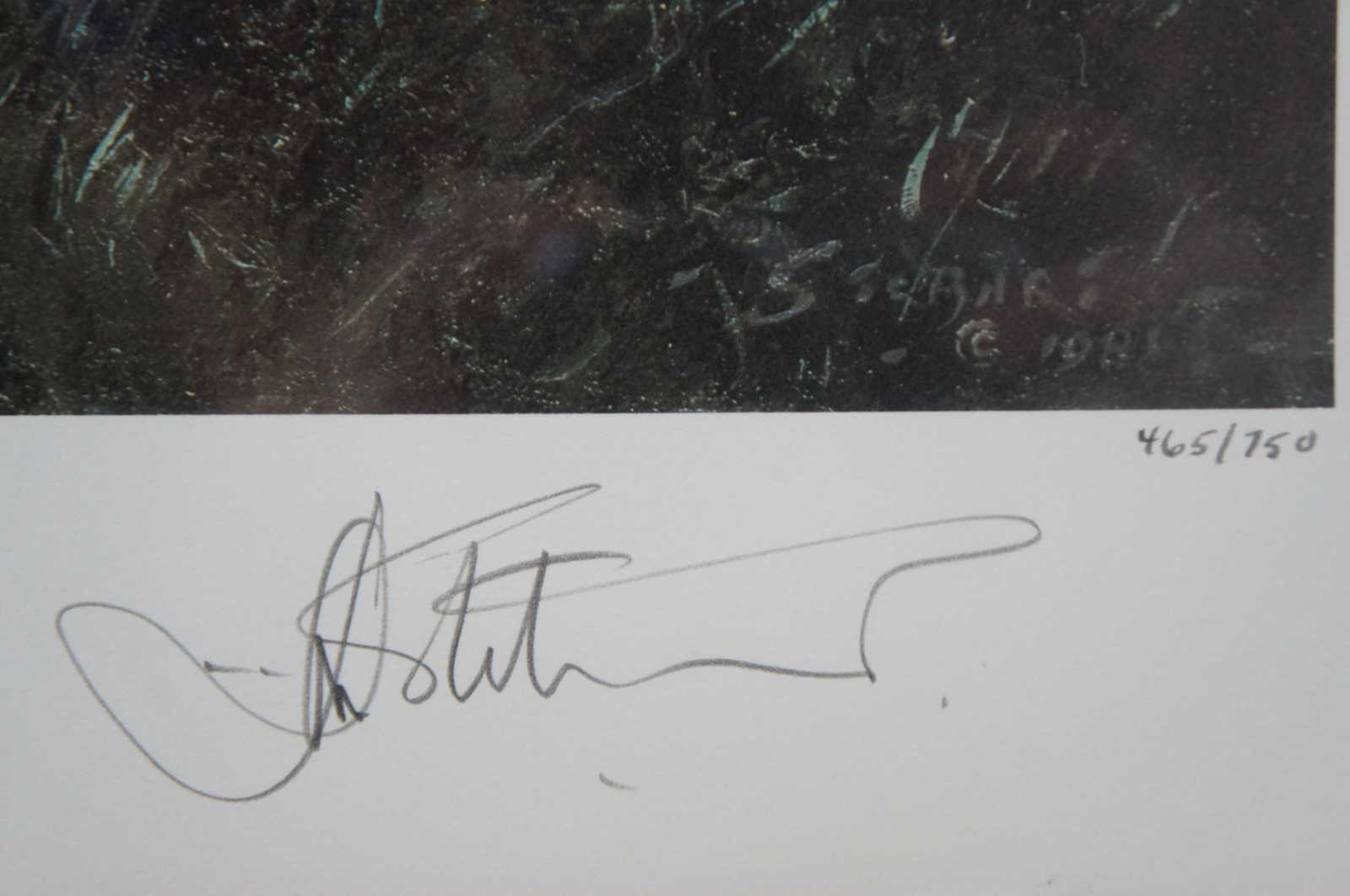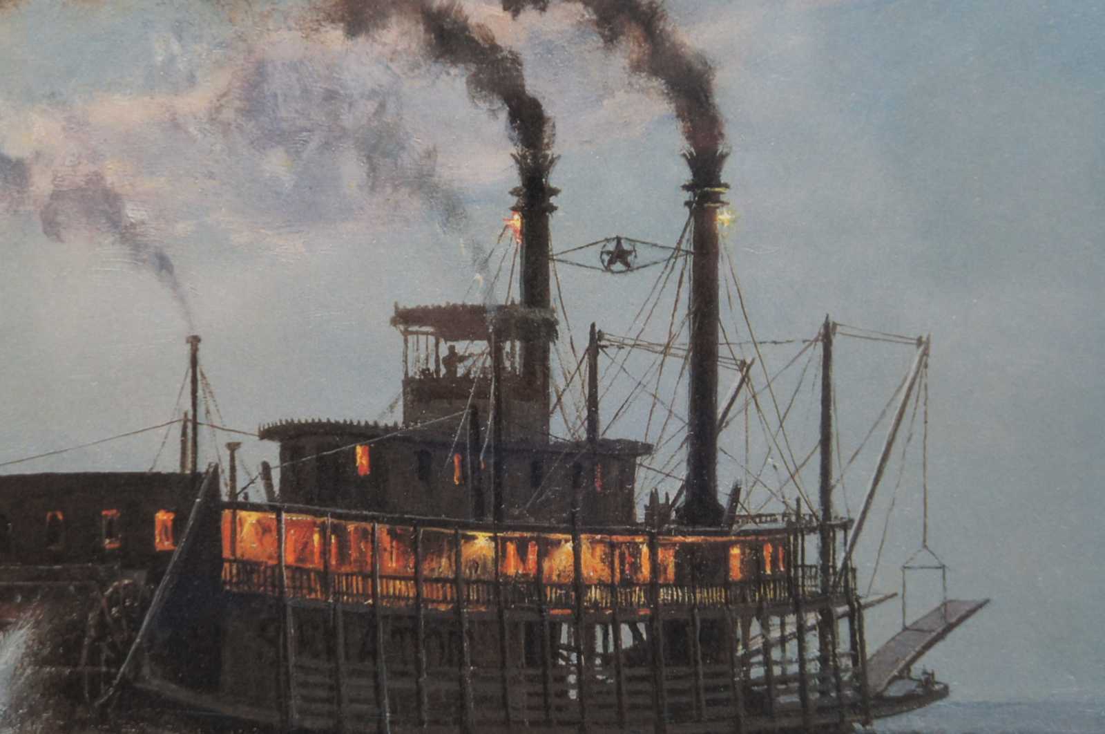 1981 lithograph print of “Night Run to Friars Point” by John Stobart, pencil signed and numbered 465/750, published by Maritime Heritage Prints, Inc. “A marine painter of harbor scenes and ship portraits, John Stobart has devoted his career to showing the majestic beauty of sailing ships from a previous era. He also does some plein-air painting.