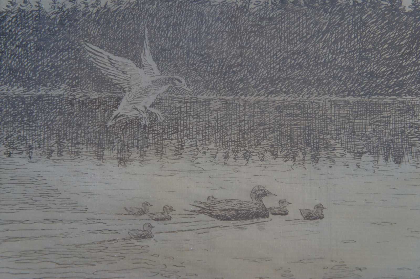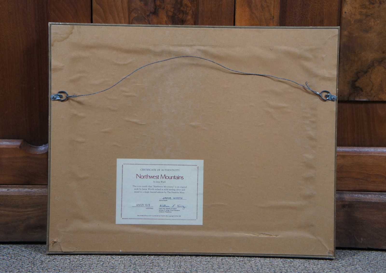 Vintage 1978 landscape of ducks on a lake with trees and mountains etched in .925 sterling silver produced for the Franklin Mint, titled “Northwest Mountains” by Jamie Wyeth. Includes certificate of authenticty.