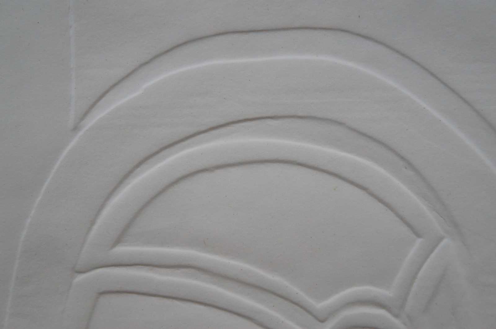 Vintage 1989 print by Carol M. Hershey, pencil signed and numbered 17/250, titled “Tunnel of Love,” portraying a pressed relief in the paper of a tunnel and road, leading to a mousehole shaped opening, through which a cat with yellow eyes is peering.