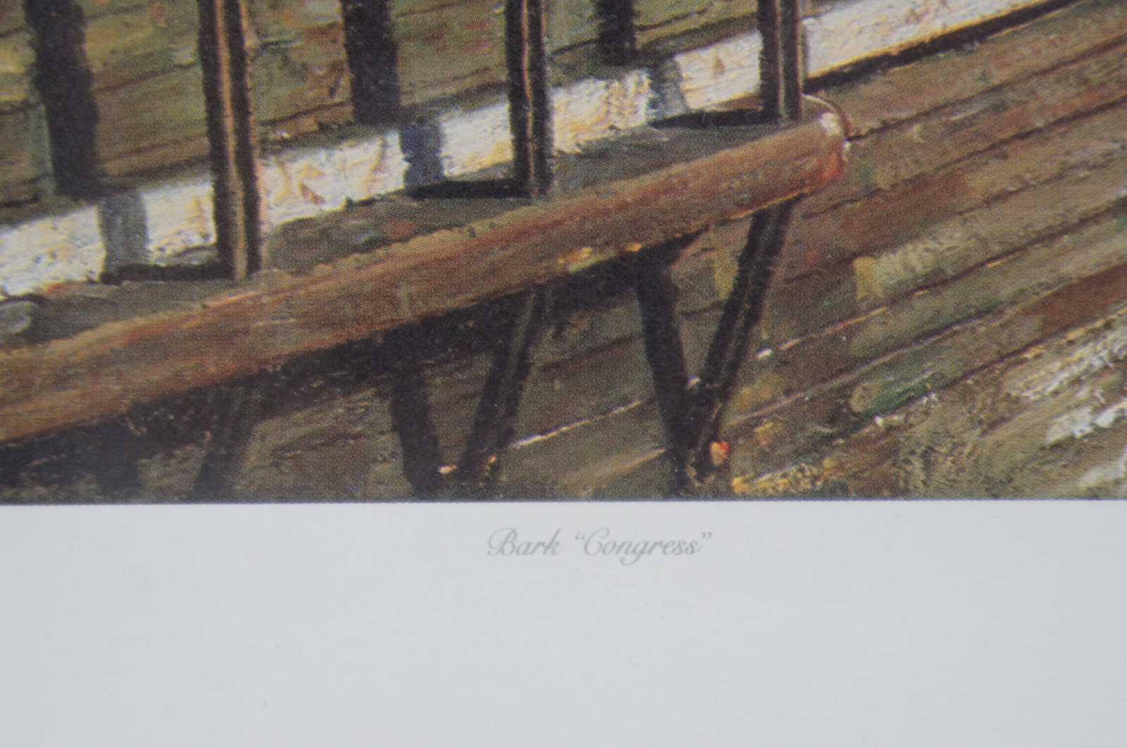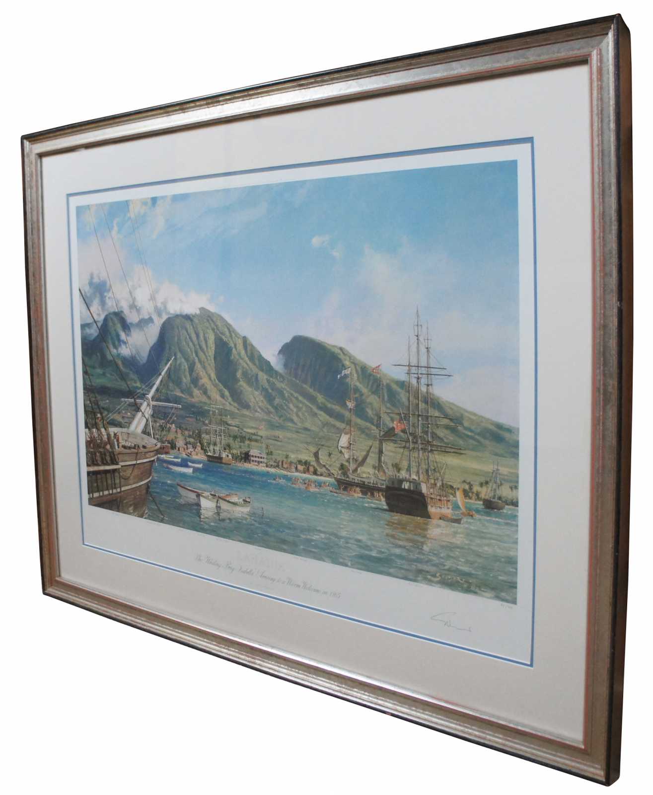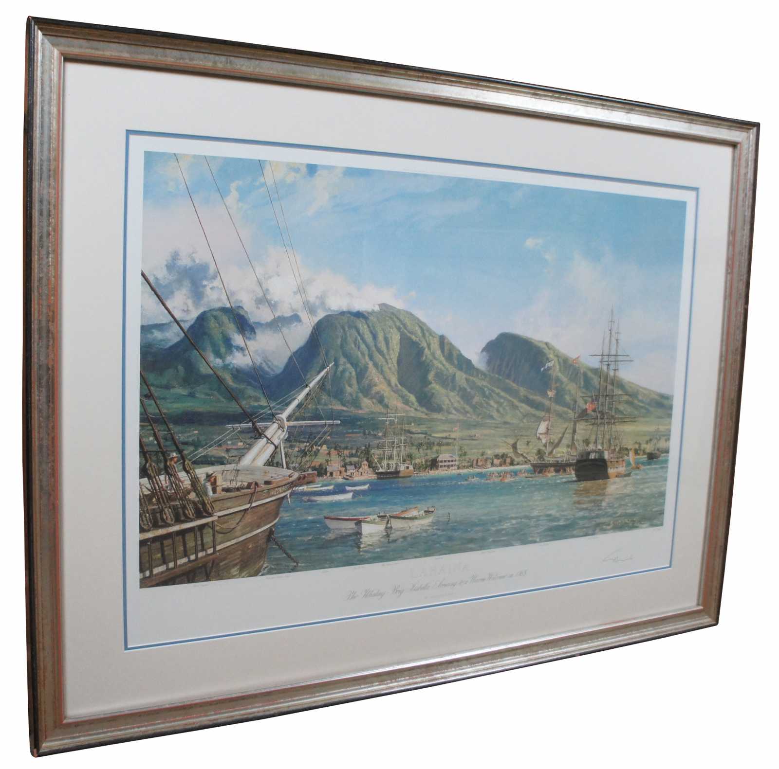 Vintage print featuring “Lahaina: The Whaling (fishing) Brig ‘Isabella’ Arriving (returning) to a Warm Welcome in 1865” by John Stobart, pencil signed and numbered 95/950.