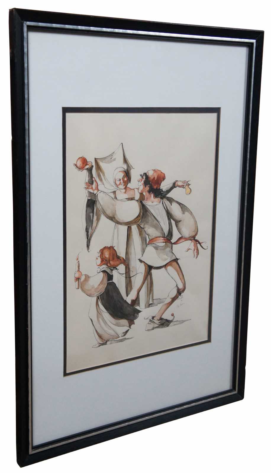 Antique 1930’s ink and watercolor wash painting titled “Twelfth Night” by Dorothy De Boe showing a tableau of three Medieval style figures; one little girl holding candle, one jester, and a woman wielding fruit.