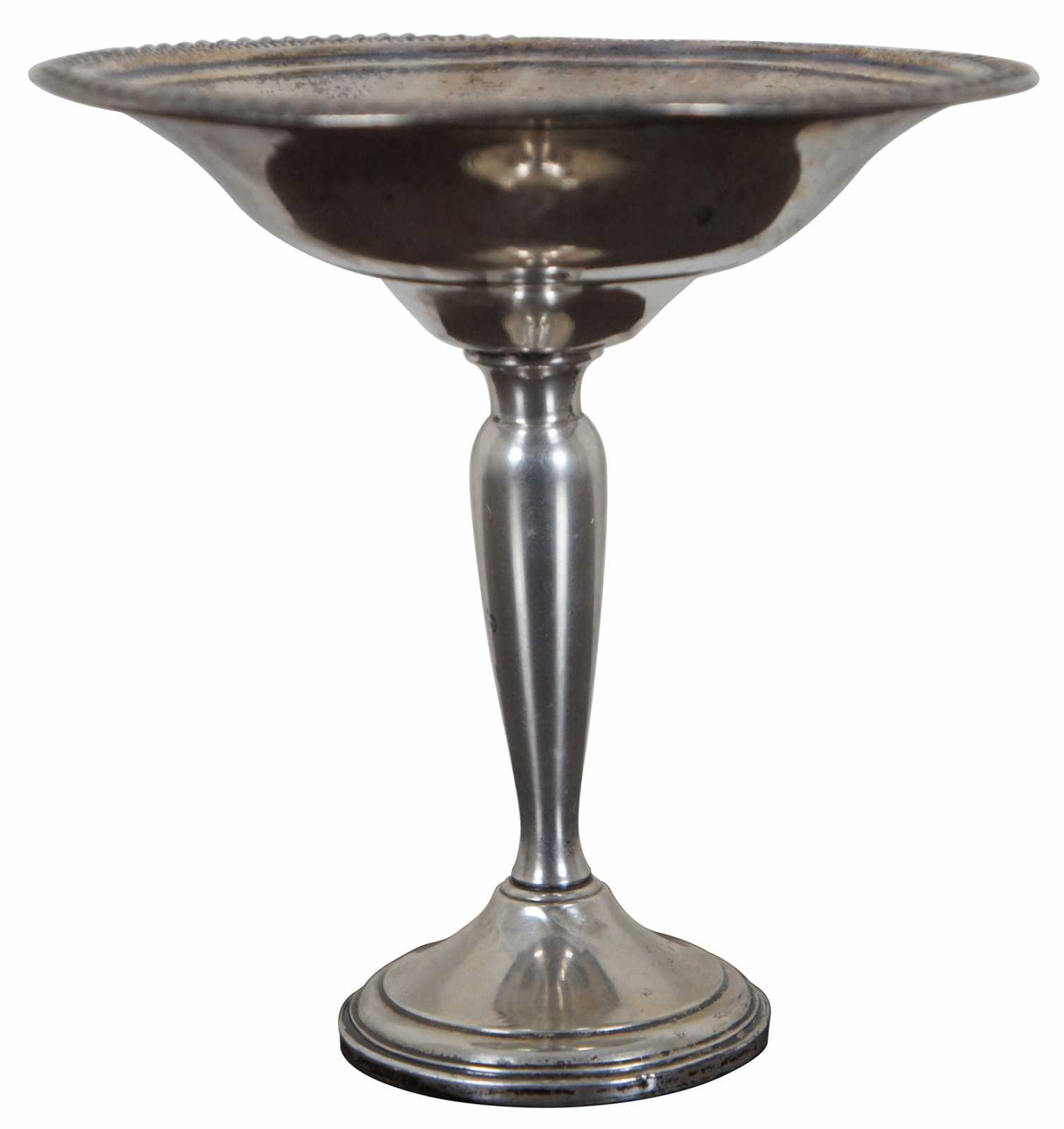 Antique sterling silver compote by Frank M Whiting. Features a weighted footed pedestal base and flared top. Marked Sterling by Frank M Whiting & Company, W circle mark, Weighted and Re-Enforced 153.