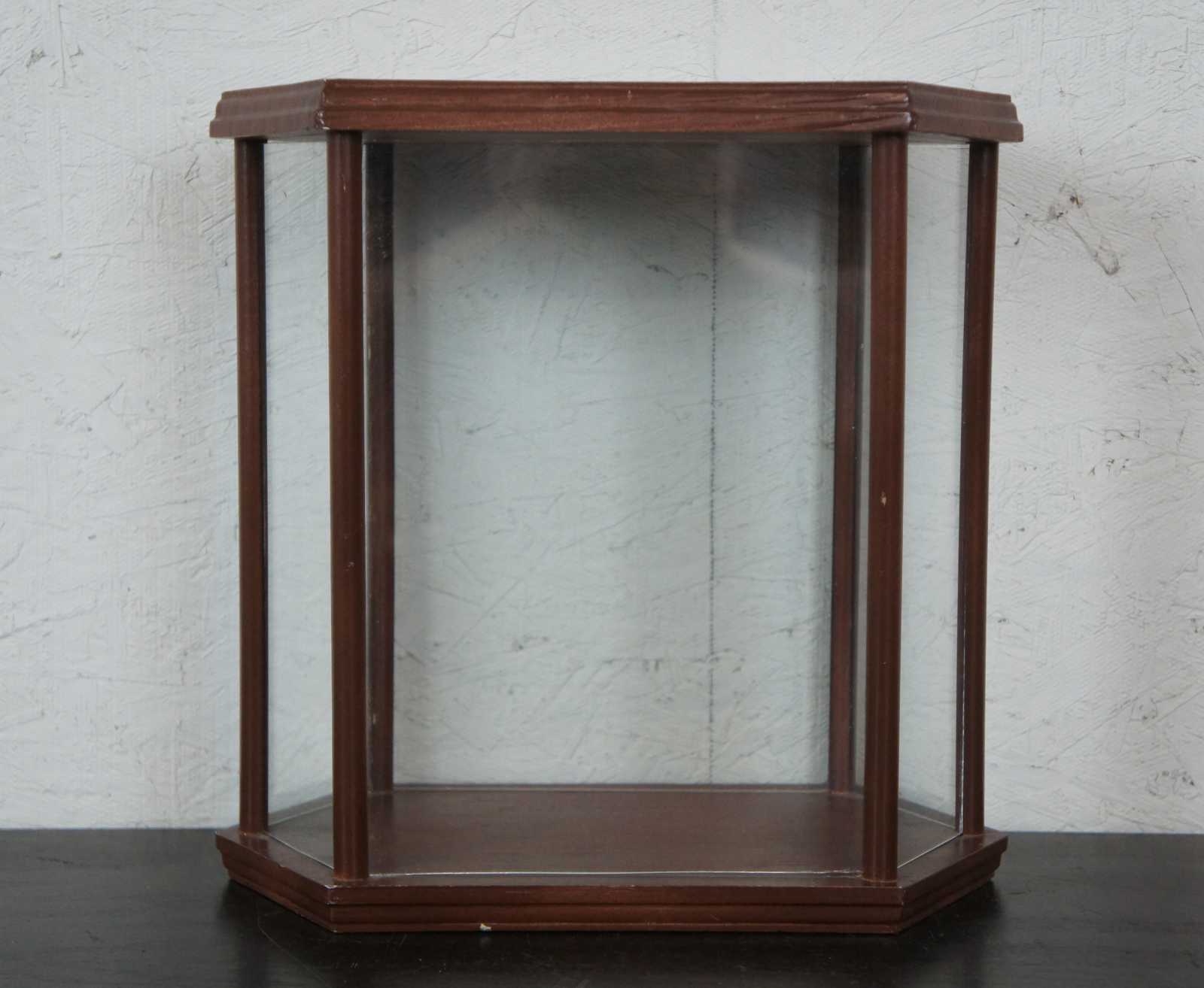 Vintage wood and glass display case shaped like an elongated heaxagon.