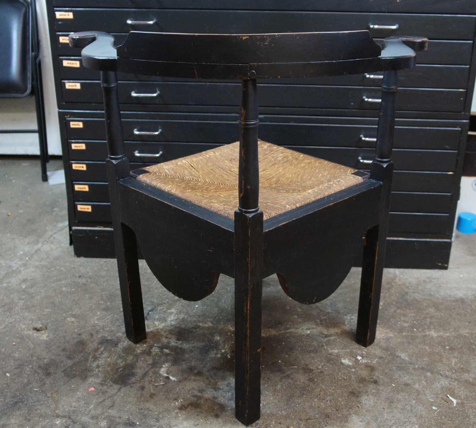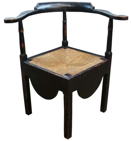 Antique Early American corner chair. Features rush seat and a curved crest with molding, finished in black with naturally distressed finish.