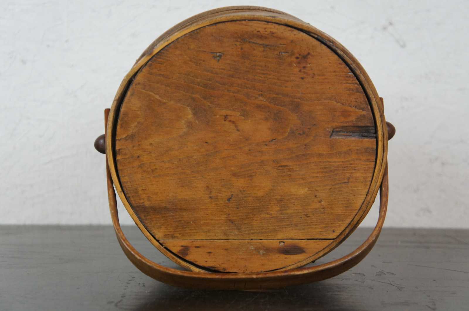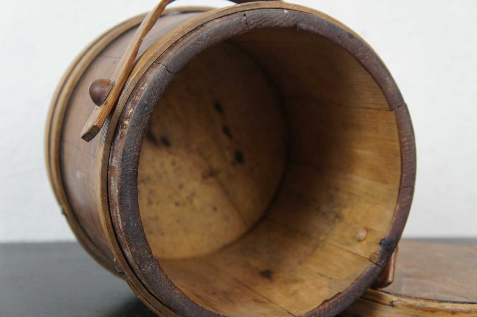 Antique wooden sugar bucket or firkin with rotating handle and lid.