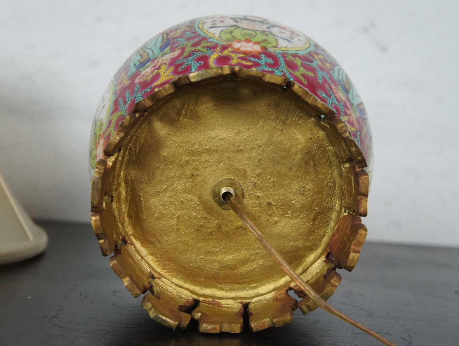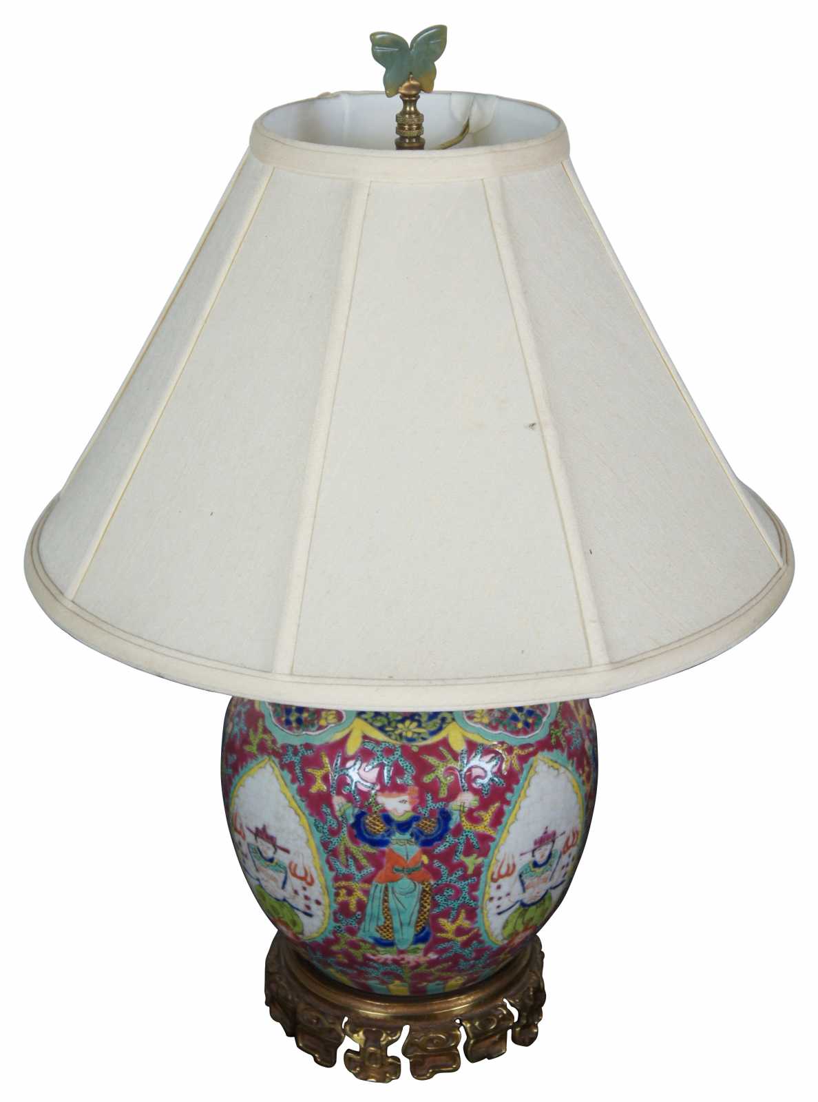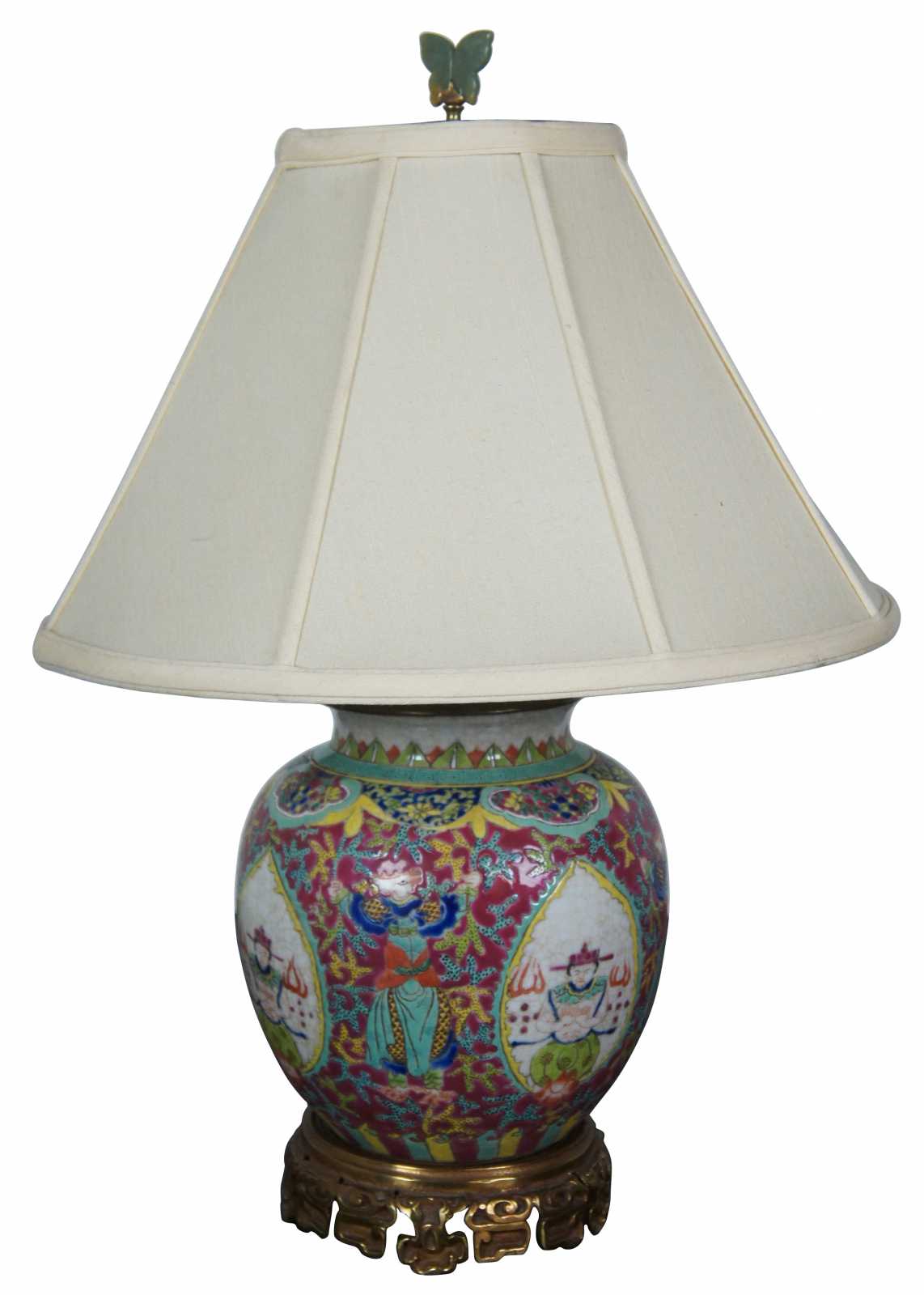 Vintage footed bronze and porcelain ginger jar table lamp featuring enameled figures with tongues of fire alternating with a dancing figure with the head of a chicken or bird. Features a jade butterfly finial and greek key boarder.