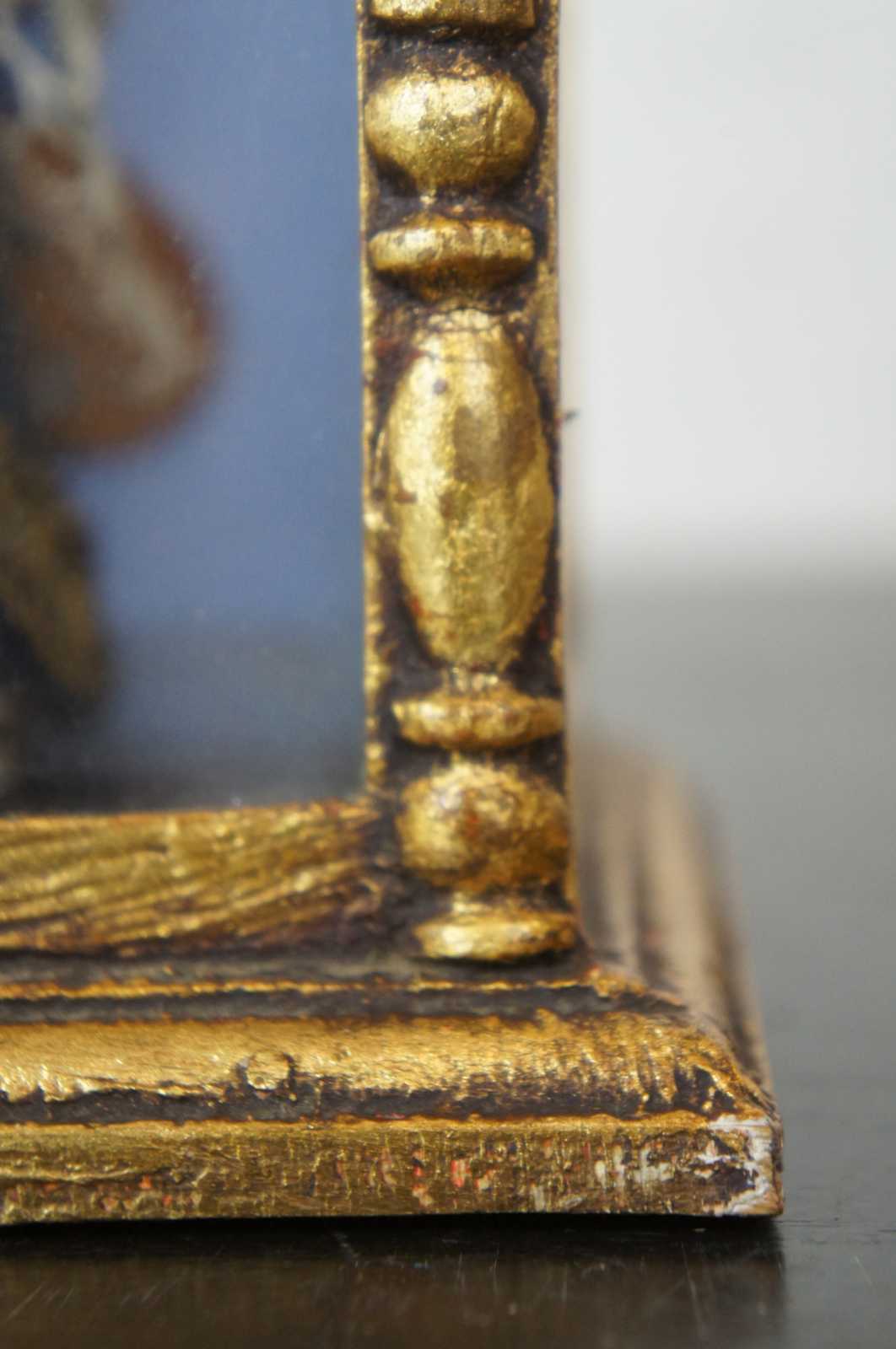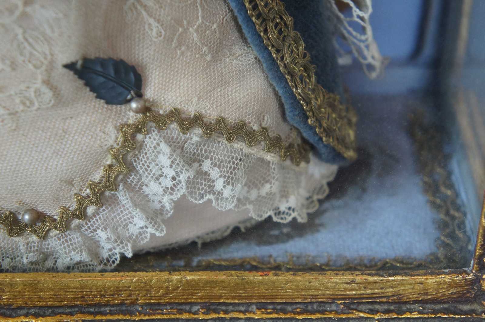 Vintage gilded tabletop display curio shrine case containing the figure of the Virgin Mary dressed as the Queen of Heaven, holding a bouquet of flowers and the Baby Jesus, surrounded by an arch of flowers.