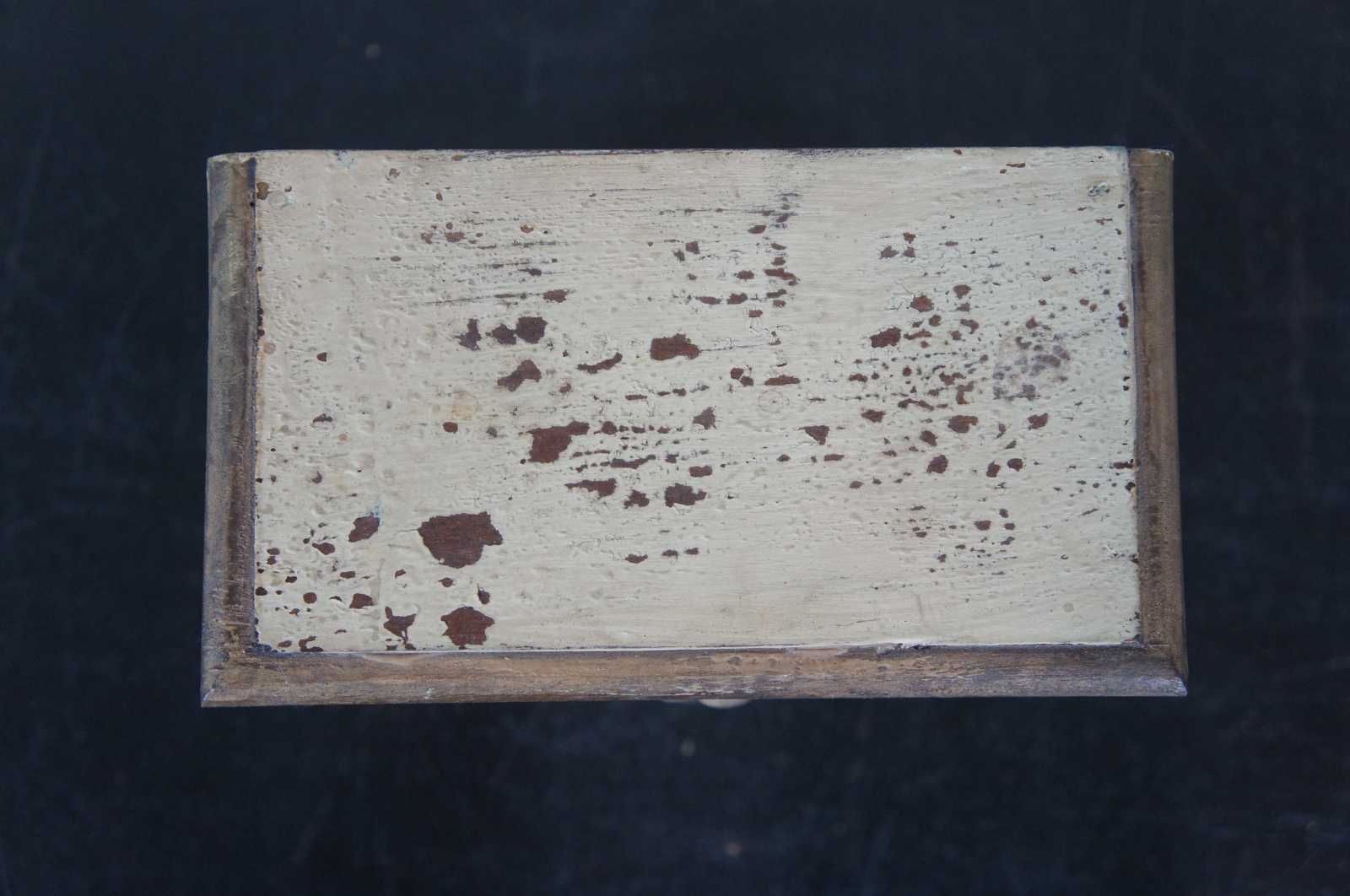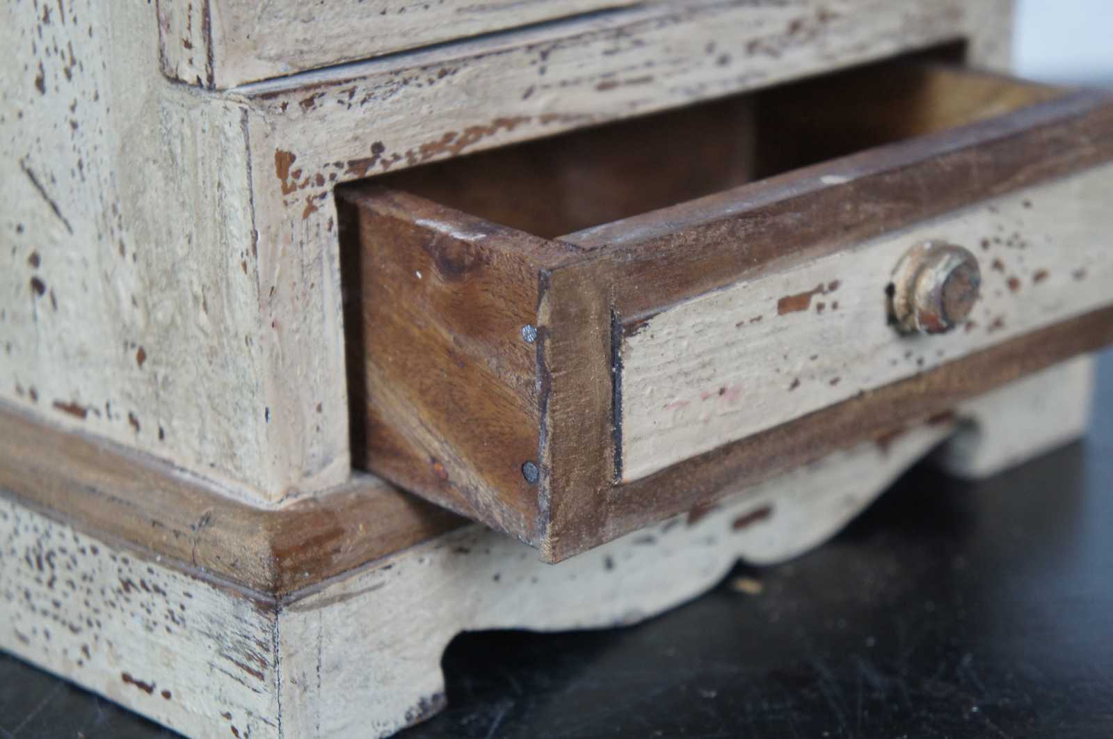 Antique primitive miniature wood cabinet or wardrobe with four drawers, painted in white and gold.