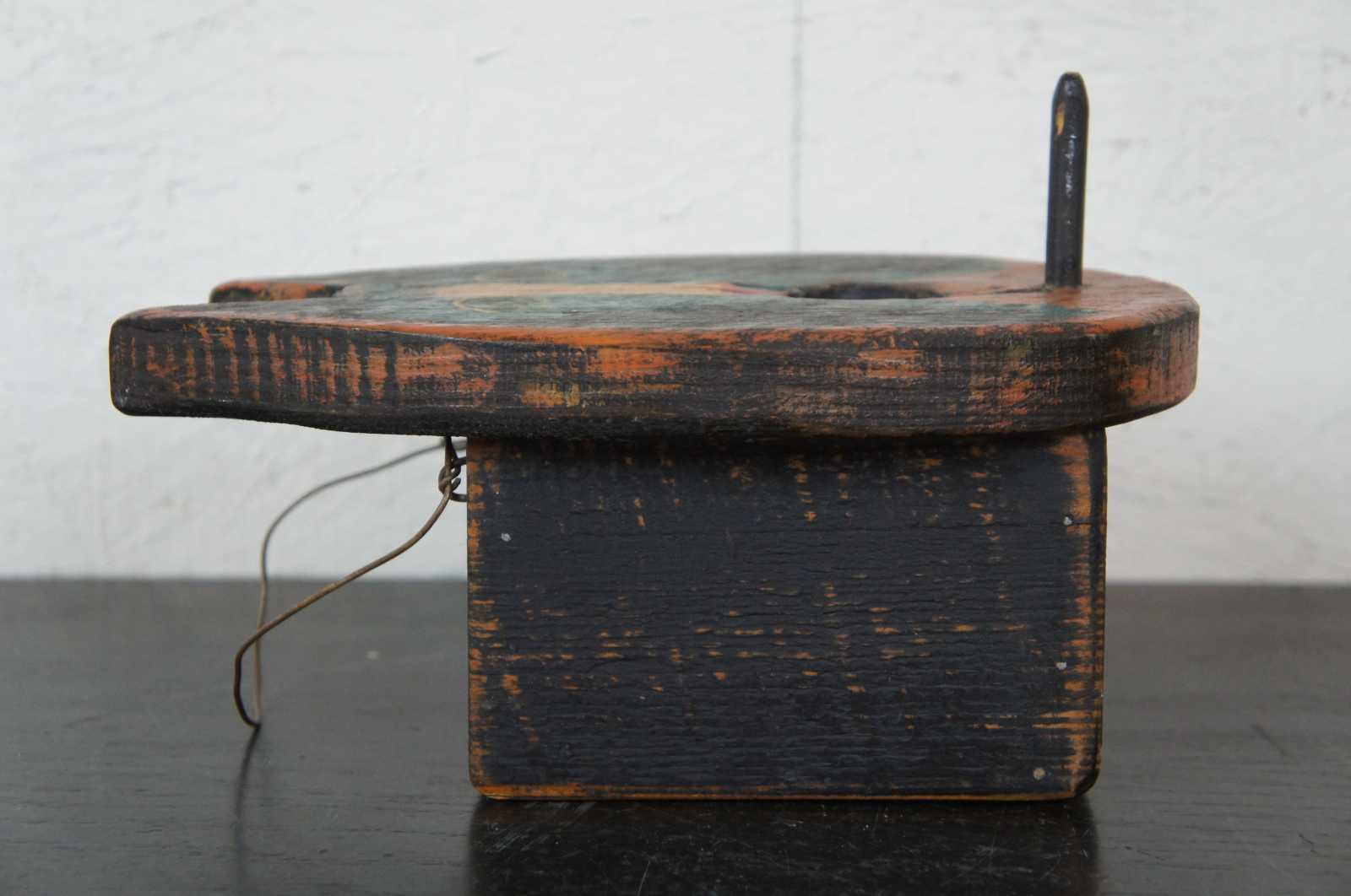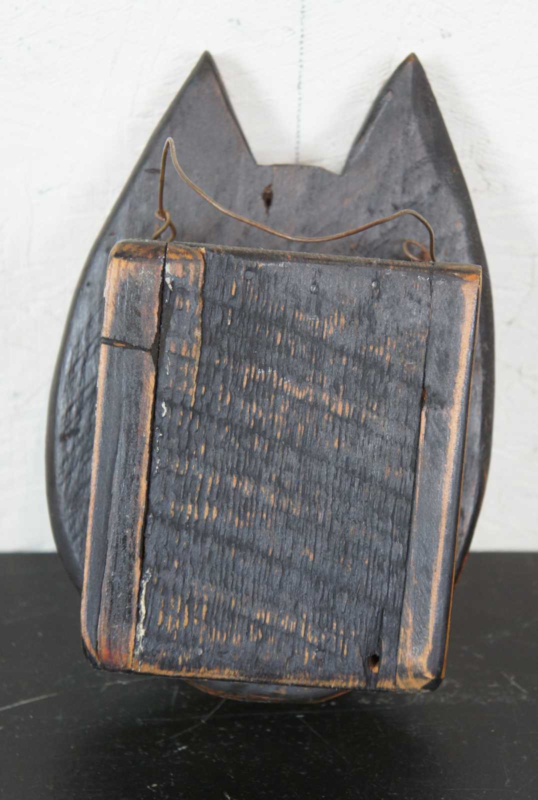 Hand made antique folk art painted wooden birdhouse shaped like a blue, white and black cat’s face.