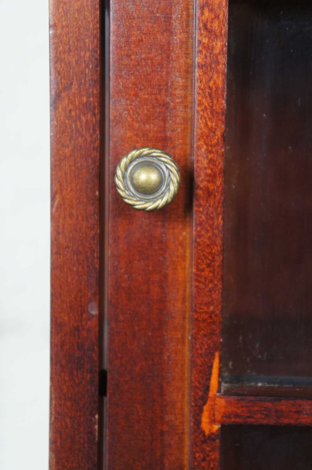 Vintage wall hanging or tabletop display cabinet with arched top, three shelves and glass door and sides.