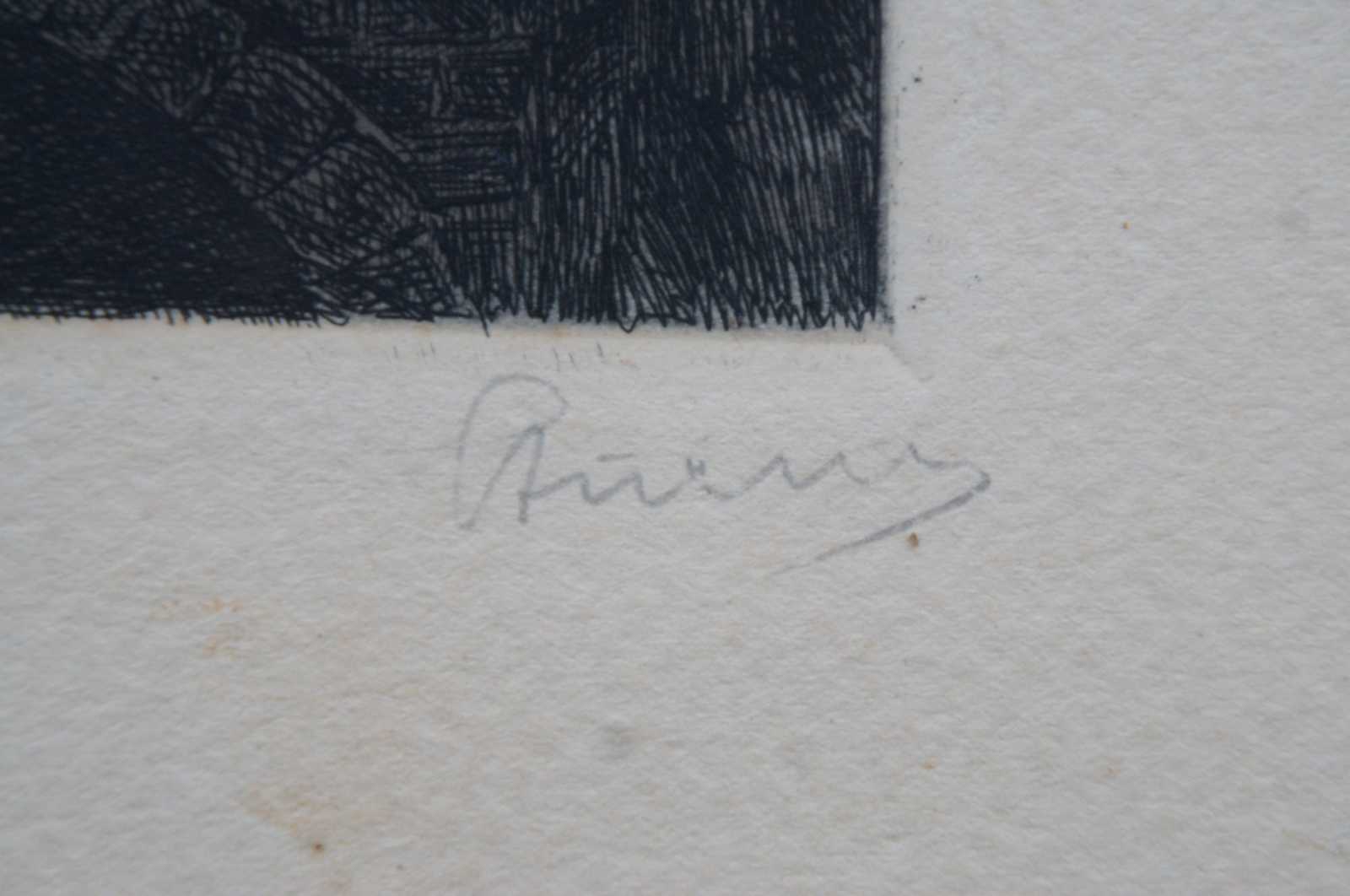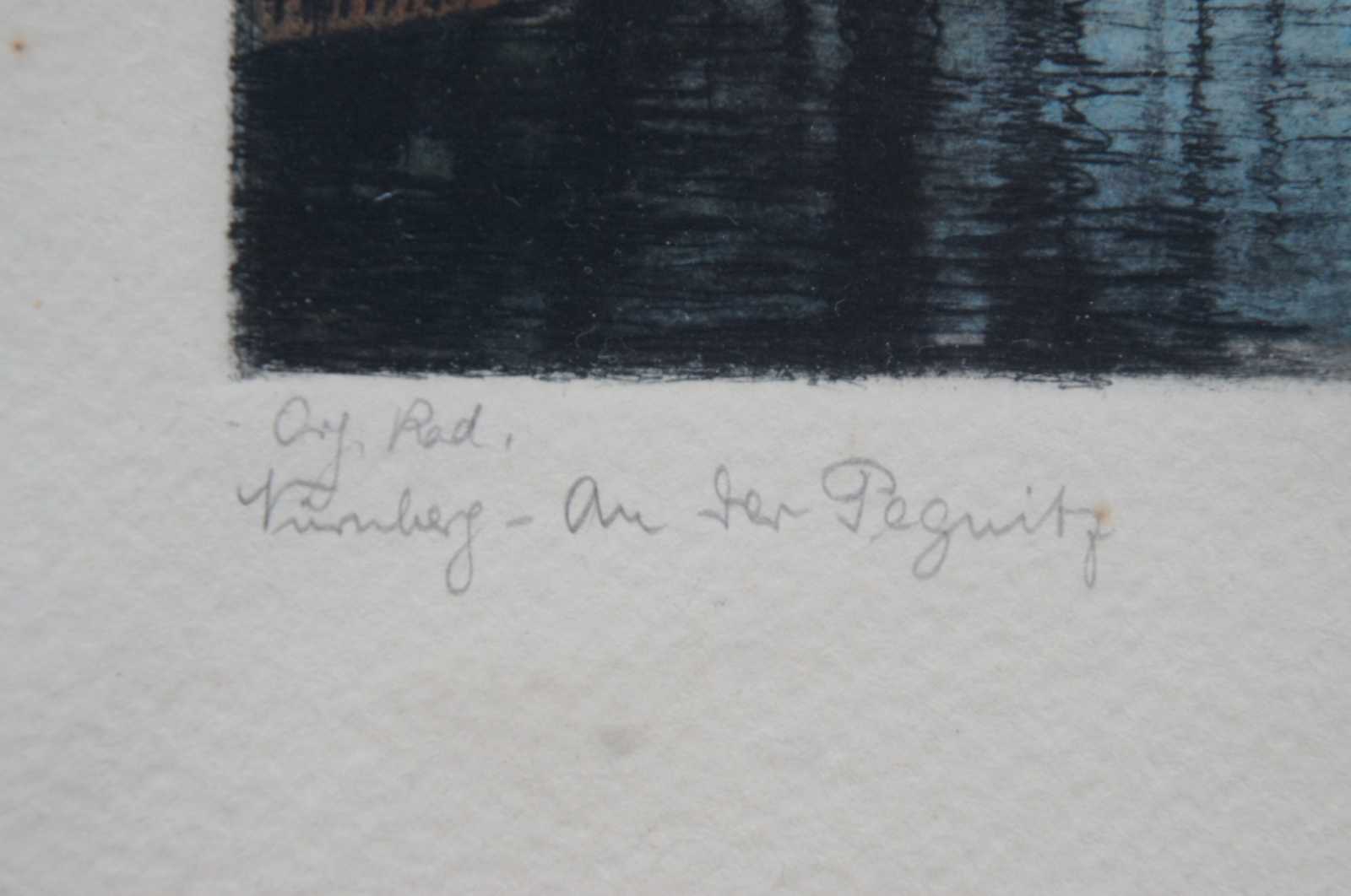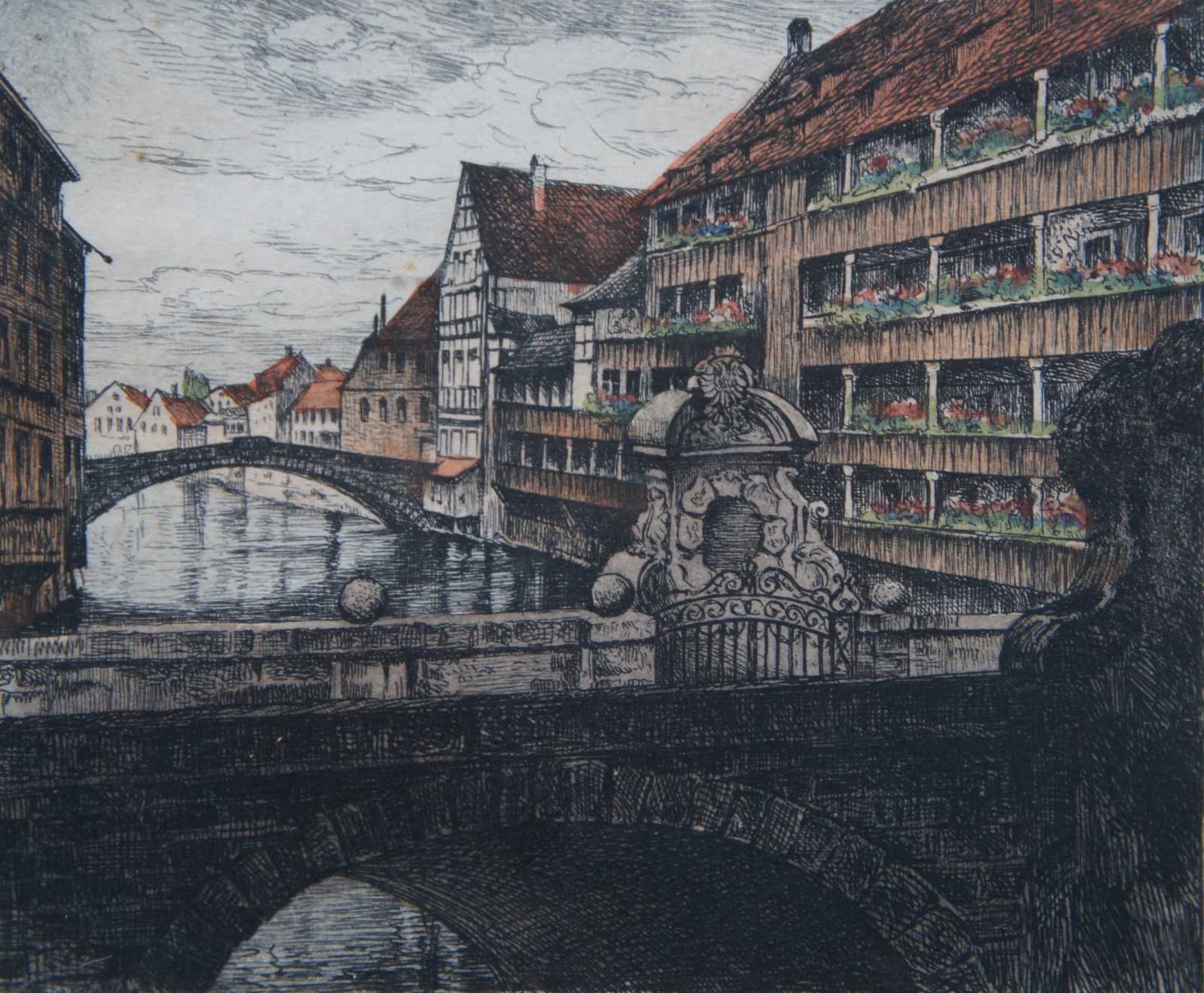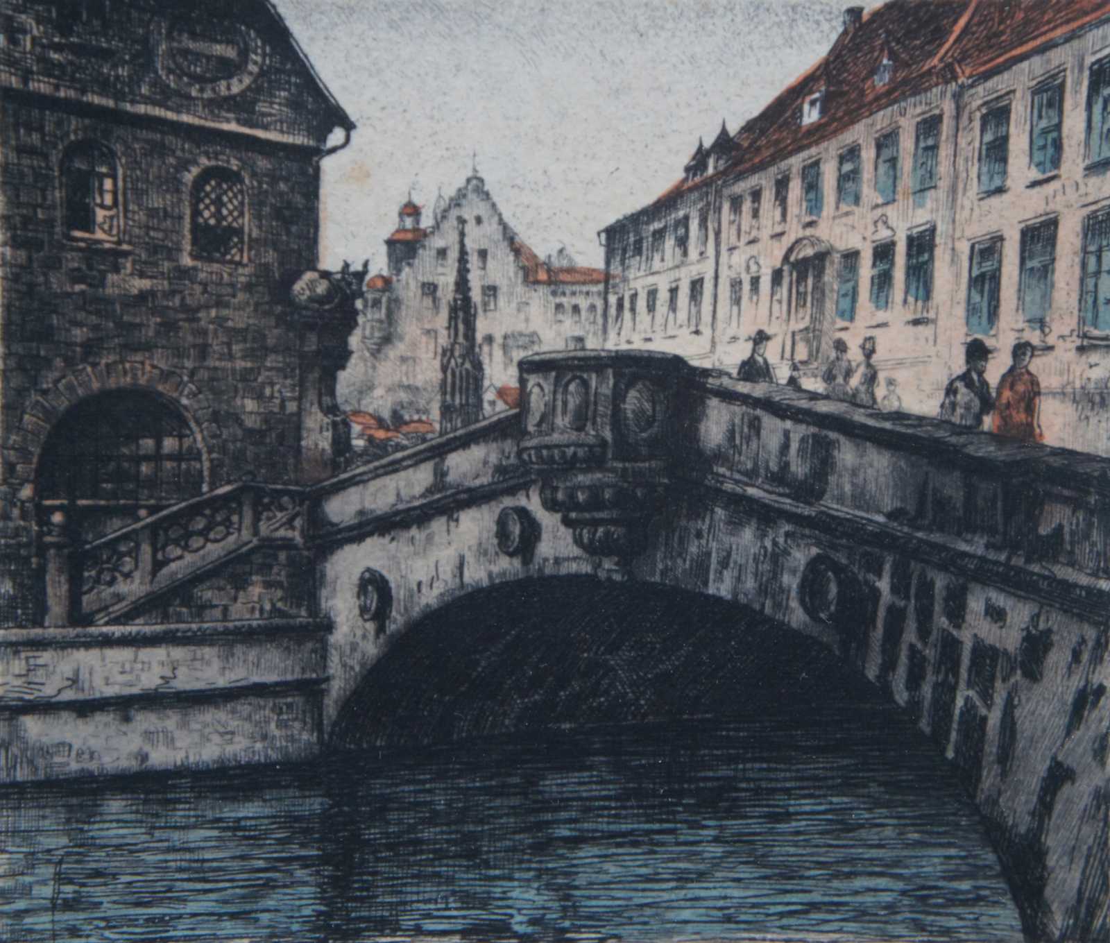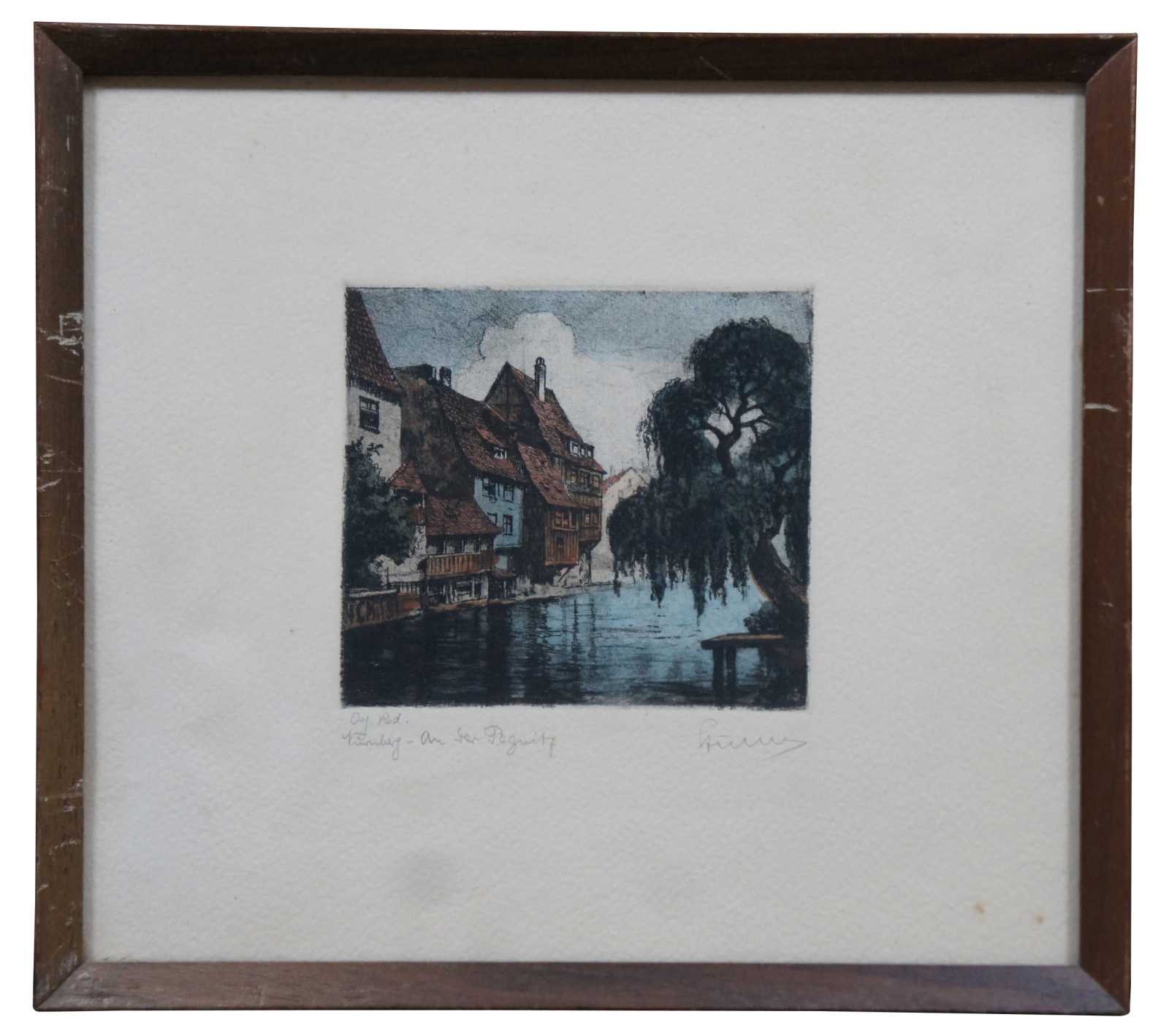 Set of three small antique colored etchings of a European cityscape and river or canal, pencil signed along the bottom.