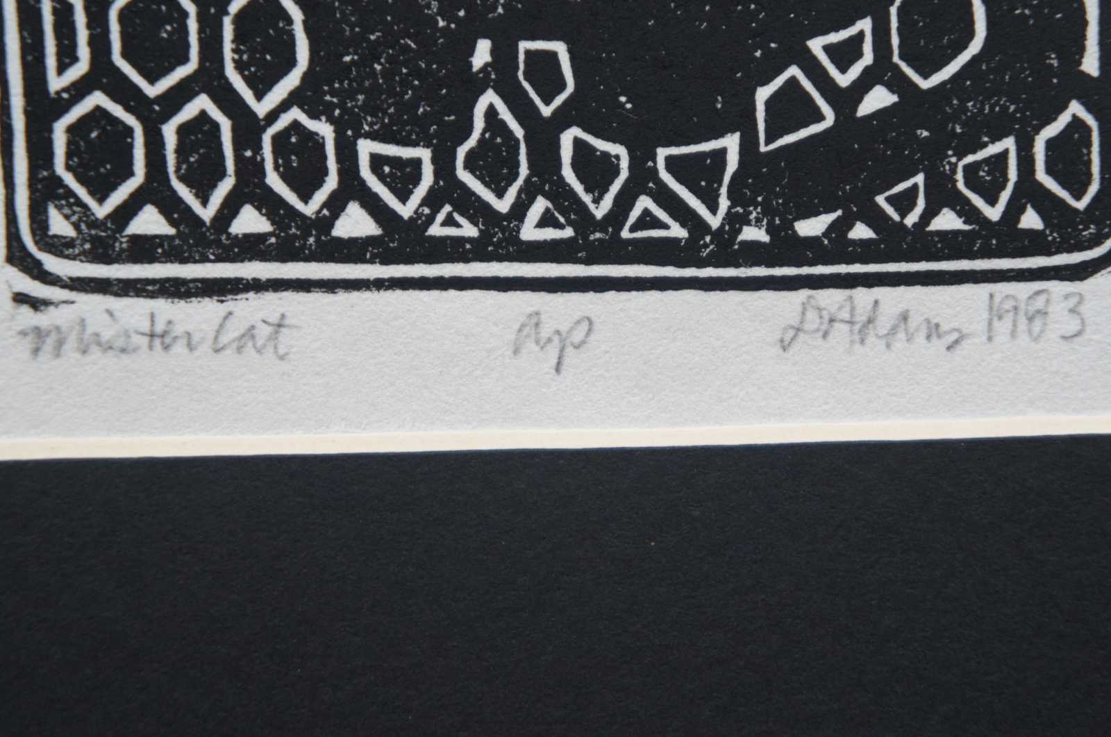 Vintage matted and unframed, black and white artist’s proof woodblock print titled “Mister Cat” by D. Adams 1983.