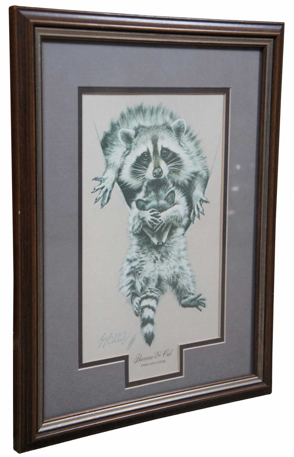 Vintage pencil signed print titled “Raccoon & Cub” by Guy Coheleach. “Guy Coheleach was born in New York City in 1933, and graduated from Cooper Union in 1956 after a military interruption serving in Korea with the 65th Combat Engineers from 1954-'55.