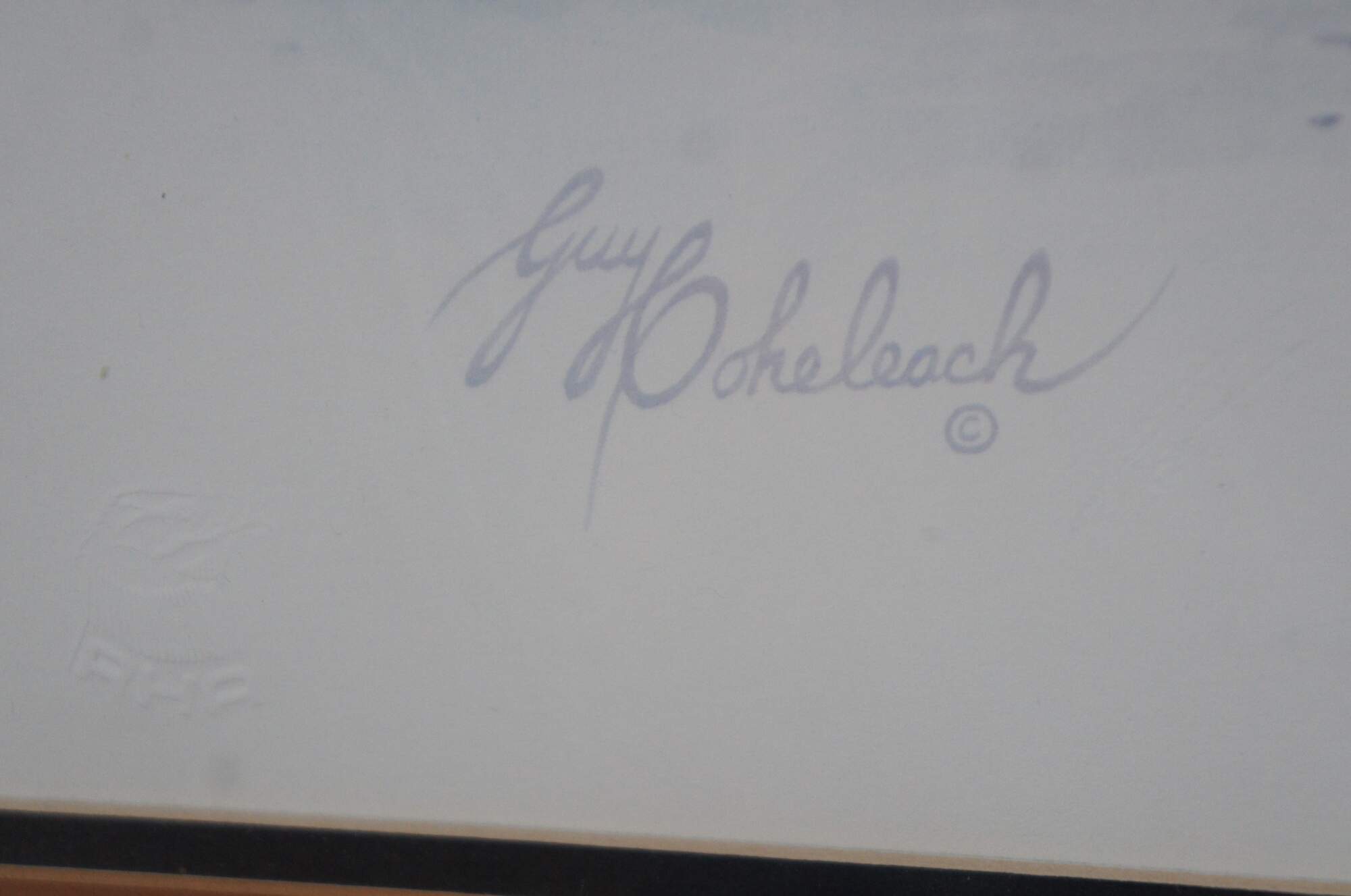 Vintage lithograph print by Guy Coheleach titled “Early Warning,” showing three red foxes being rebuffed by a defensive skunk. Impressed logo by the publisher in the lower left. An imprint is faintly visible next to the printed artist’s name, resembling his signature. “Guy Coheleach was born in New York City in 1933, and graduated from Cooper Union in 1956 after a military interruption serving in Korea with the 65th Combat Engineers from 1954-'55.