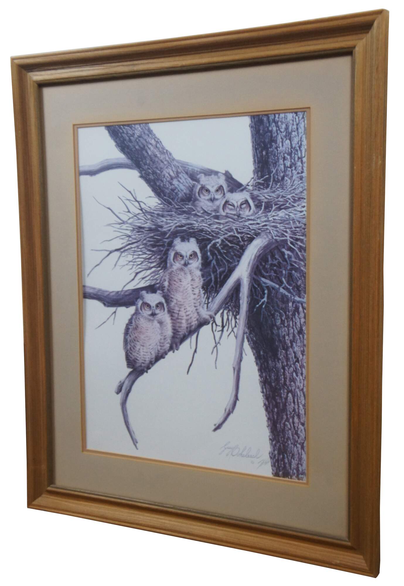 Vintage pencil signed lithograph print by Guy Coheleach titled “Young Great Horned Owls,” showing four of the birds nestled in a nest and perched in the branched of a tree.“Guy Coheleach was born in New York City in 1933, and graduated from Cooper Union in 1956 after a military interruption serving in Korea with the 65th Combat Engineers from 1954-'55.