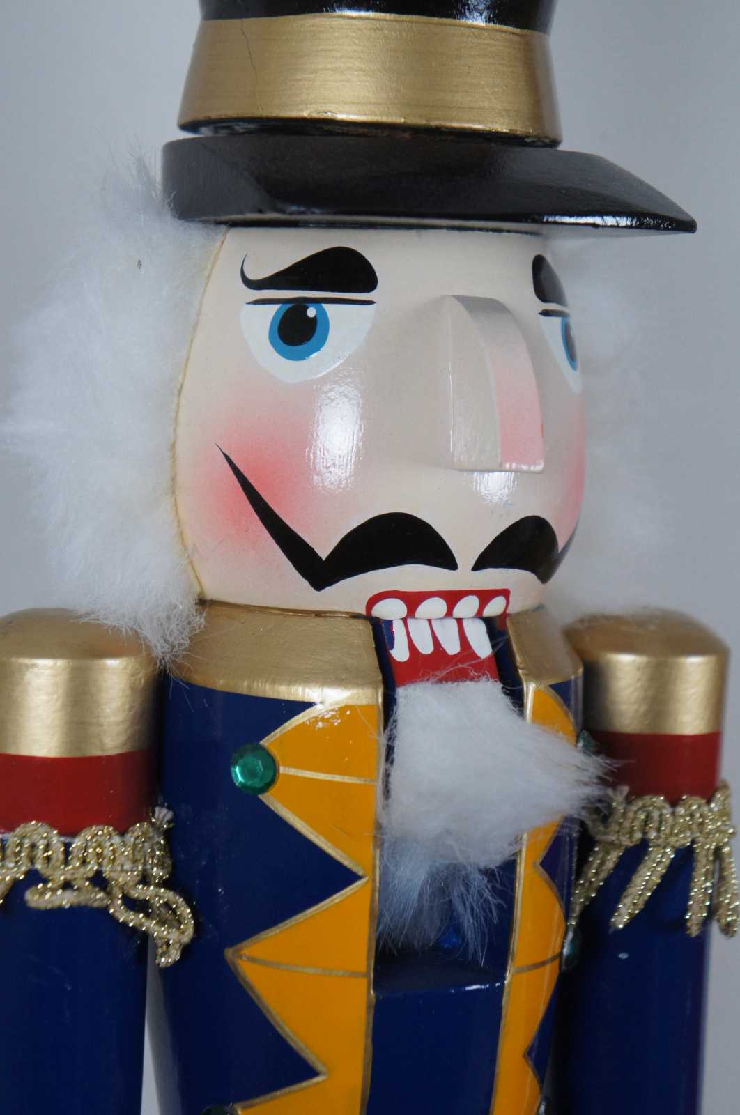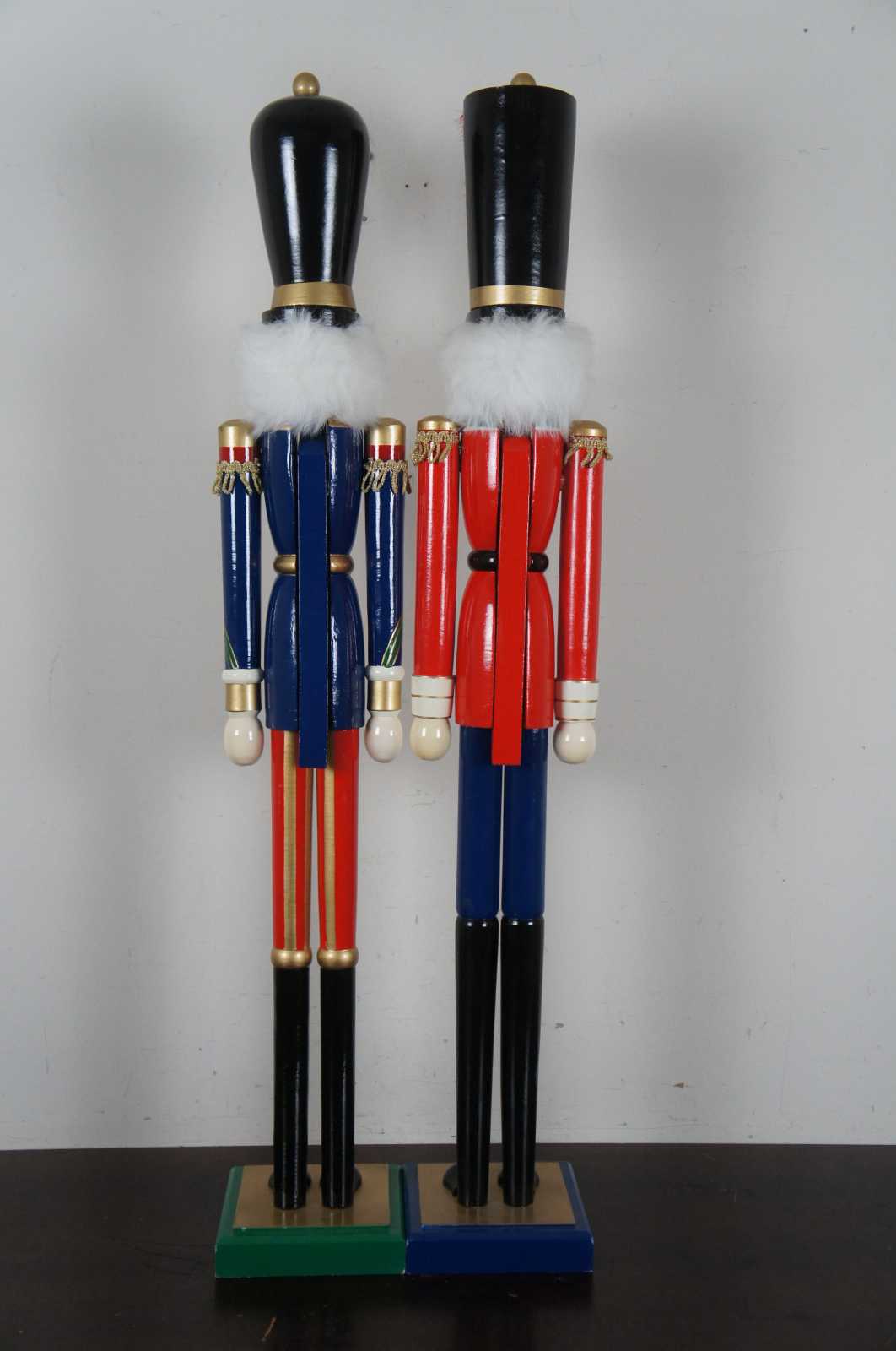 Pair of two whimsicle nutcracker figurines. Features two tall and skinny hand painted nutcrackers with functional mouths.