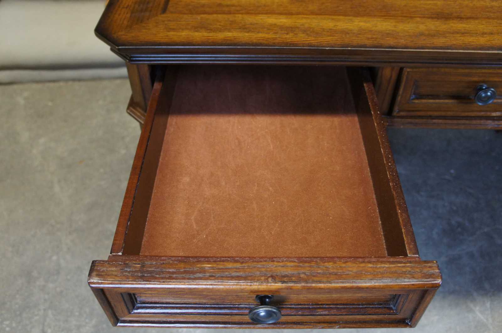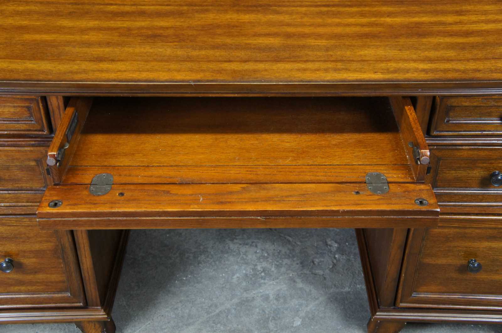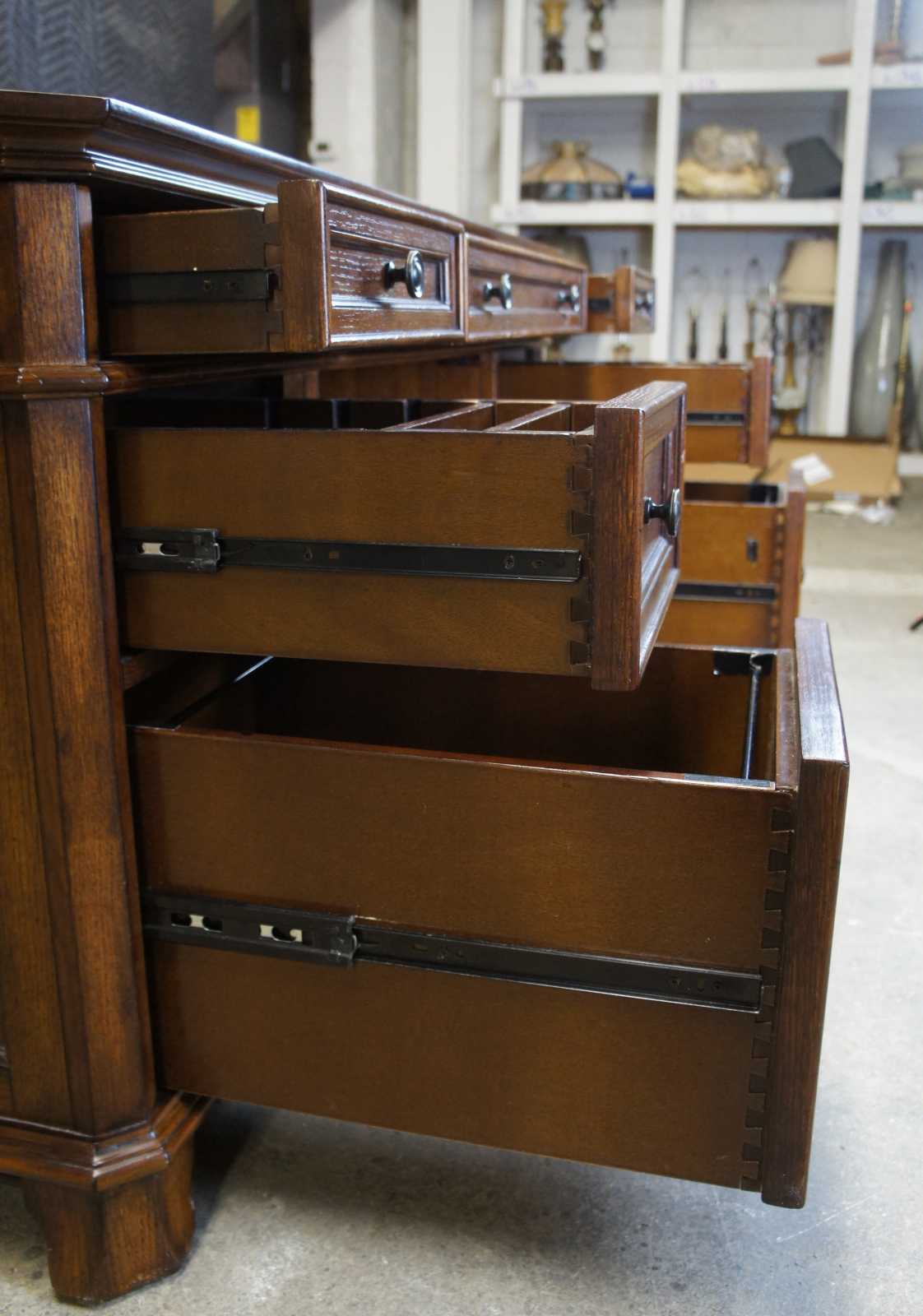 All drawers are built using English dovetail joinery techniques – a hallmark of quality furniture construction. In addition, the drawers are installed with full-extension metal ball-bearing slides that will provide years of reliable use. Finally, the desk is thoughtfuly appointed with metal drawer pulls with an antiqued bronze finish. No detail is left unattended in this exquisite executive desk.