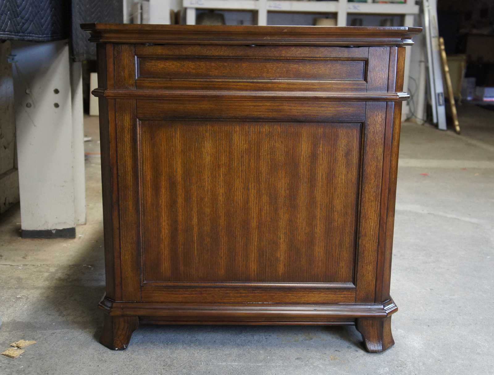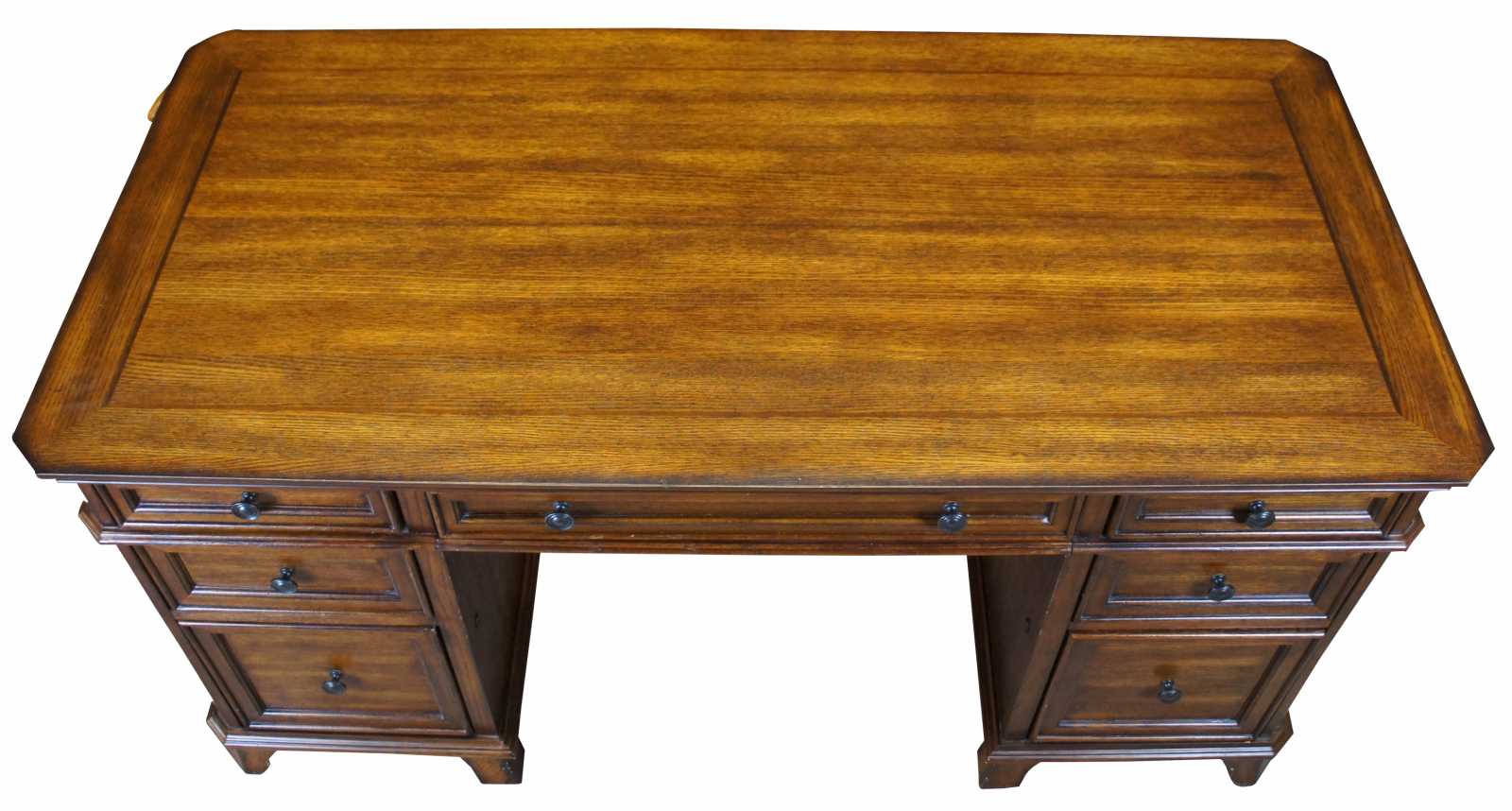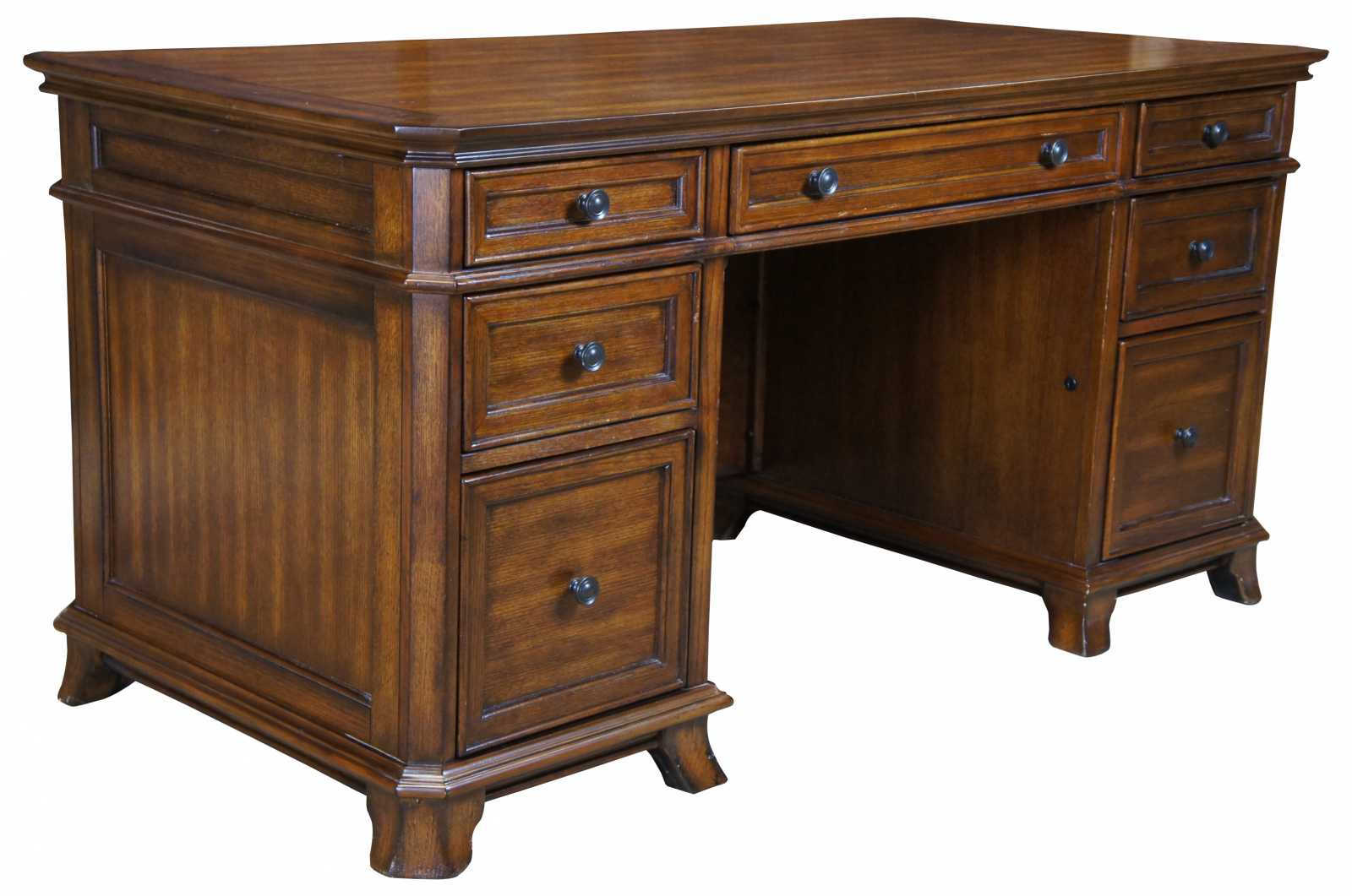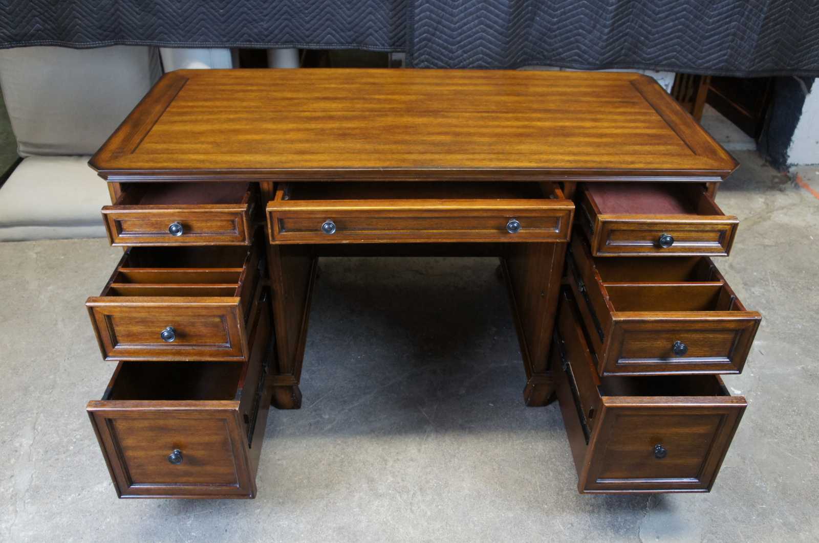 All drawers are built using English dovetail joinery techniques – a hallmark of quality furniture construction. In addition, the drawers are installed with full-extension metal ball-bearing slides that will provide years of reliable use. Finally, the desk is thoughtfuly appointed with metal drawer pulls with an antiqued bronze finish. No detail is left unattended in this exquisite executive desk.