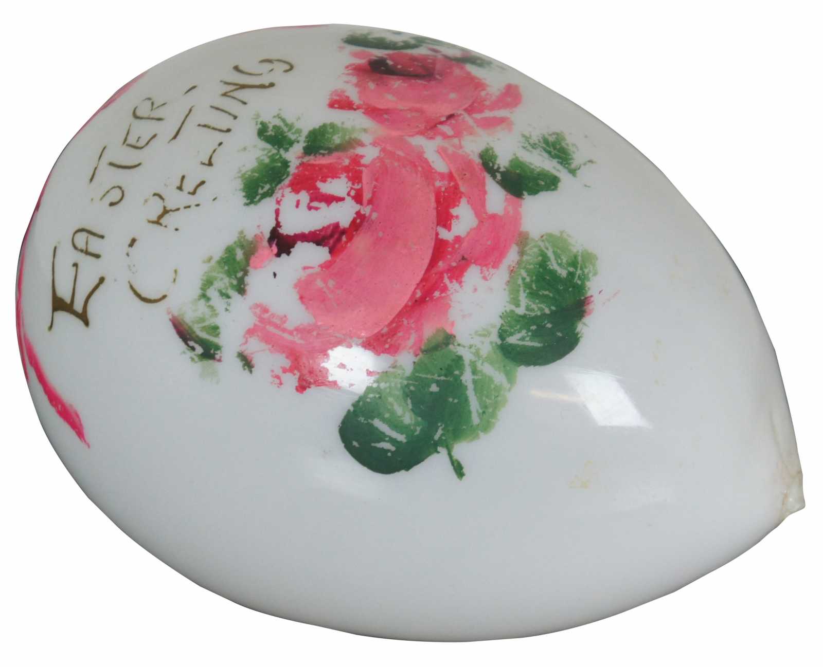 Antique Victorian hand blown and painted milk glass egg with “Easter Greeting” in gold letters, pink roses and a pink ribbon tied in a bow.