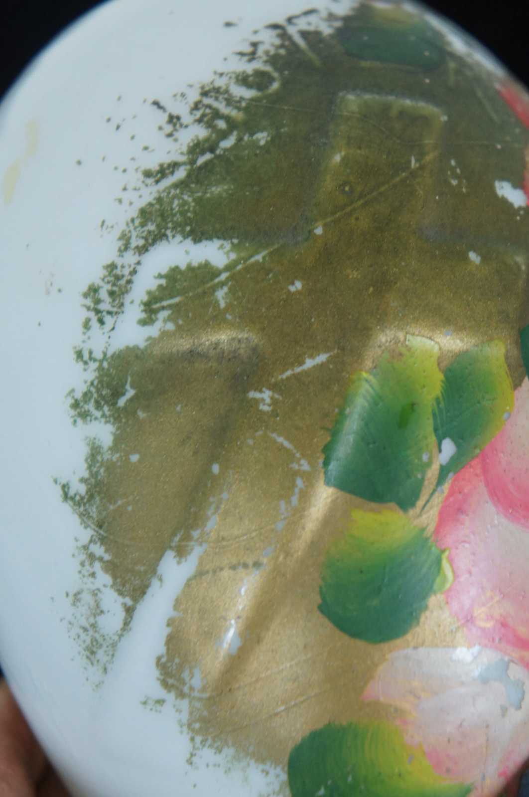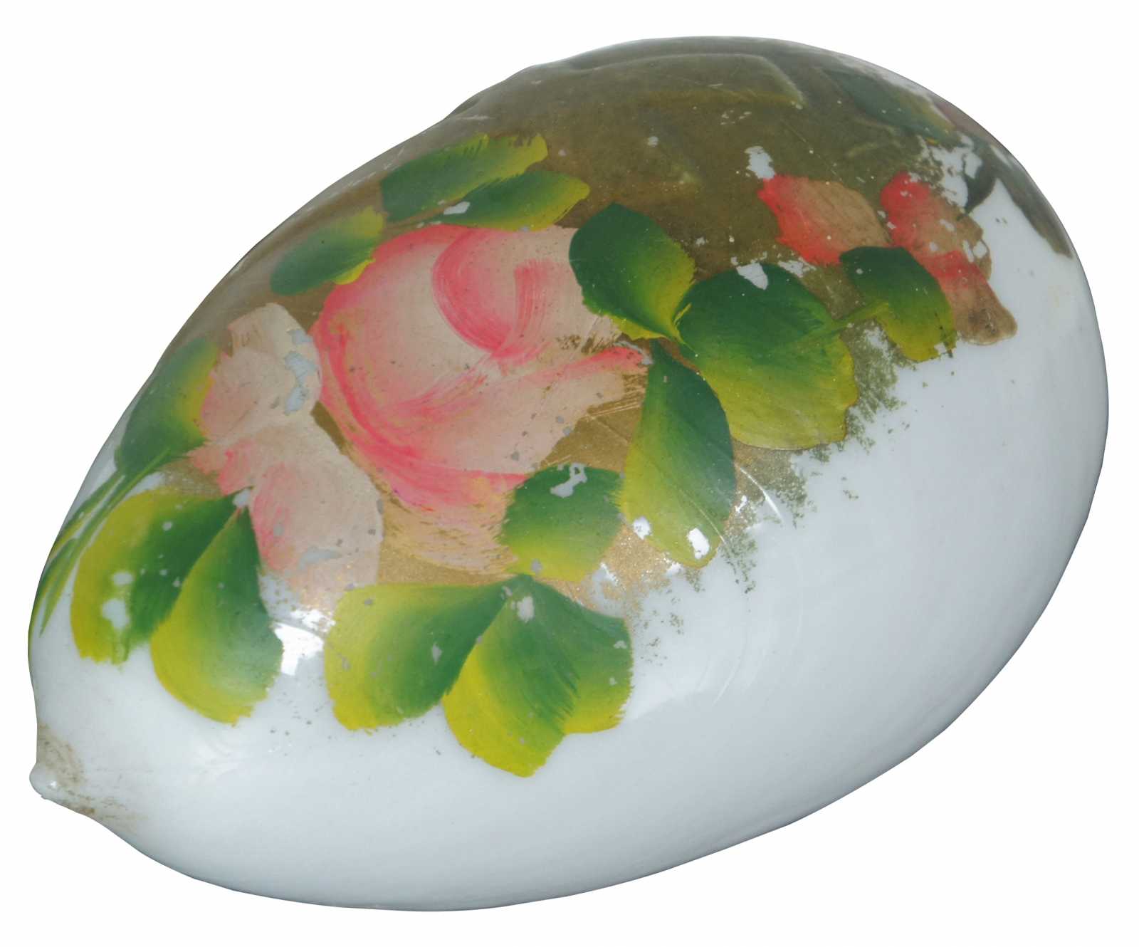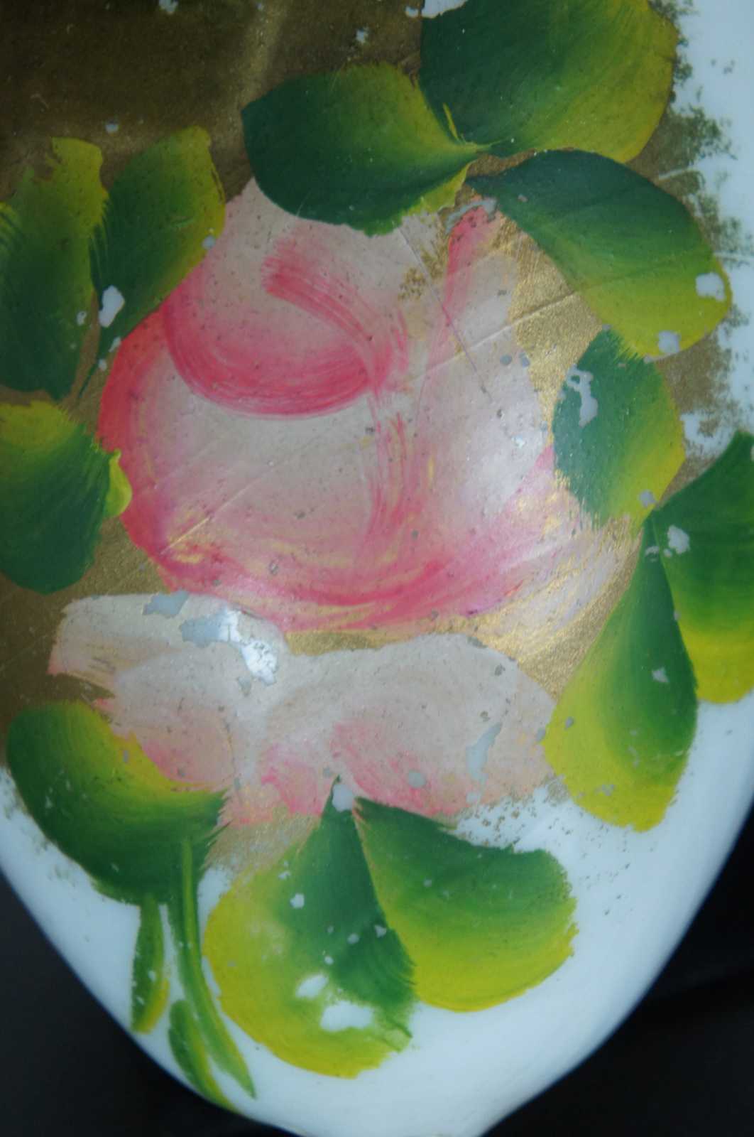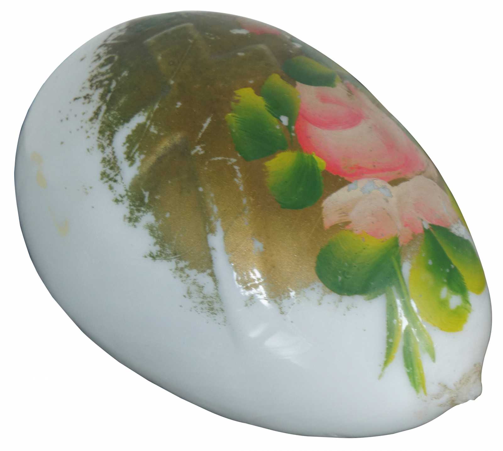 Antique Victorian hand blown and painted milk glass egg with a raised golden cross and pink roses and leaves.