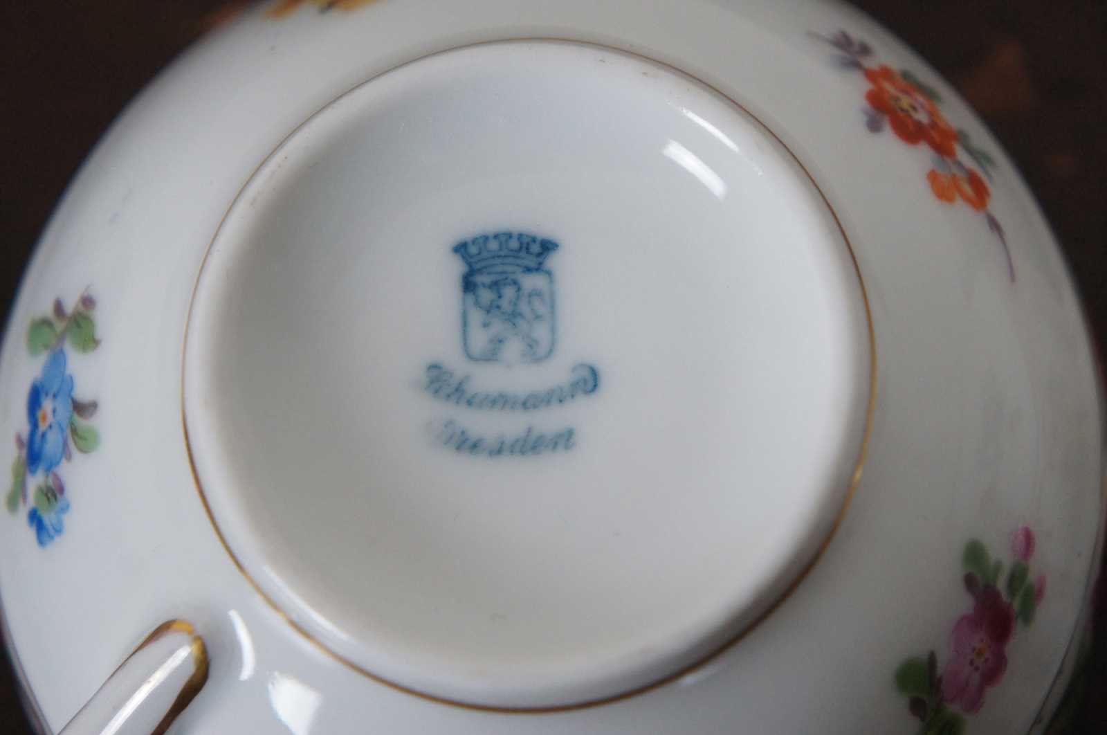 4 saucers and 6 cups by Shumann Bavaria, and 3 saucers and 3 cups from Schumann Dresden all in the Empress floral pattern.