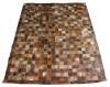 Vintage cow hide patchwork area rug featuring geometric squares of brown, white and black.