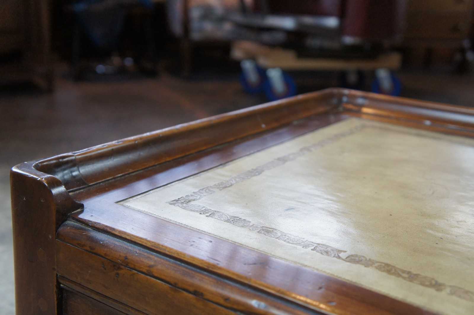 Circa 1980s John Widdicomb Coffee Table. Made from walnut with carved accents and a tooled leather inset top. Features a rectangular form over cabriole legs. Draws inspiration from Louis XV and Provincial Styling. John Widdicomb of Grand Rapids, Michigan operated from 1897-2002.