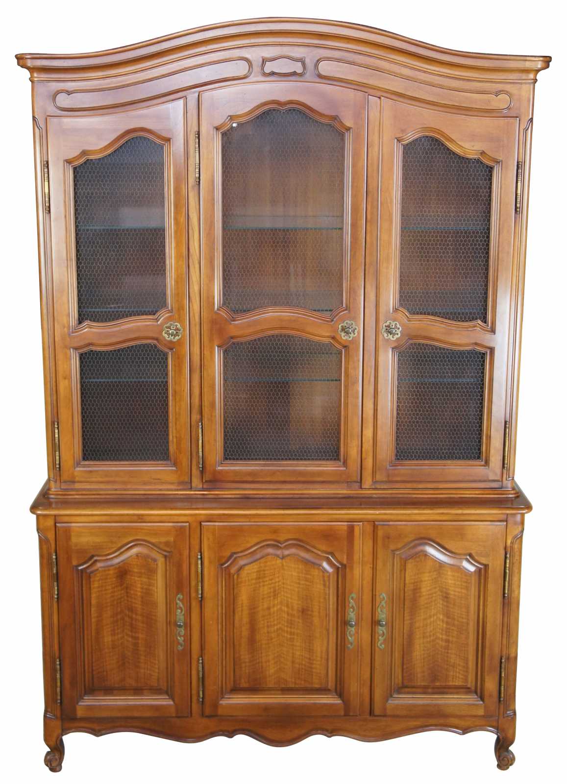 Circa 1980s John Widdicomb china cabinet. Made from walnut with serpentine shape, mesh / wire doors with three illuminated glass shelves, four silverware drawers and a cabinet. Draws inspiration from Louis XV and French Country / Provincial Styling. John Widdicomb of Grand Rapids, Michigan operated from 1897-2002.