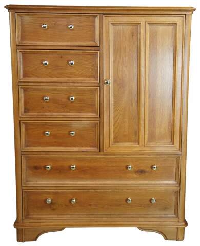 American Country chifferobe by Bernhardt. Circa 1990s. Made from Oak with six drawers, a cabinet with shelves for storage and brass hardware.