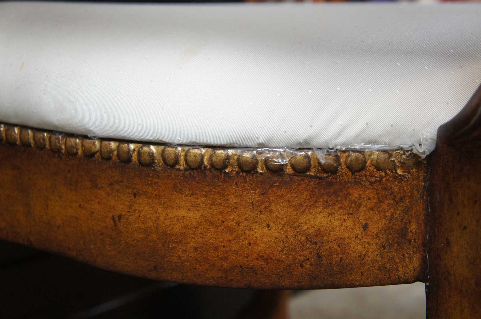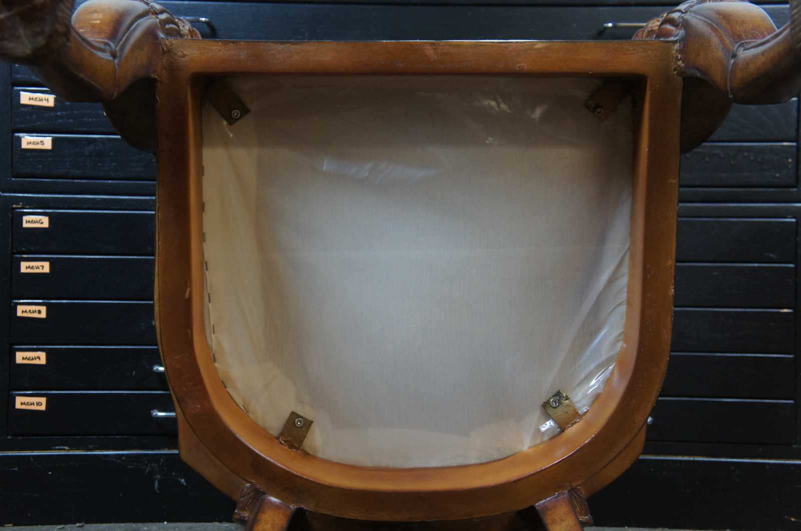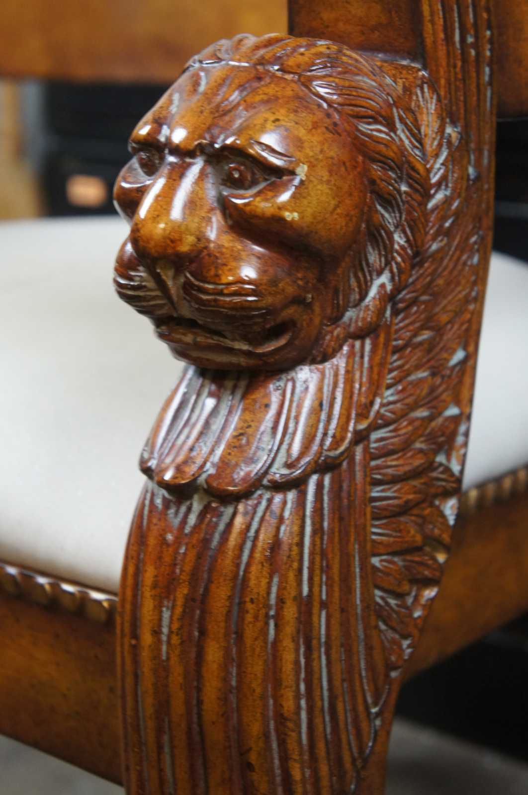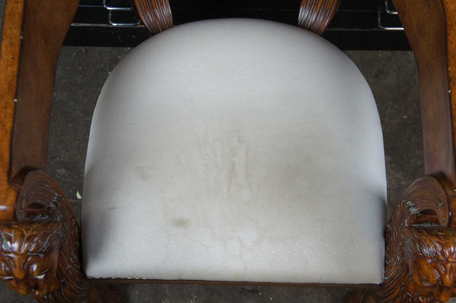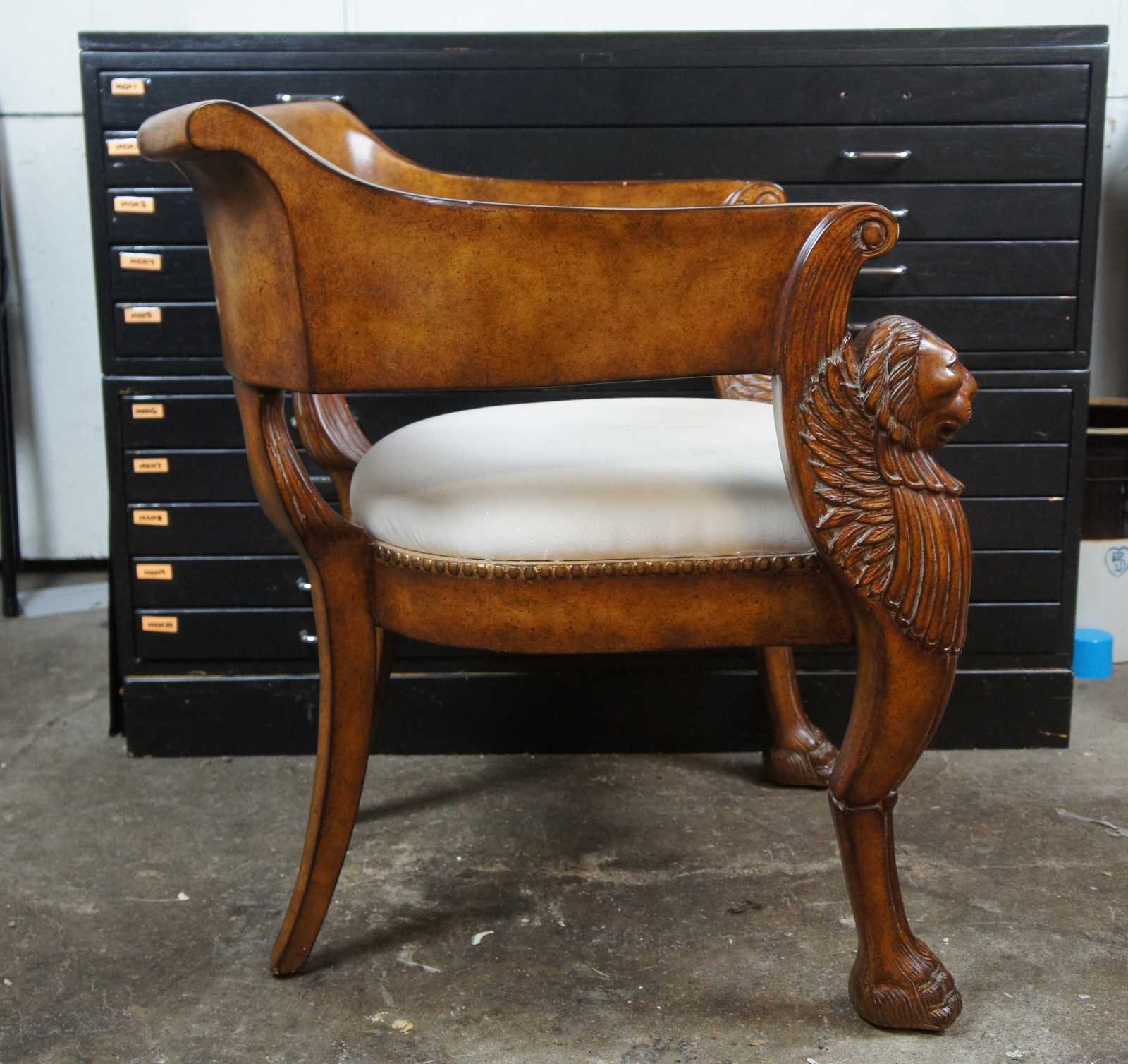 Vintage Egyptian inspired arm chair with sphinx shaped columns supporting the arms and a white upholstered seat with nailhead trim leading to flaired legs and paw / claw feet. Very heavy chair.