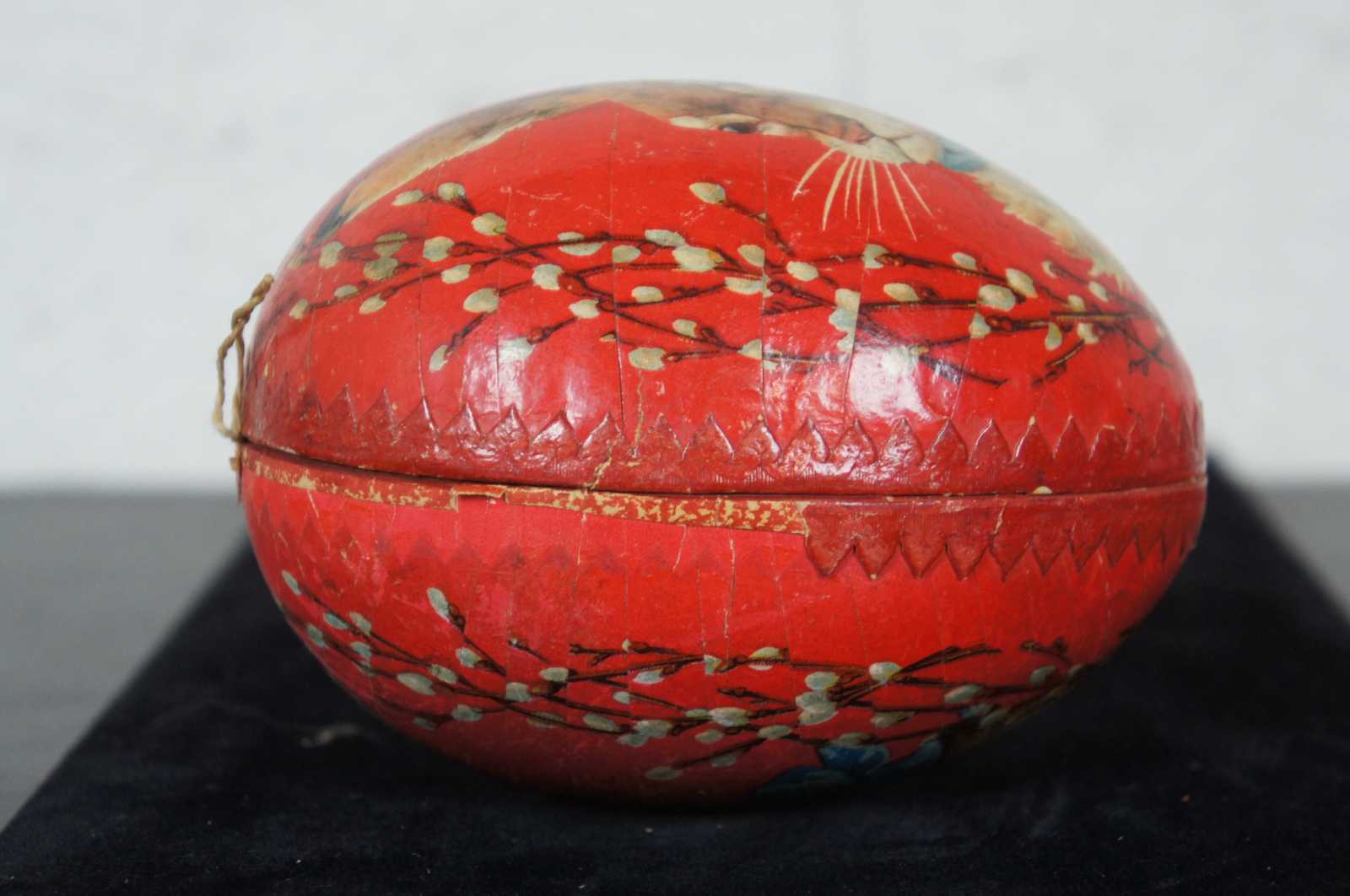 Antique German red paper mache Easter egg candy container, featuring a lithograph of a rabbit wearing a blue bow, framed by pussy willows, with paper lace trim around the inside edge.