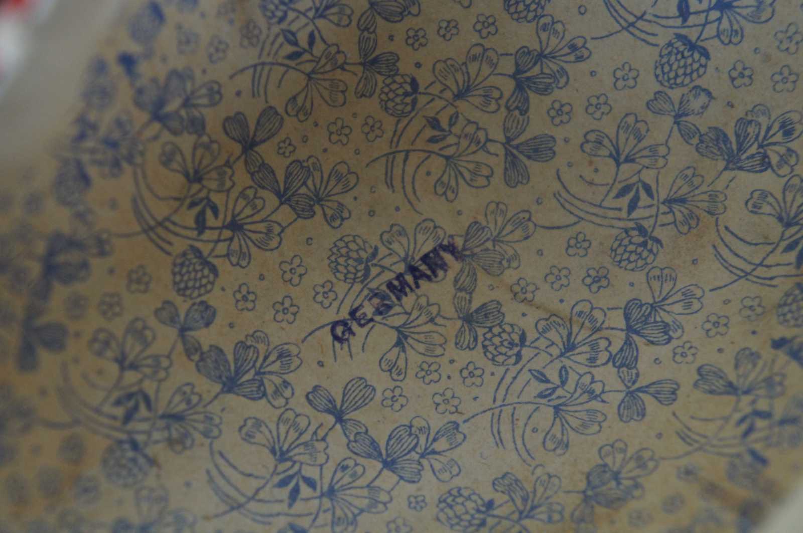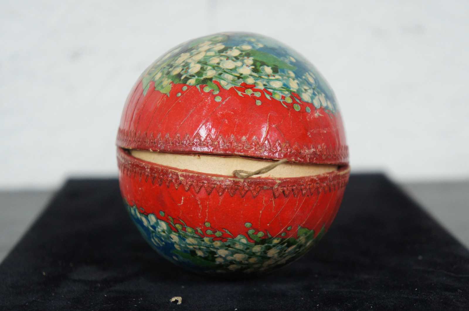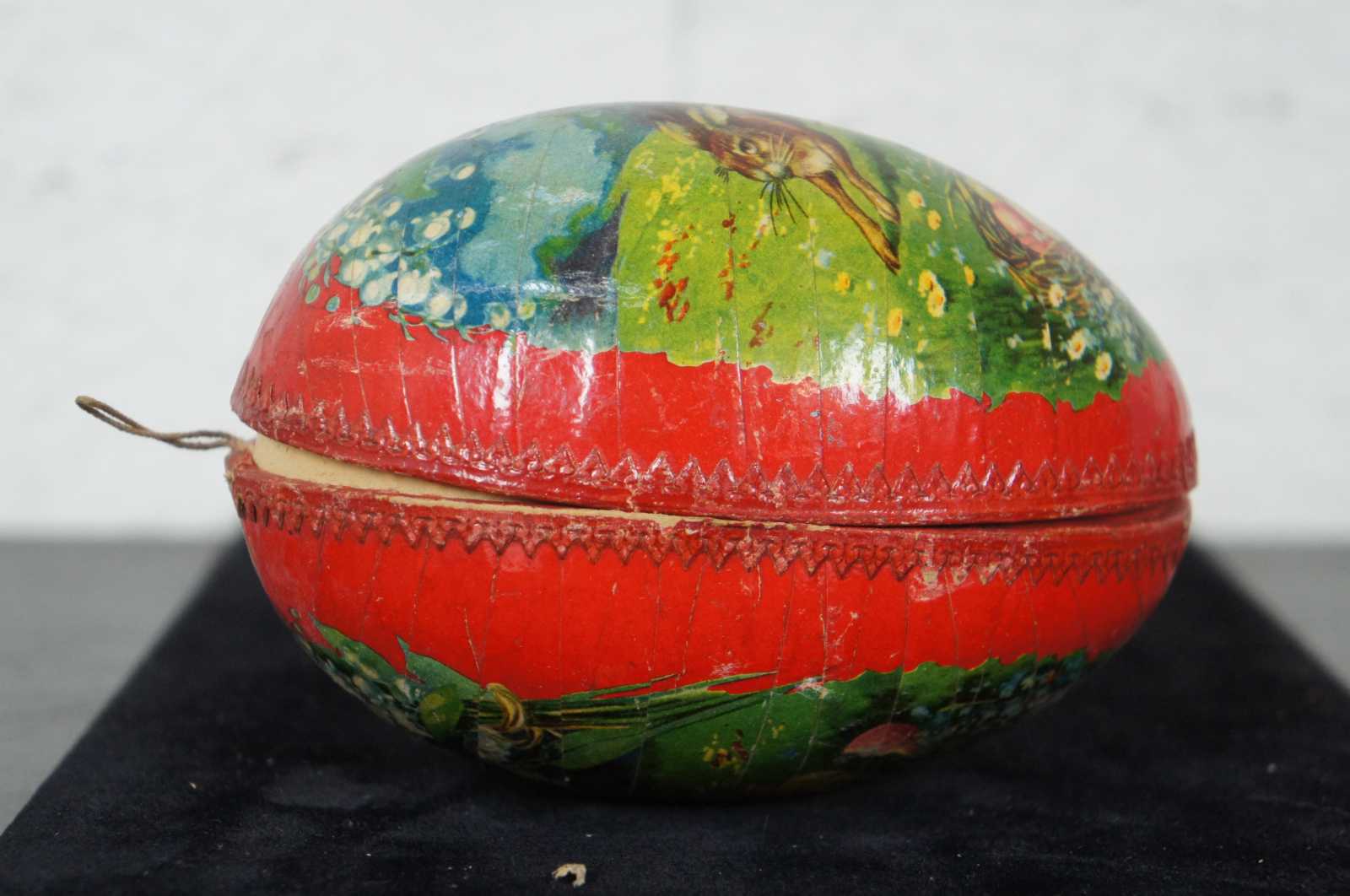 Antique German paper mache Easter egg candy container, featuring a lithograph landscape of a rabbit leaping beneath lily of the valley blossoms, past a chick by a nest of Easter eggs.