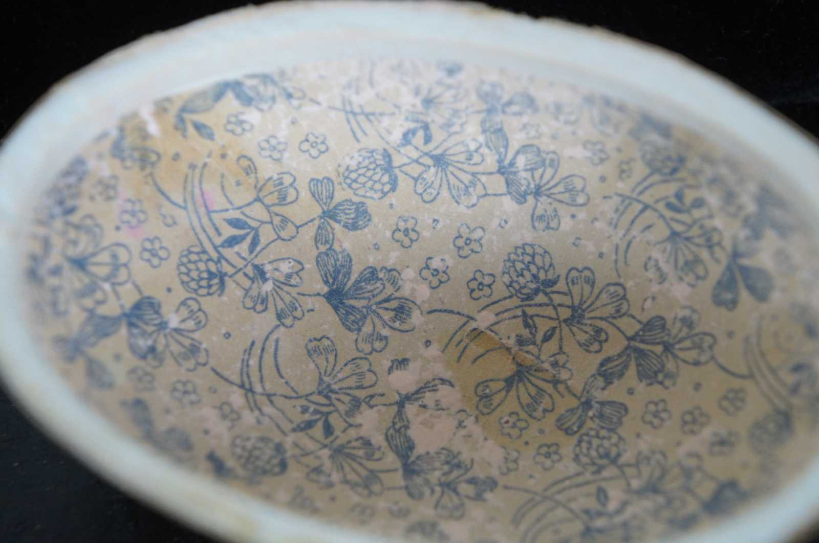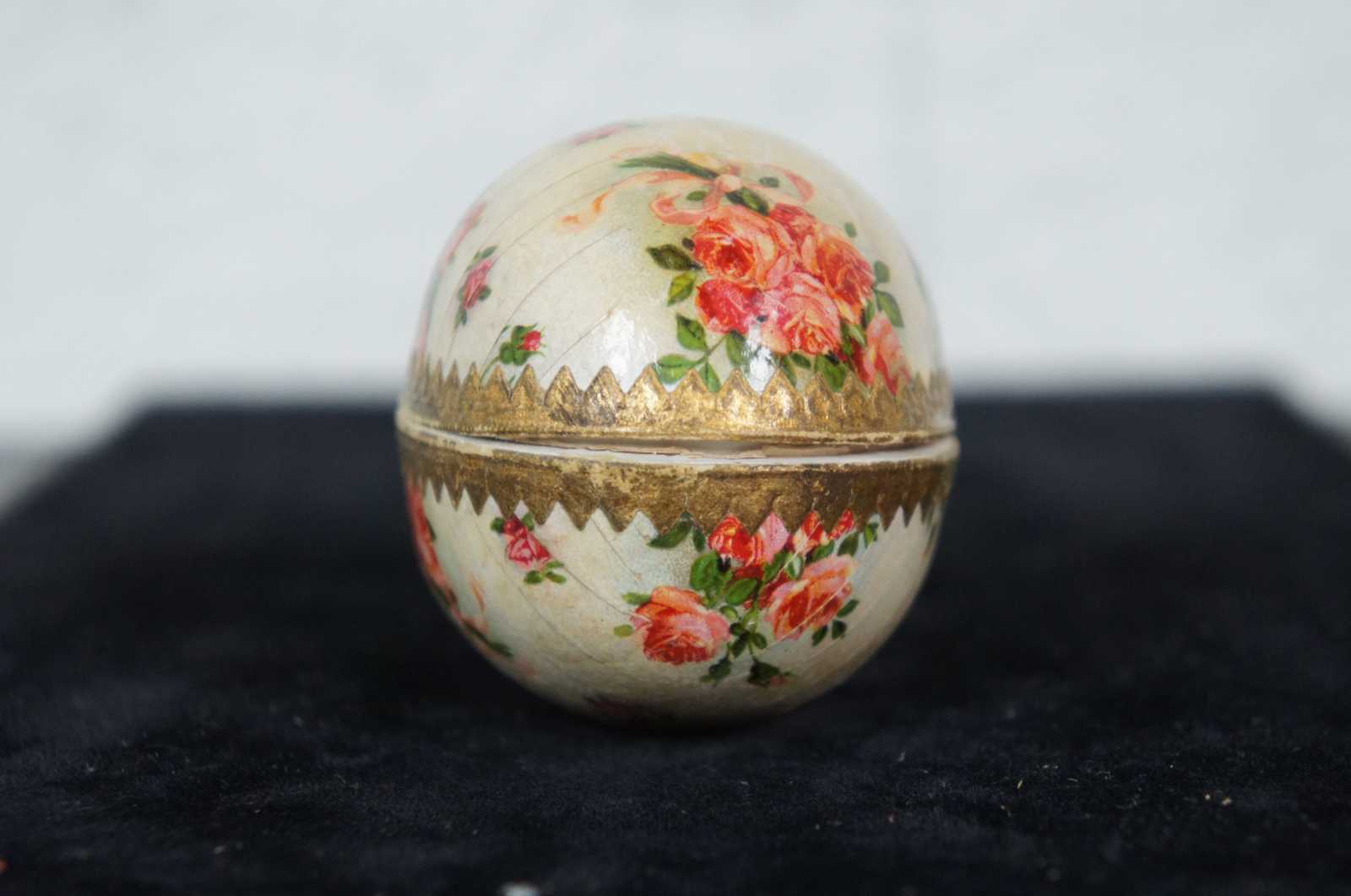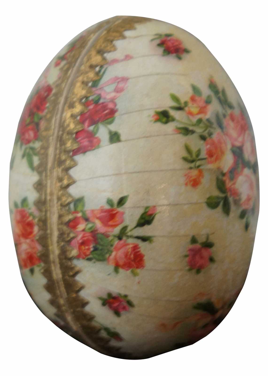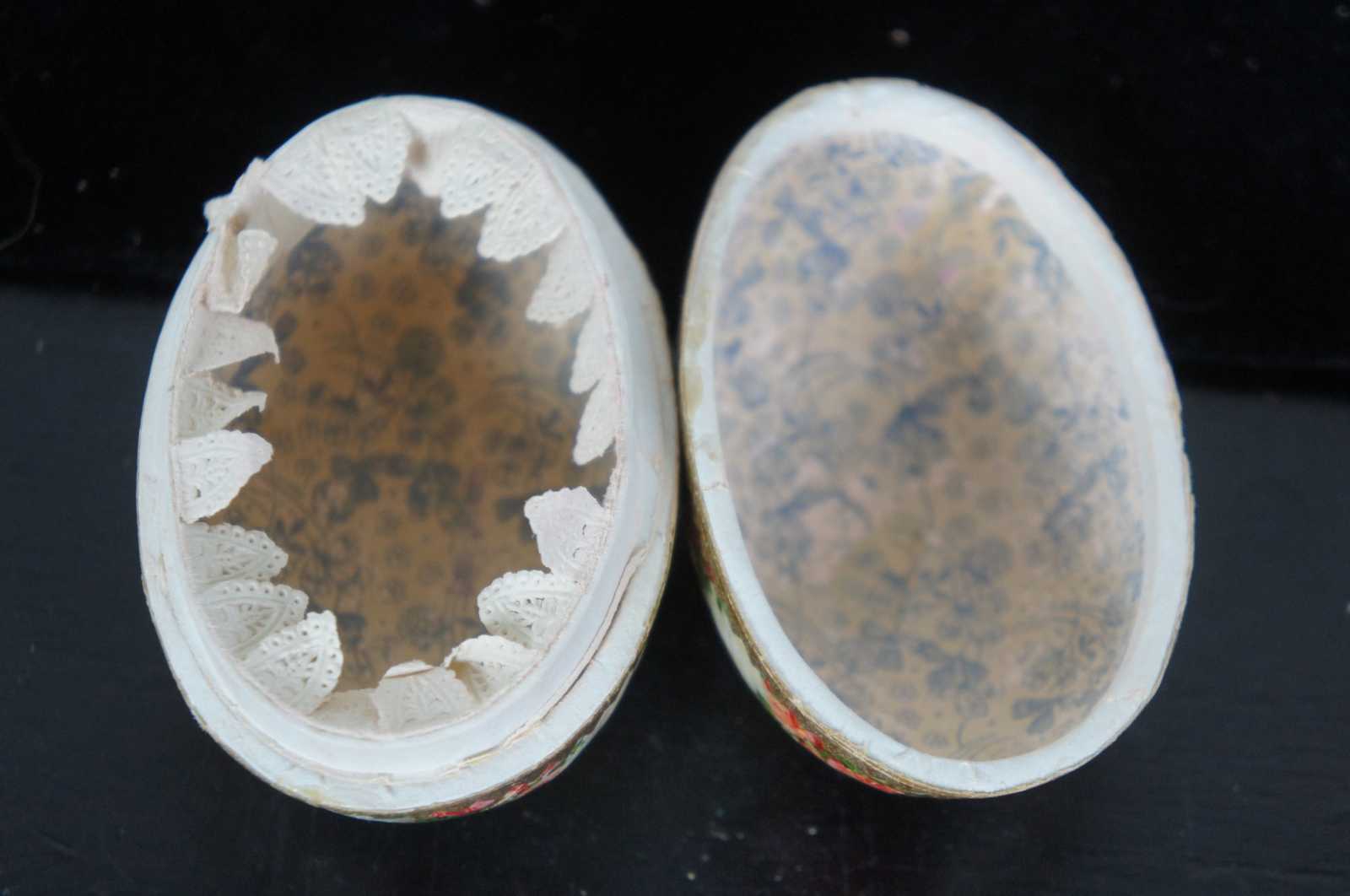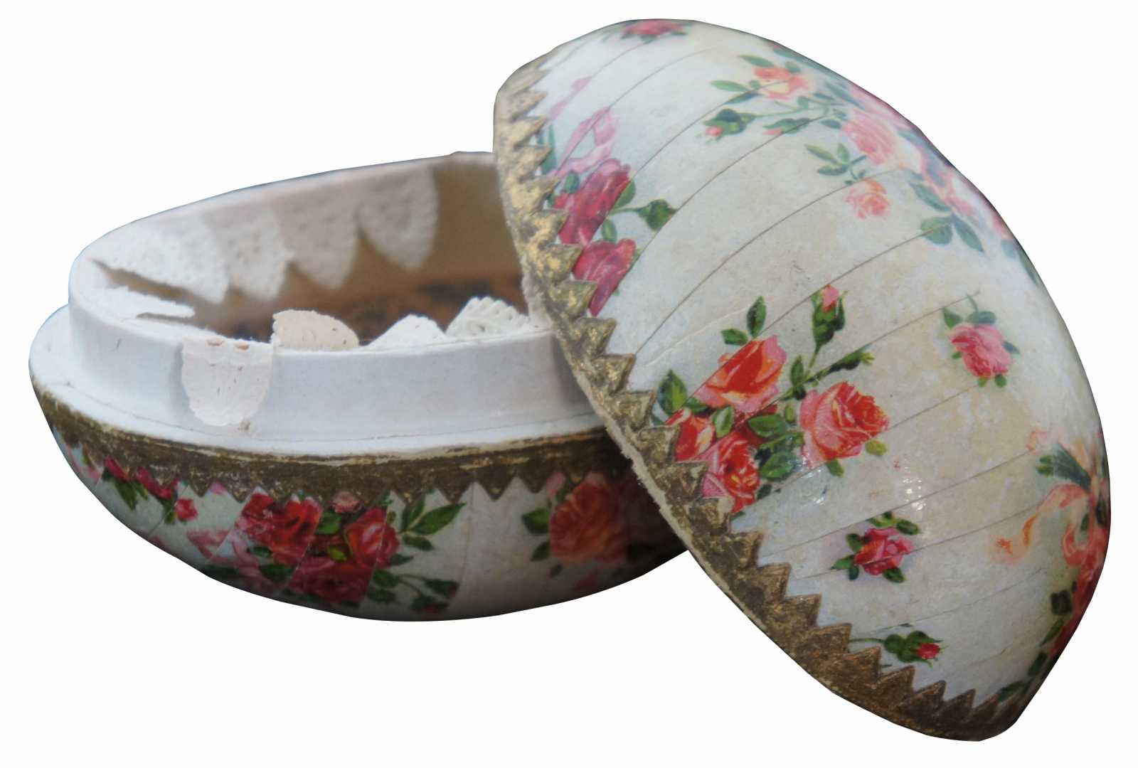 Antique German paper mache Easter egg candy container, featuring a lithograph pattern of pink and peach roses, with paper lace trim around the inside edge.