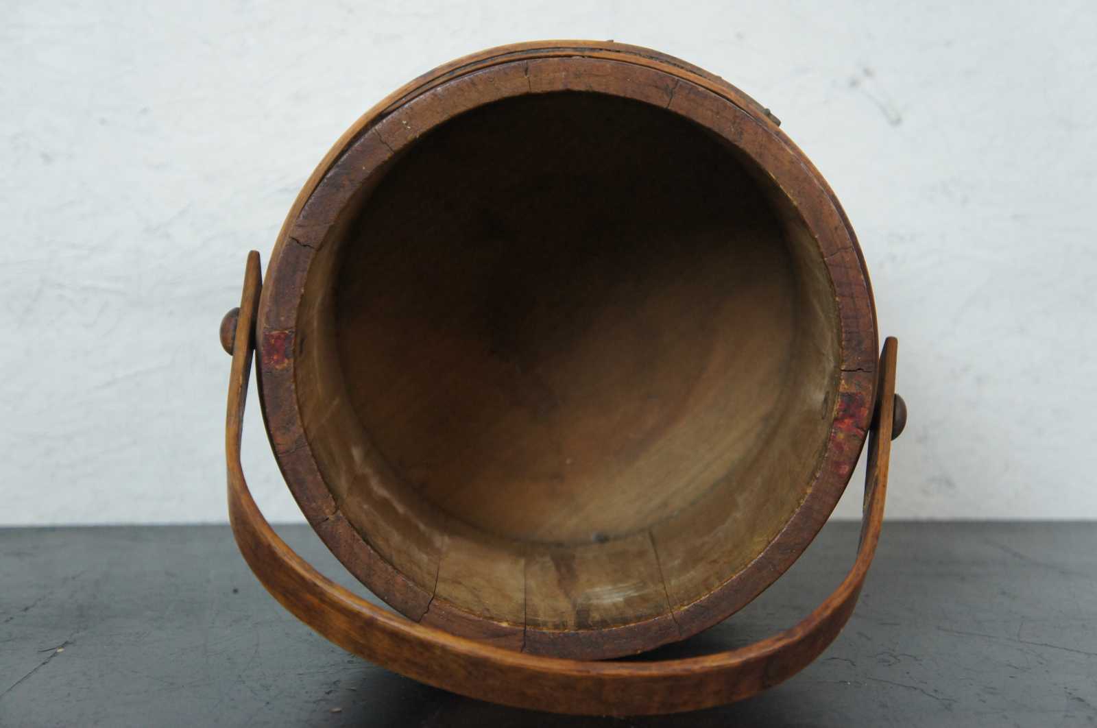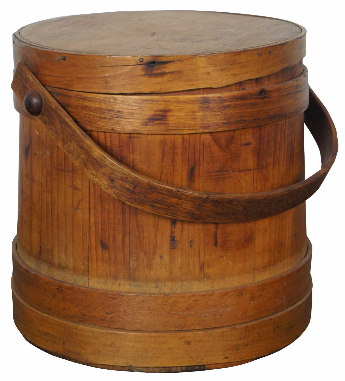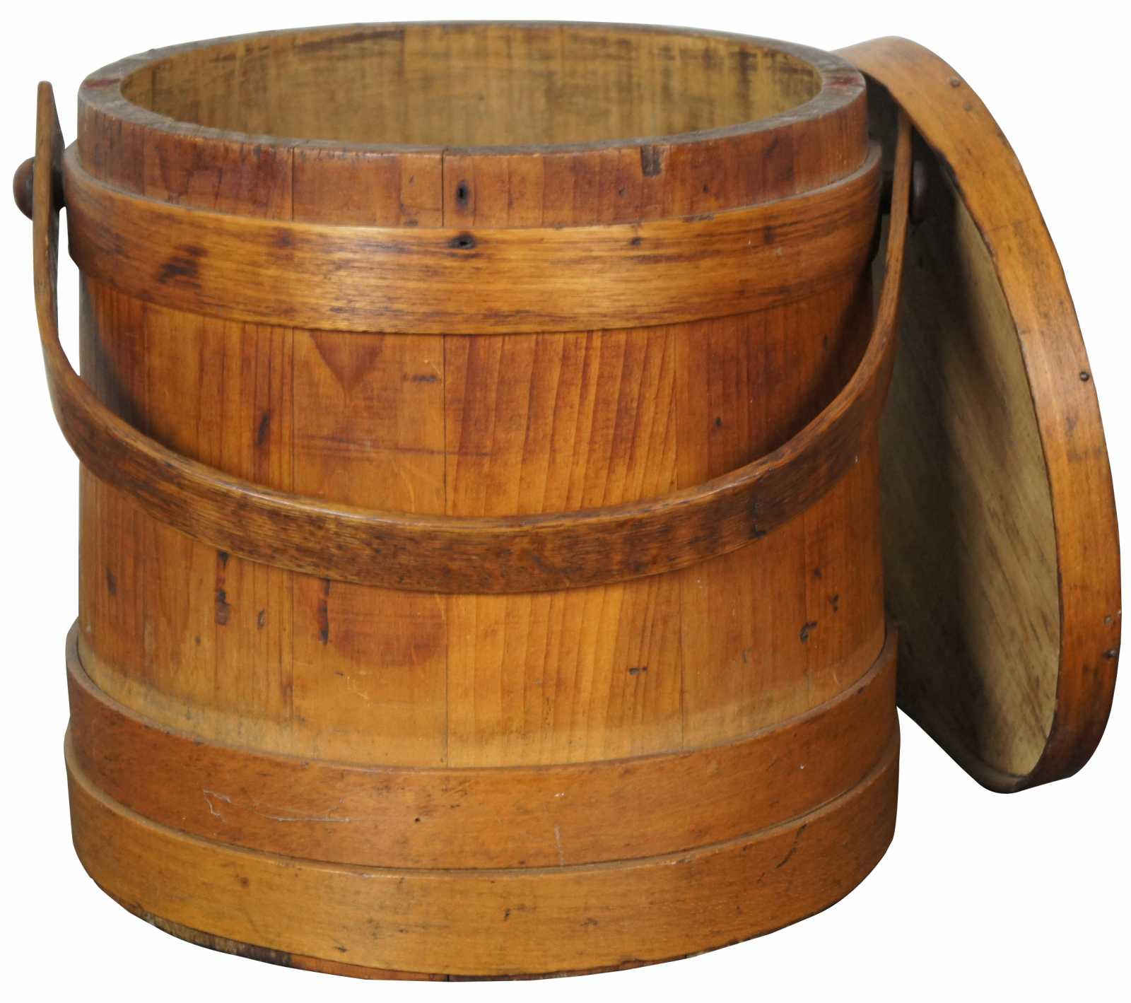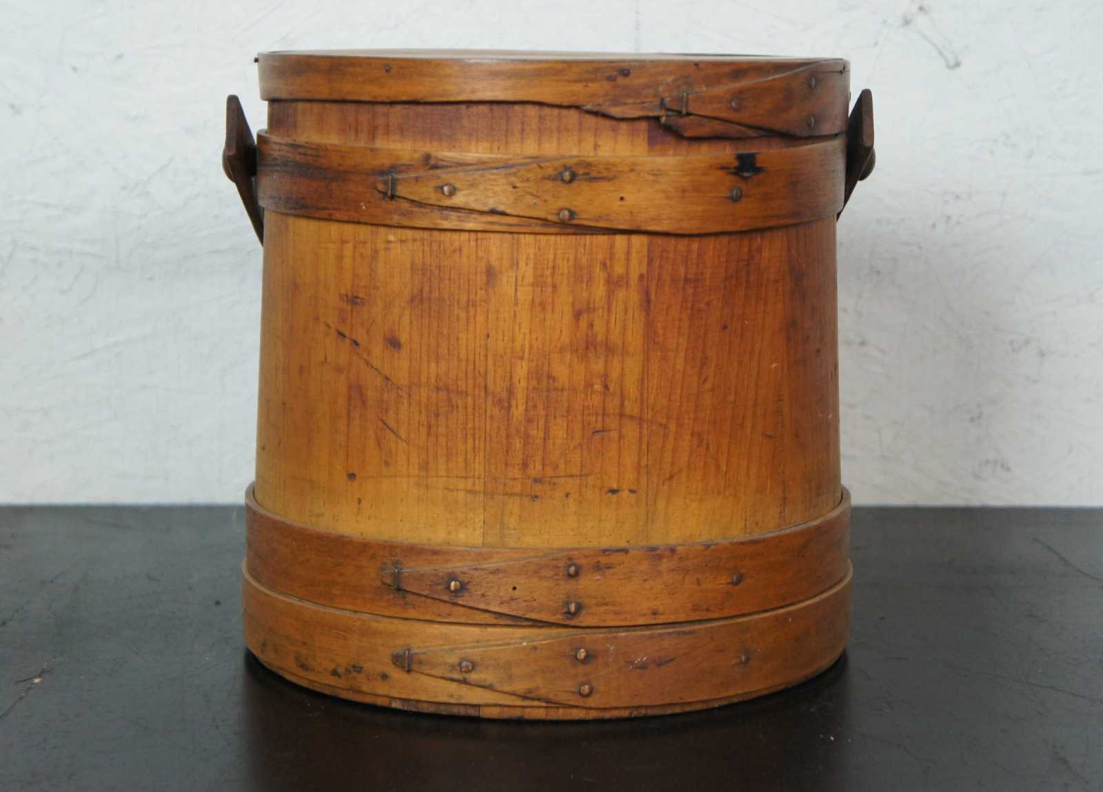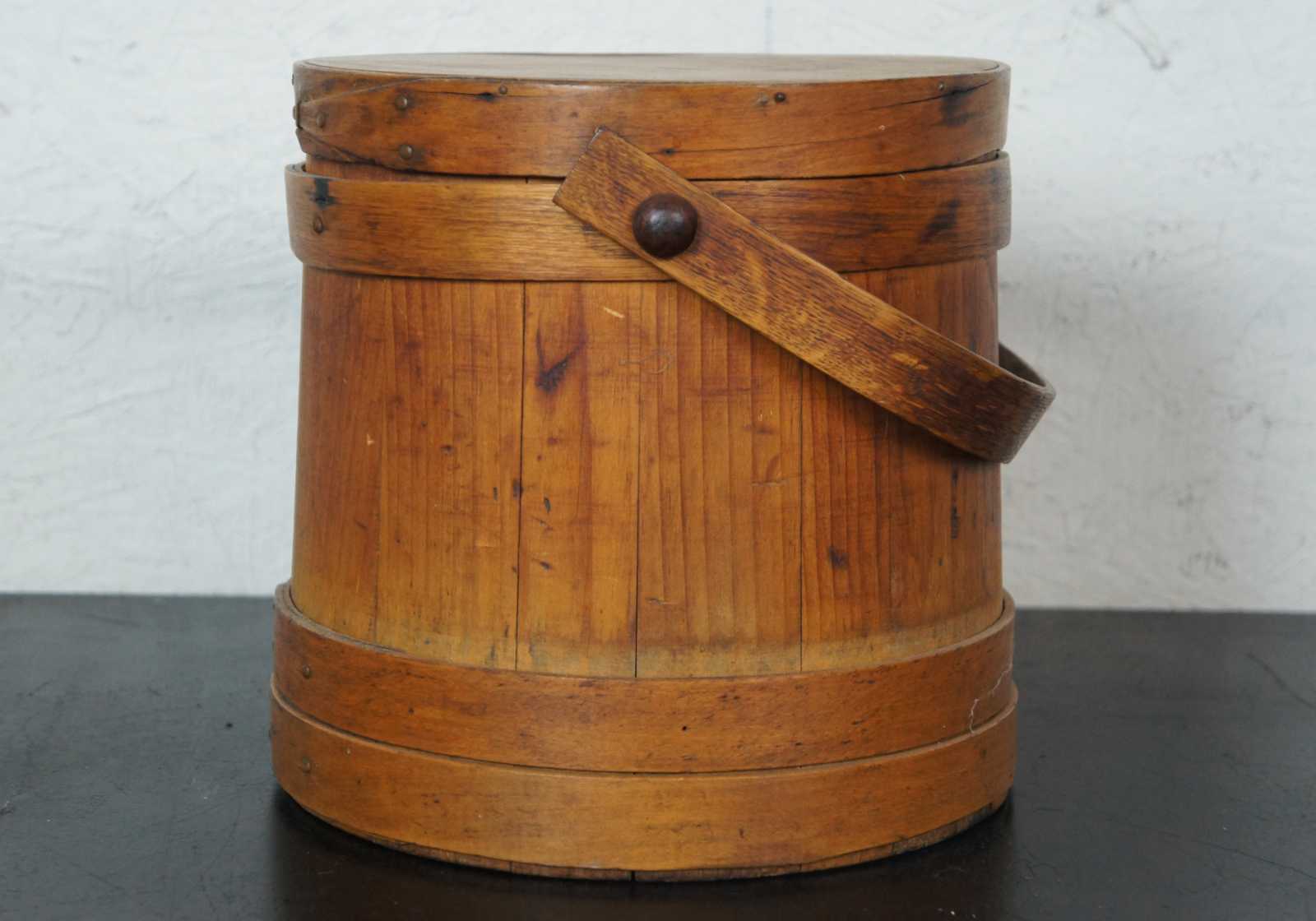 Antique wooden sugar bucket or firkin with rotating handle and lid.
