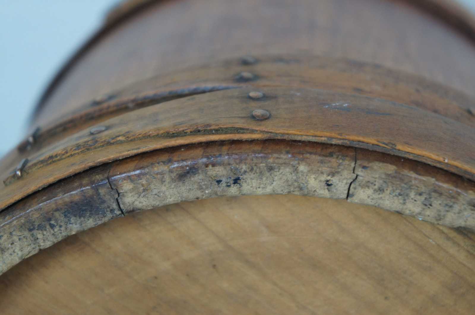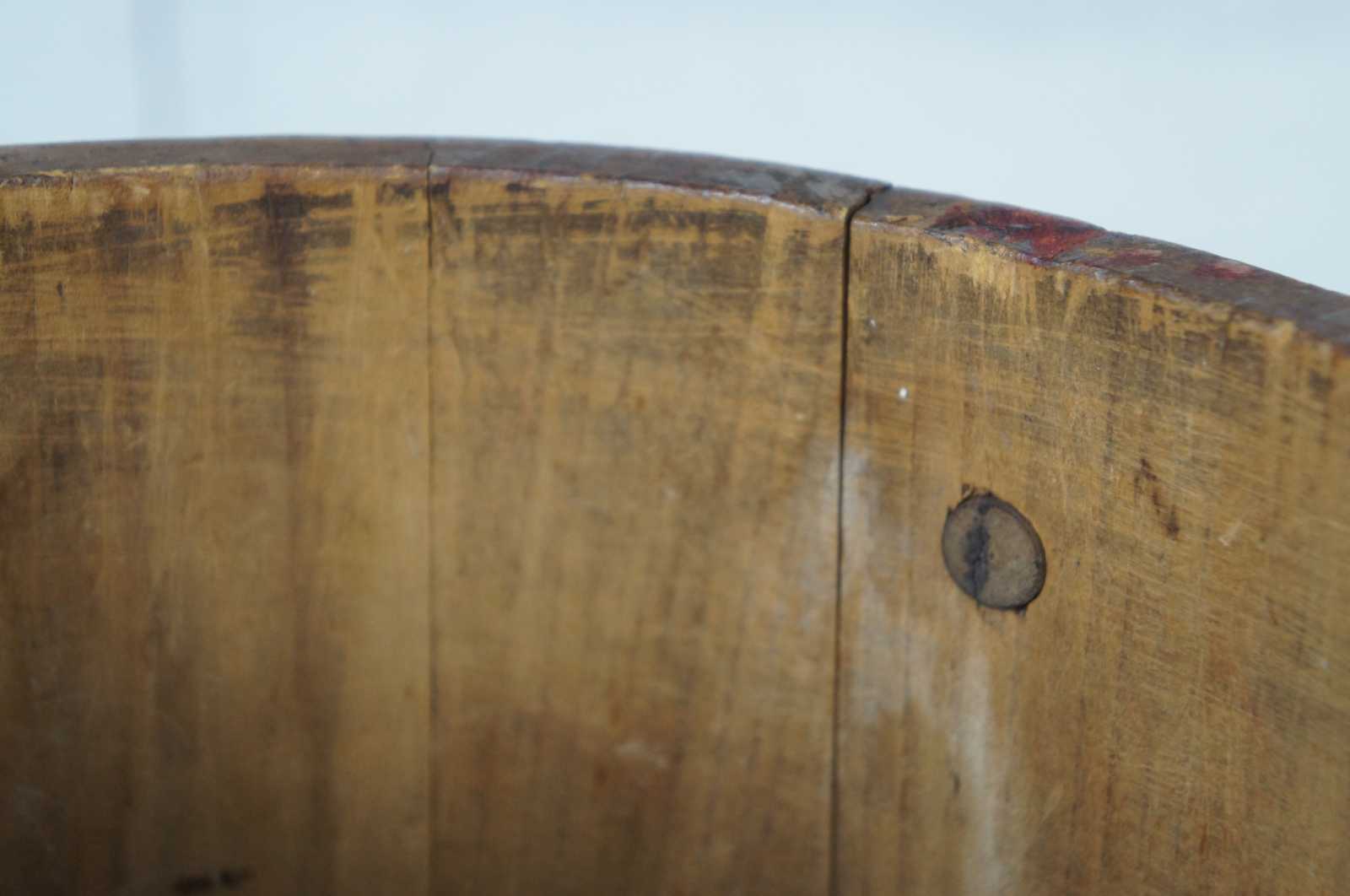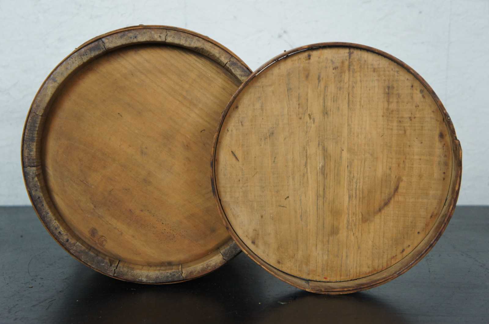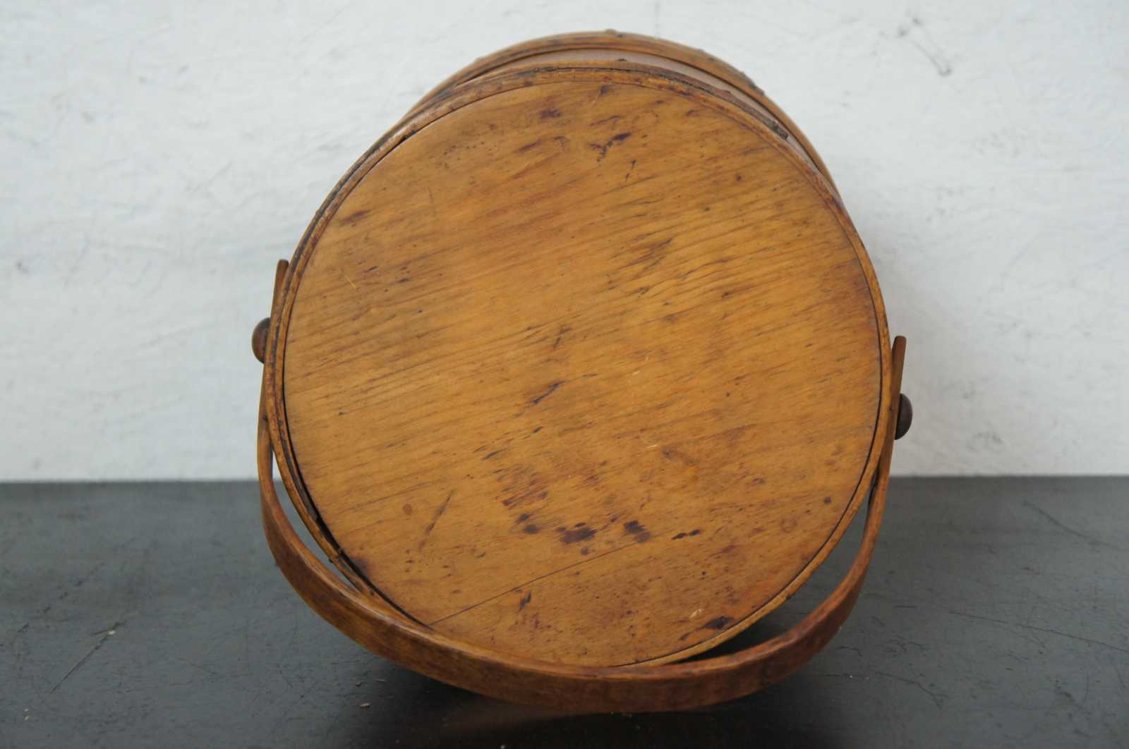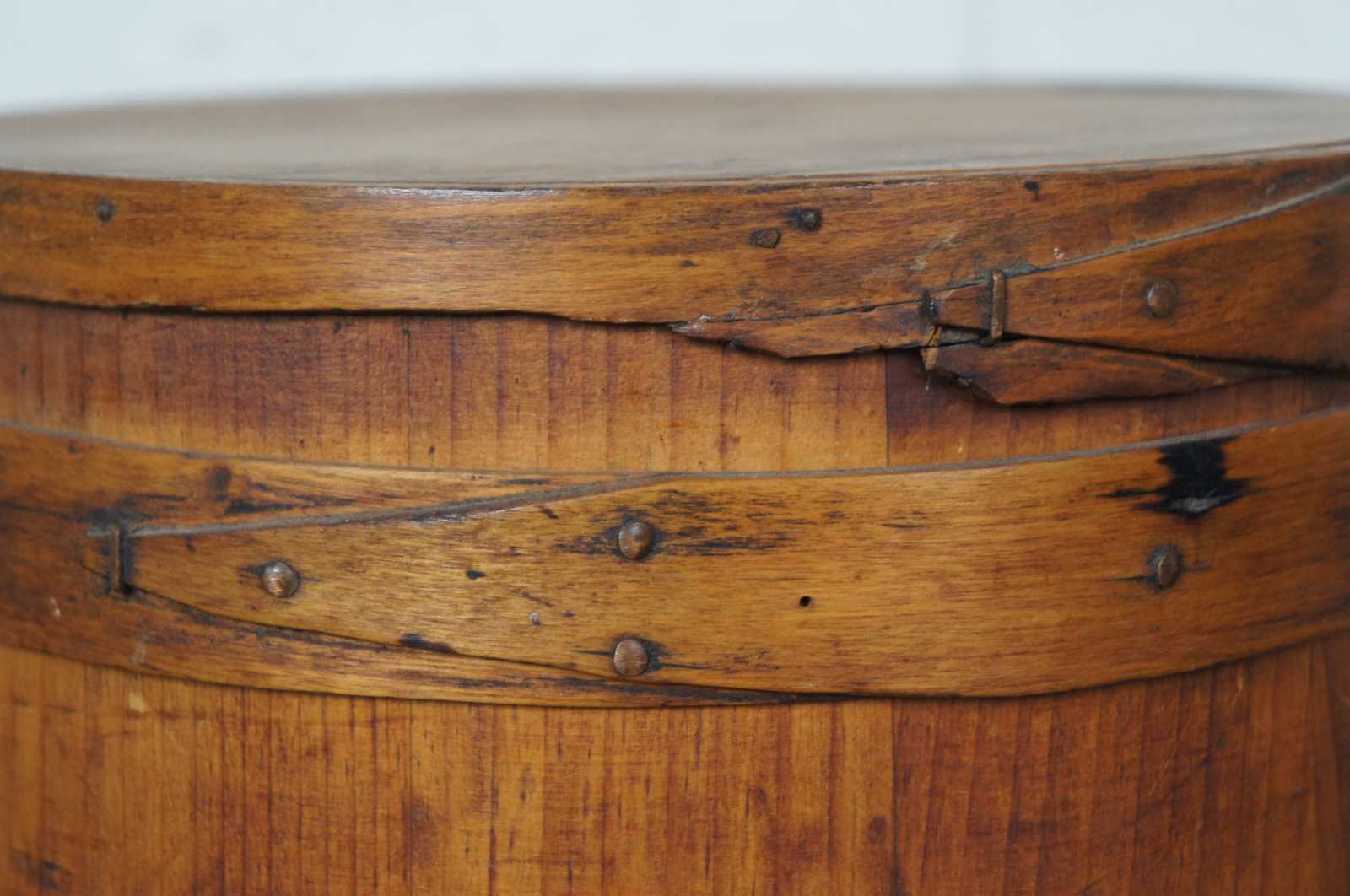 Antique wooden sugar bucket or firkin with rotating handle and lid.