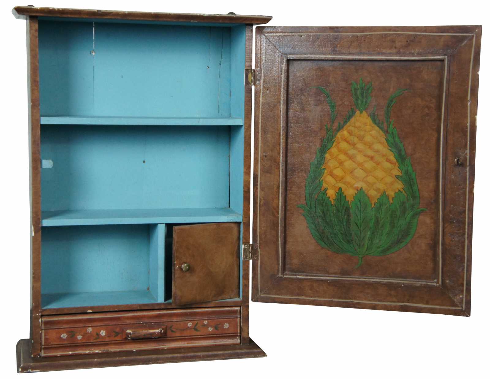 Antique wooden wall hanging medicine cabinet painted with flower accents and a central panel painted to look like the cabinet is full of objects and a sleeping cat. Interior is painted blue with a pineapple on the back of the door.