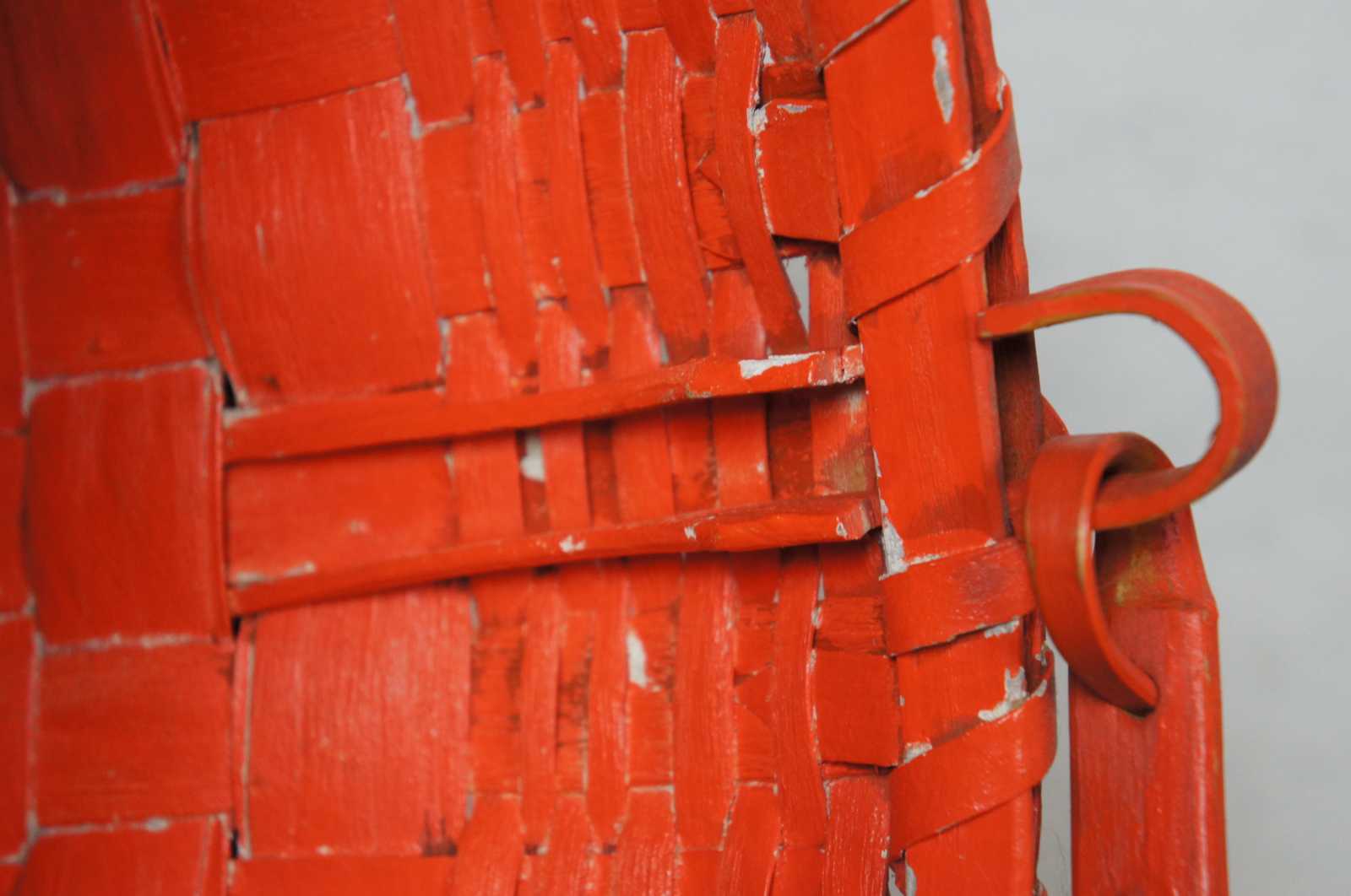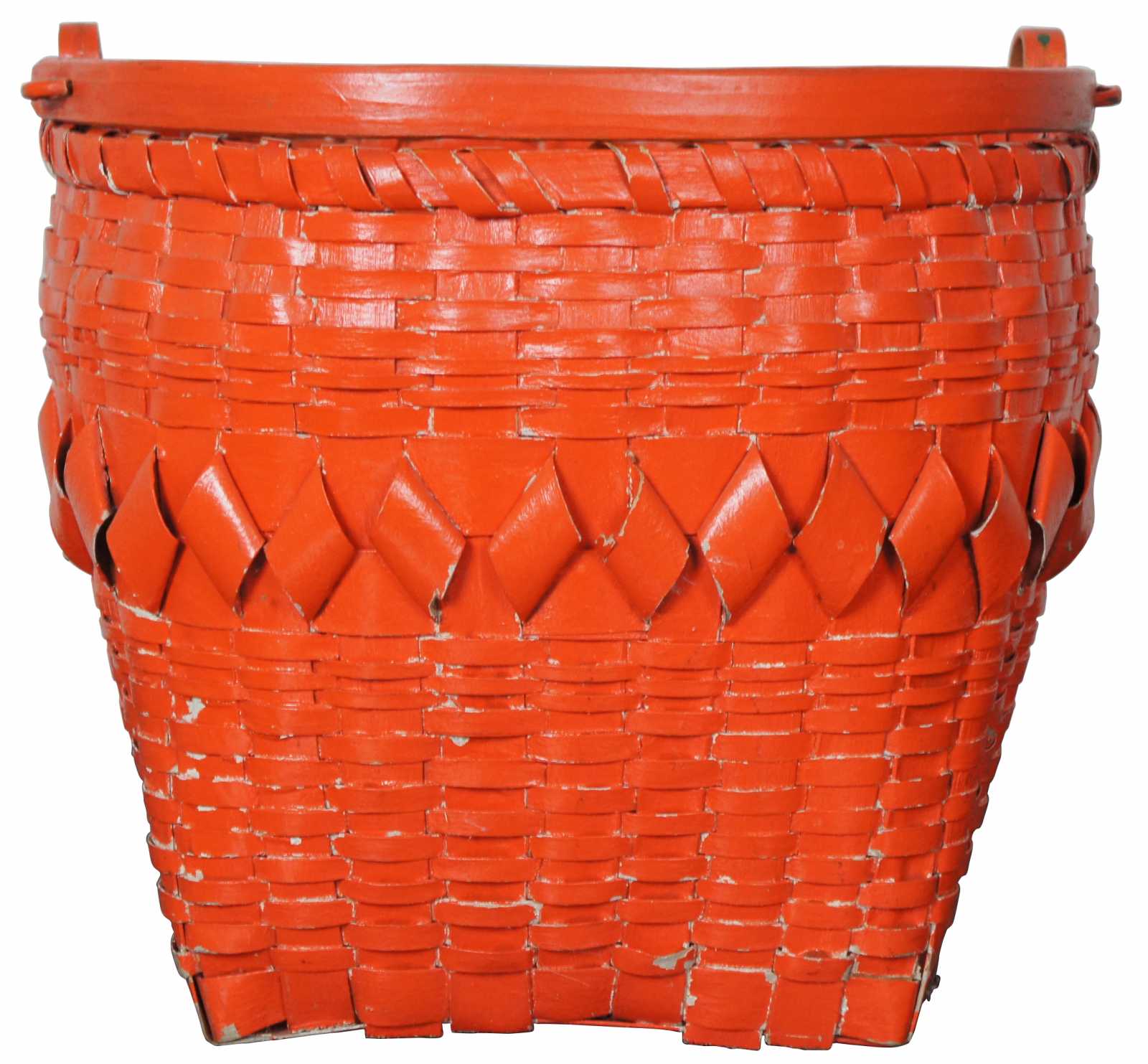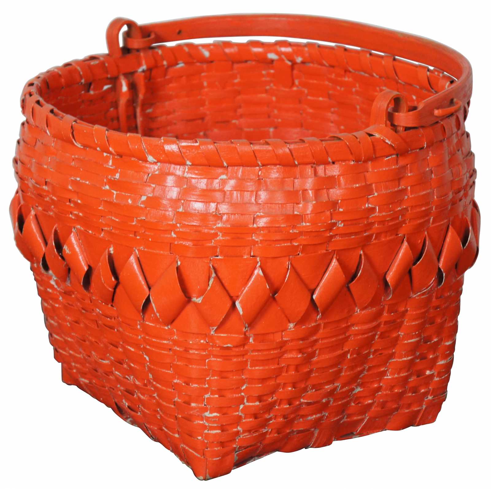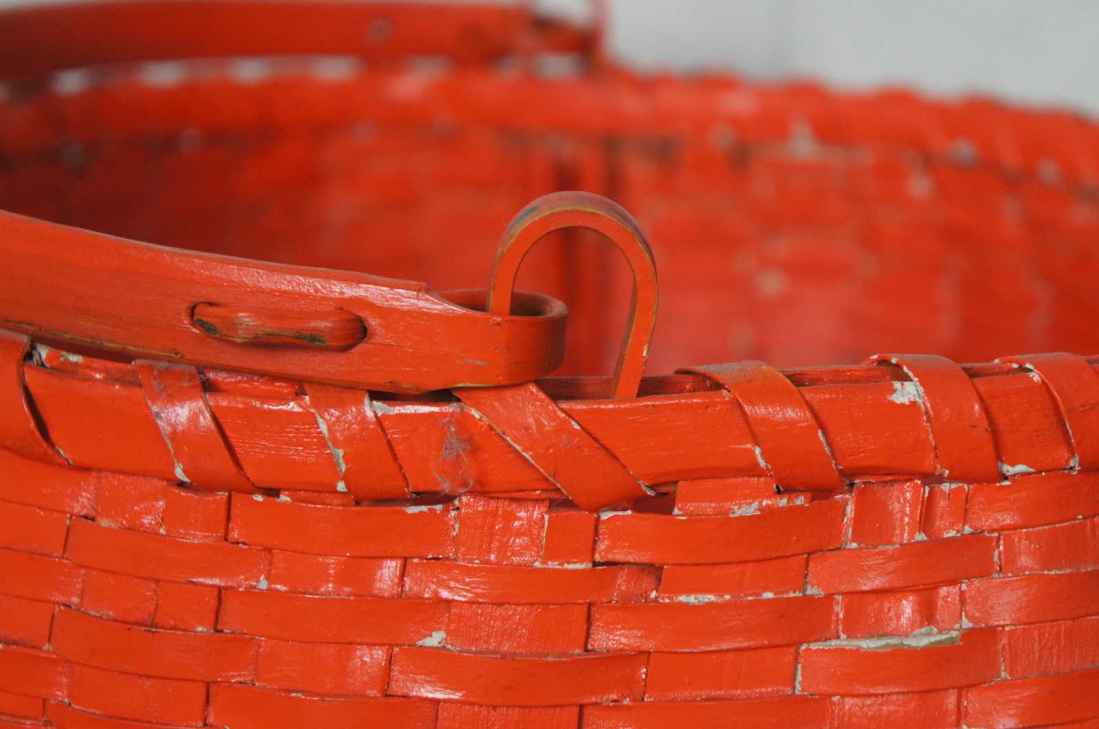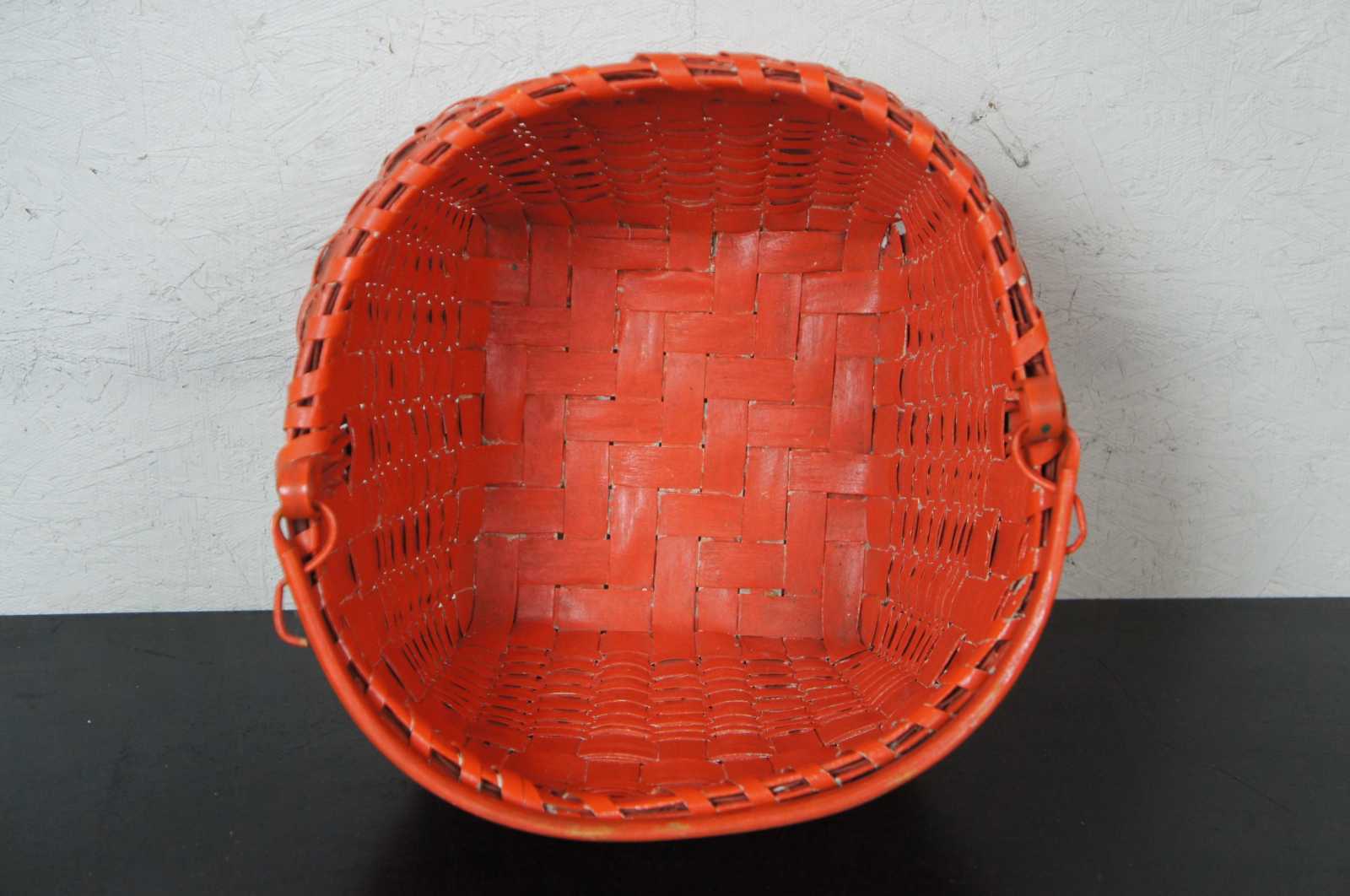 Antique woven wicker burnt orange painted bushel basket with rotating bentwood swing handle.