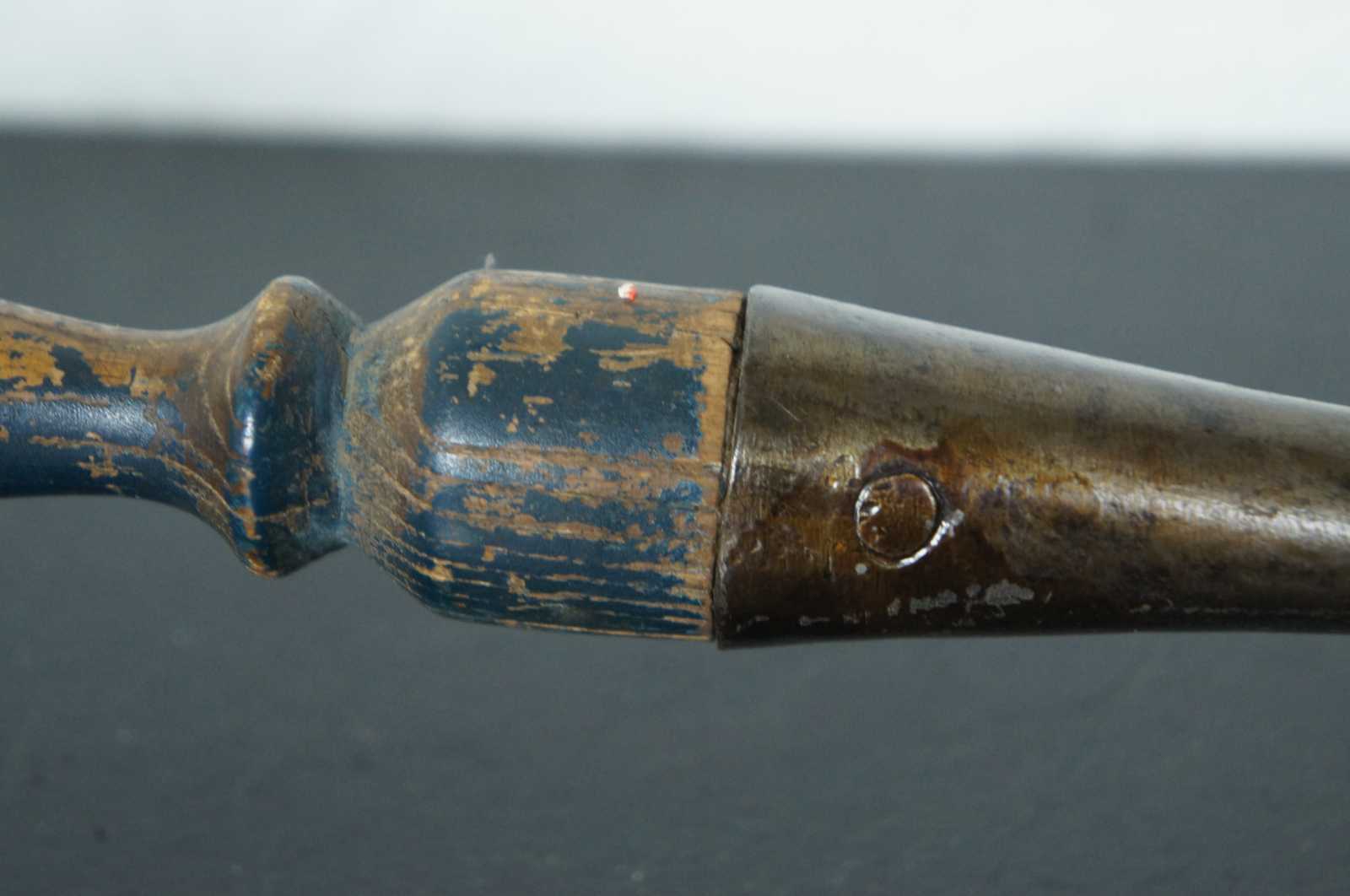Antique brass Early American coal shovel with blue painted wooden handle and hanging hook.