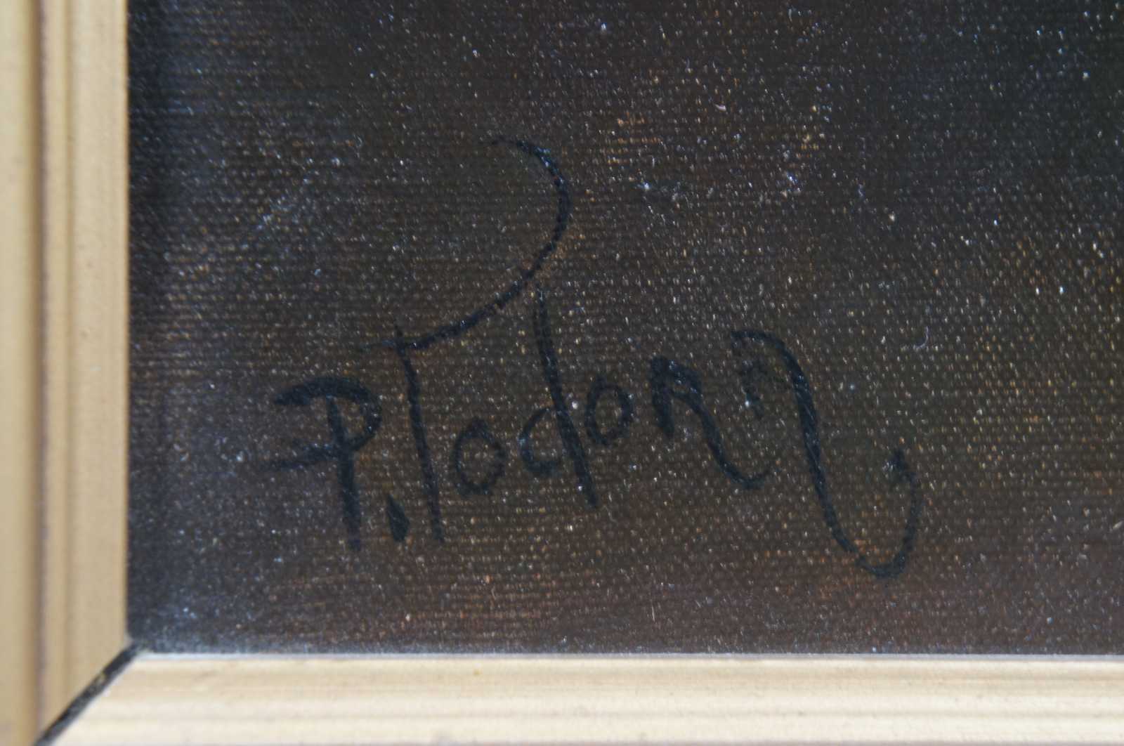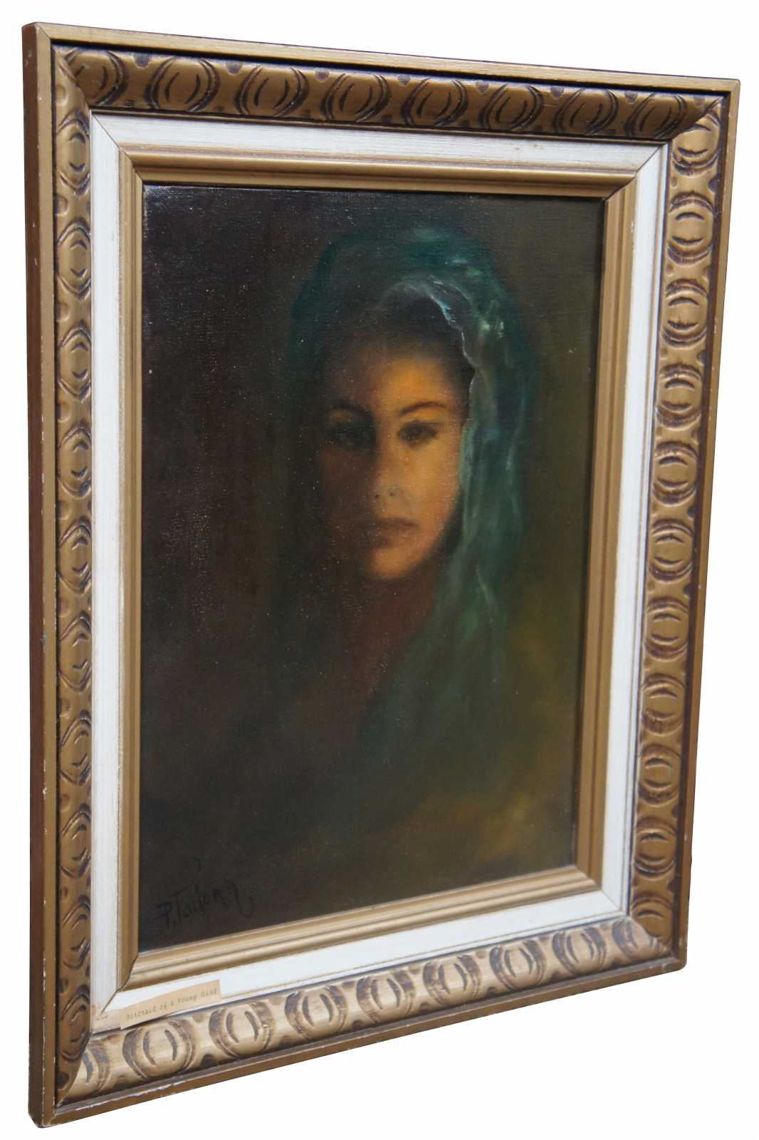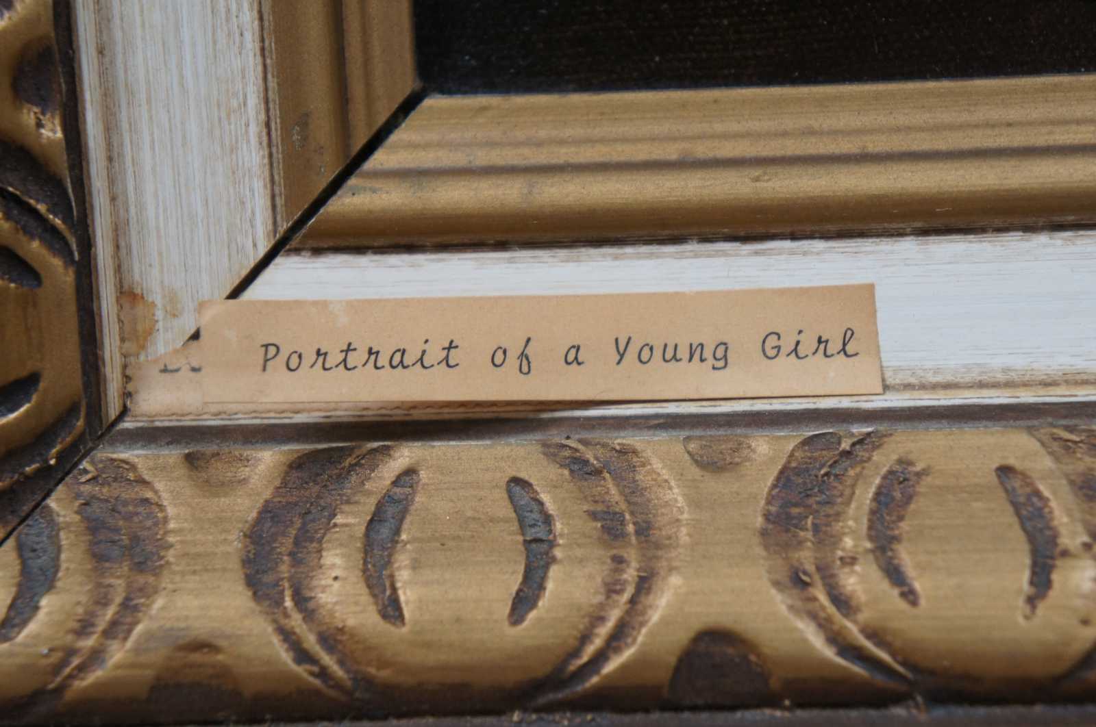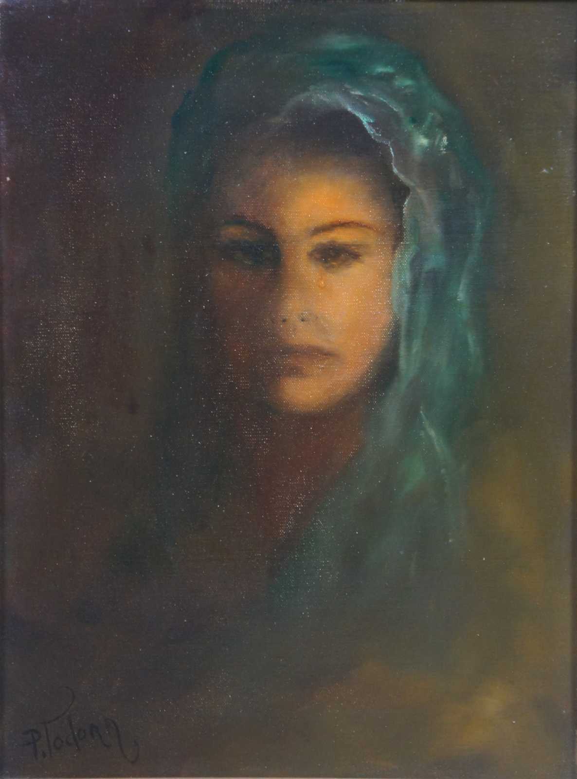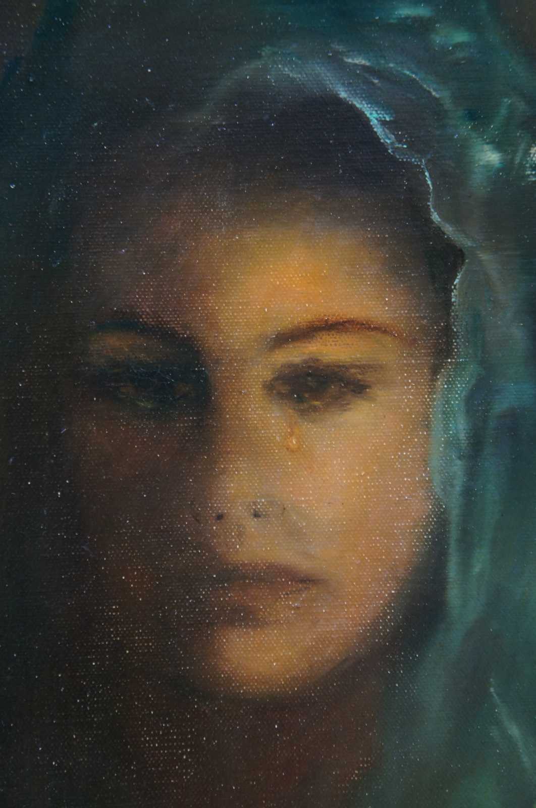 Vintage Giclee print on canvas titled “Portrait of a Young Girl” and signed P. Todora showing a young woman with a tear on her cheek and wearing a teal veil.